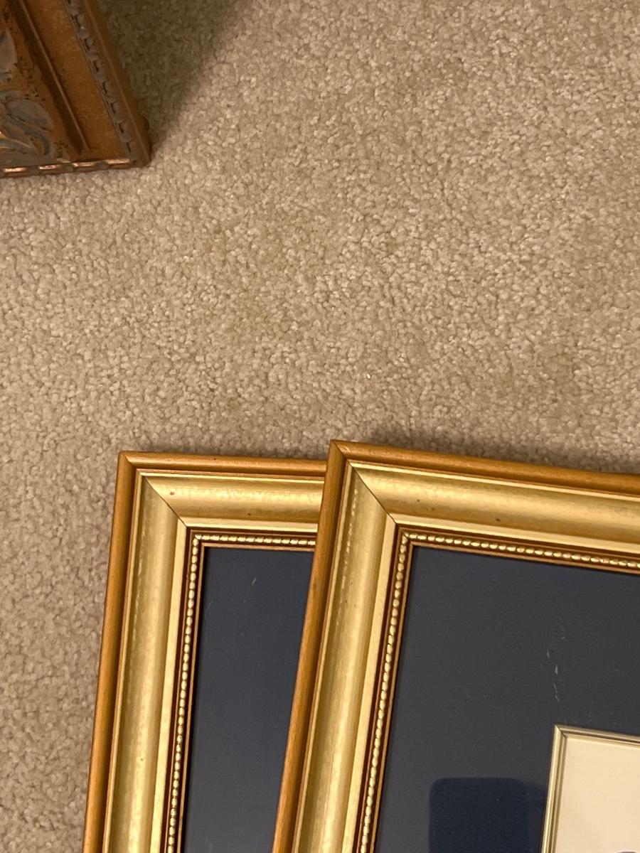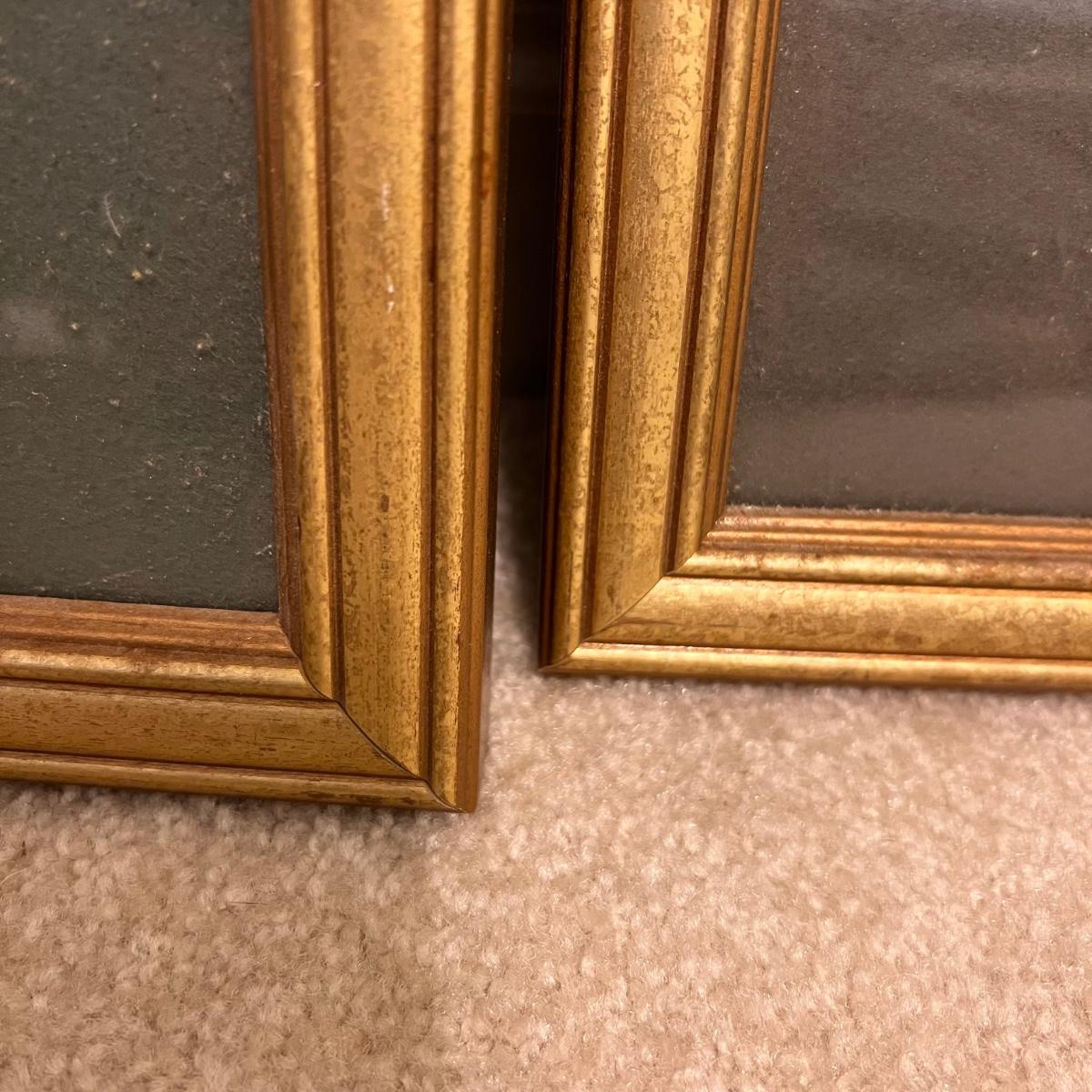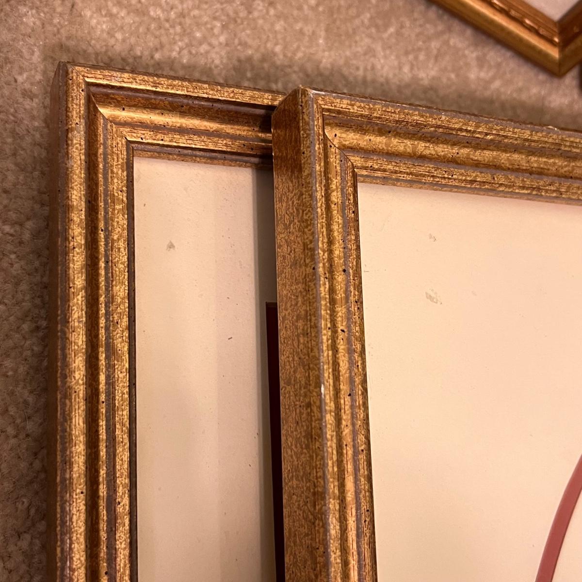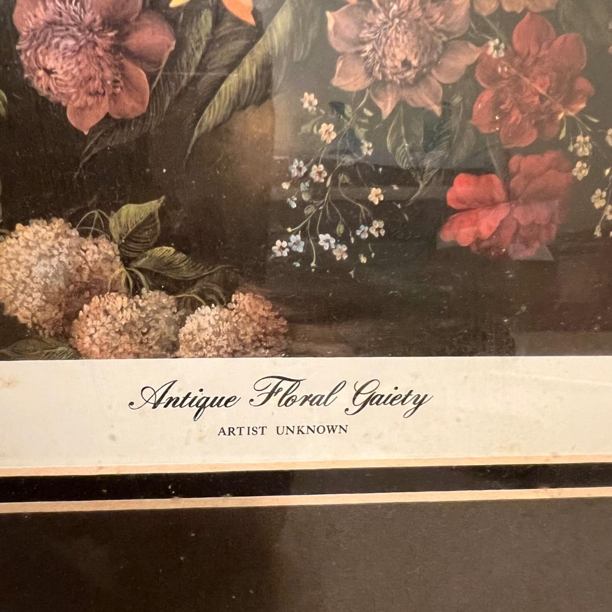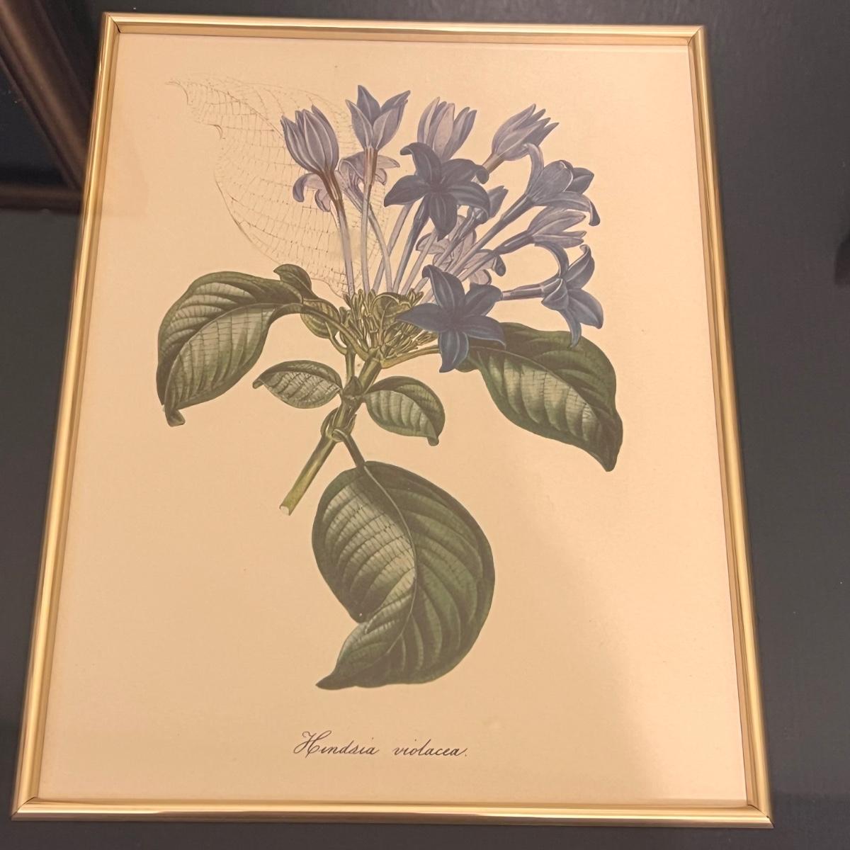 Six pairs of floral framed art for a total of twelve. All prints are under glass, matted and mounted in wooden frames with a gilded finish. Any white markings on glass are just sticker residue and should be easy to remove. The tallest frames measure 9.5” x 21.5”H.