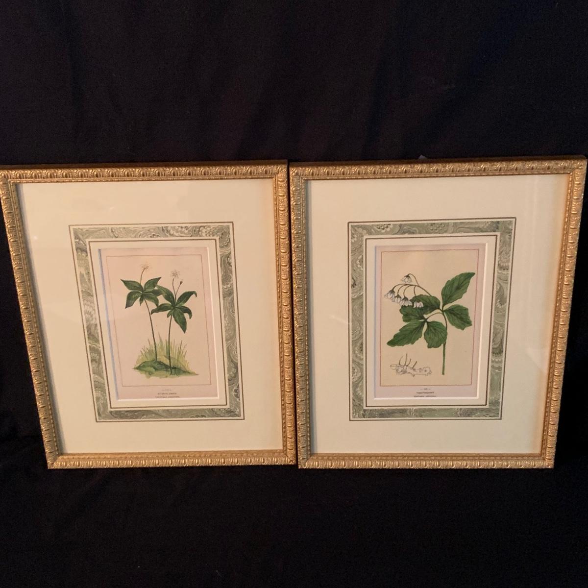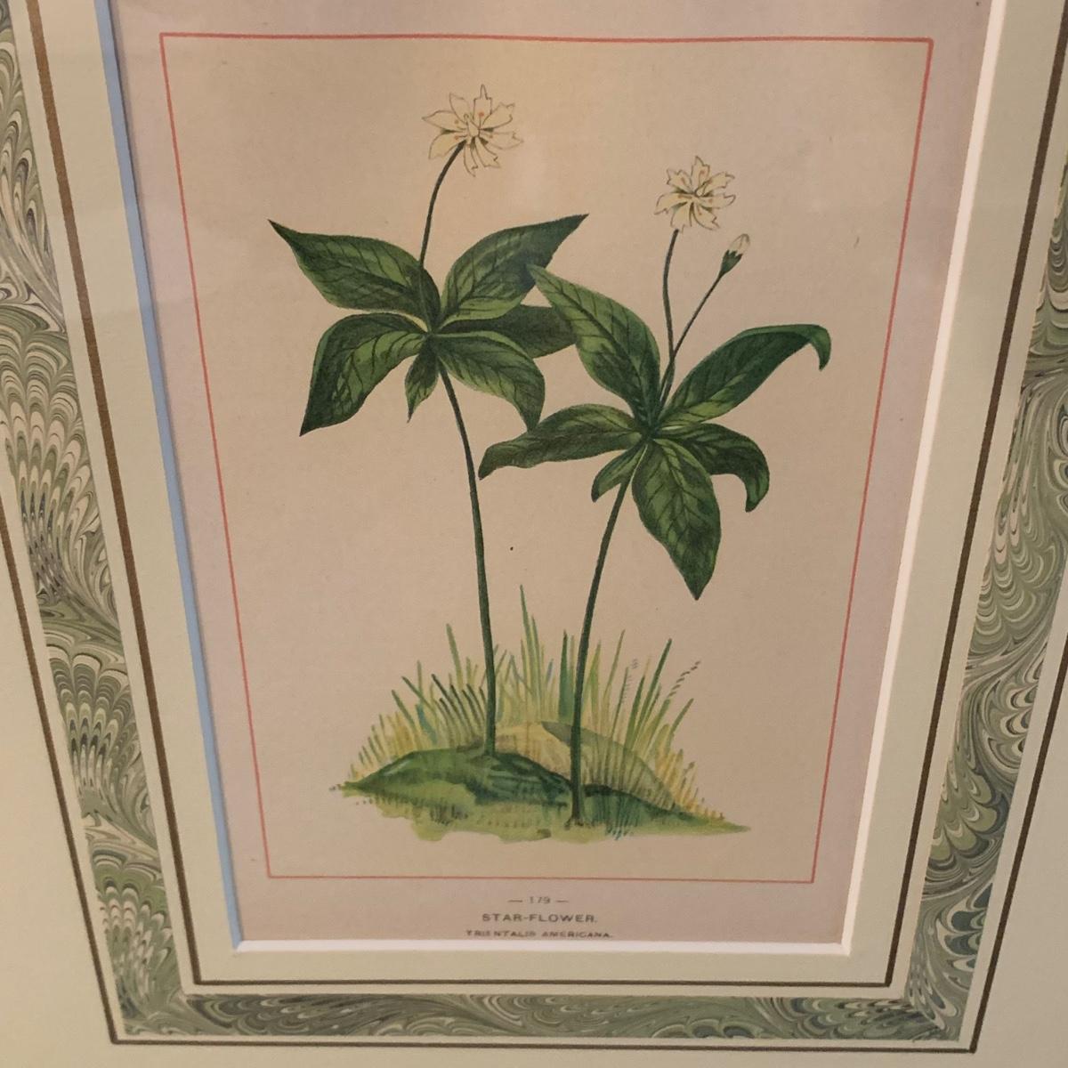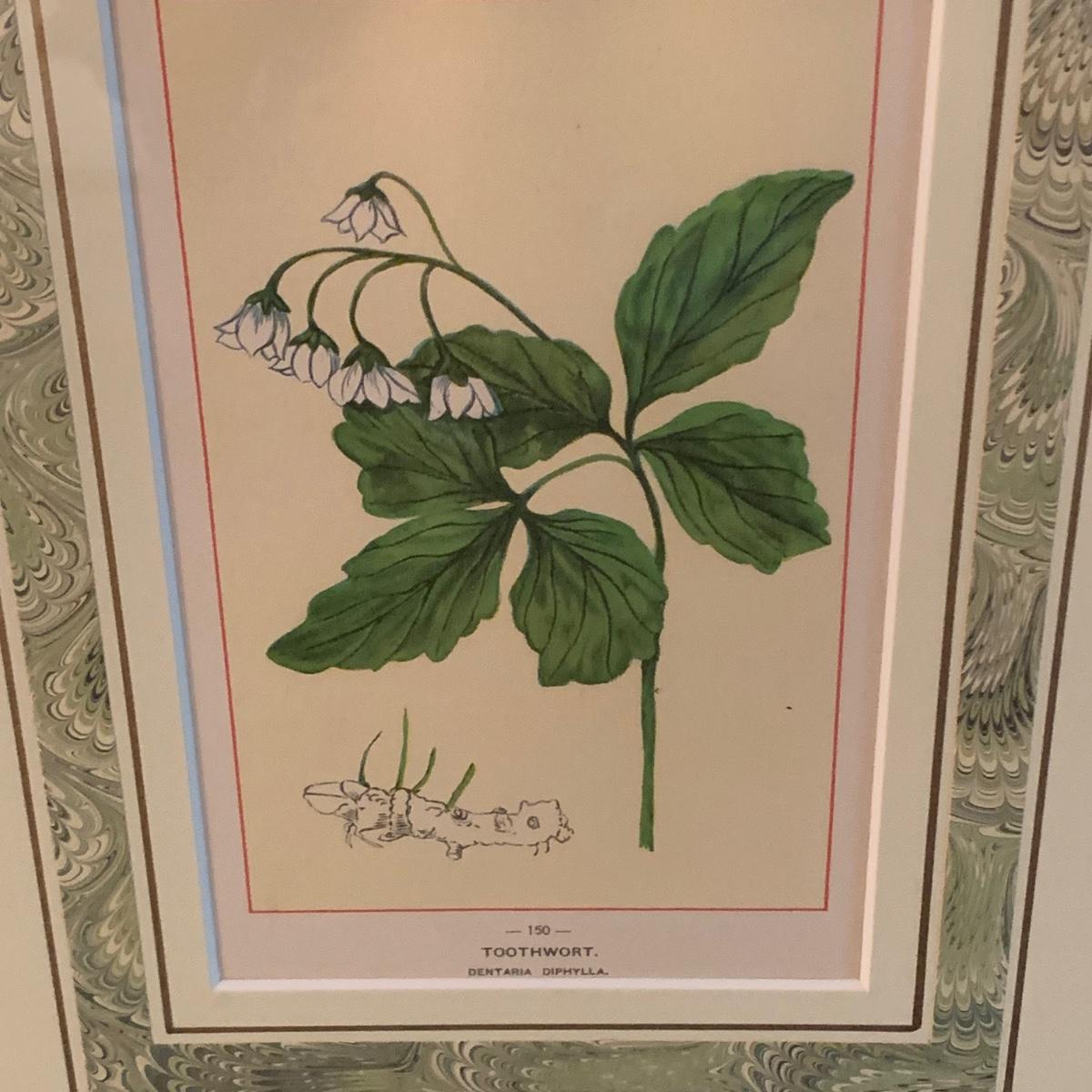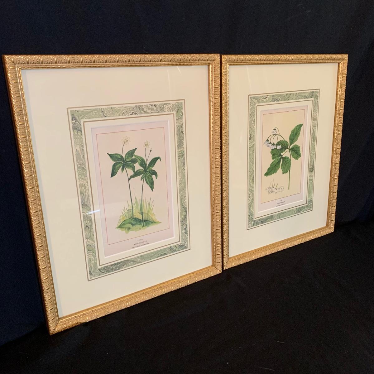 Two framed botanical prints of Toothwort and Star Flower by Homestyle Co. Framed behind glass in carved wooden frames. Frames measure approximately 11.5" x 14.5"H.