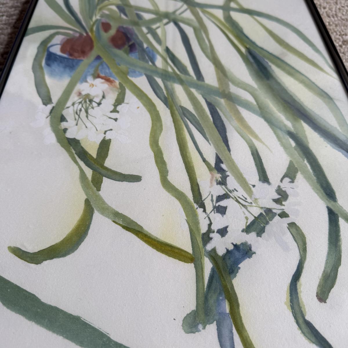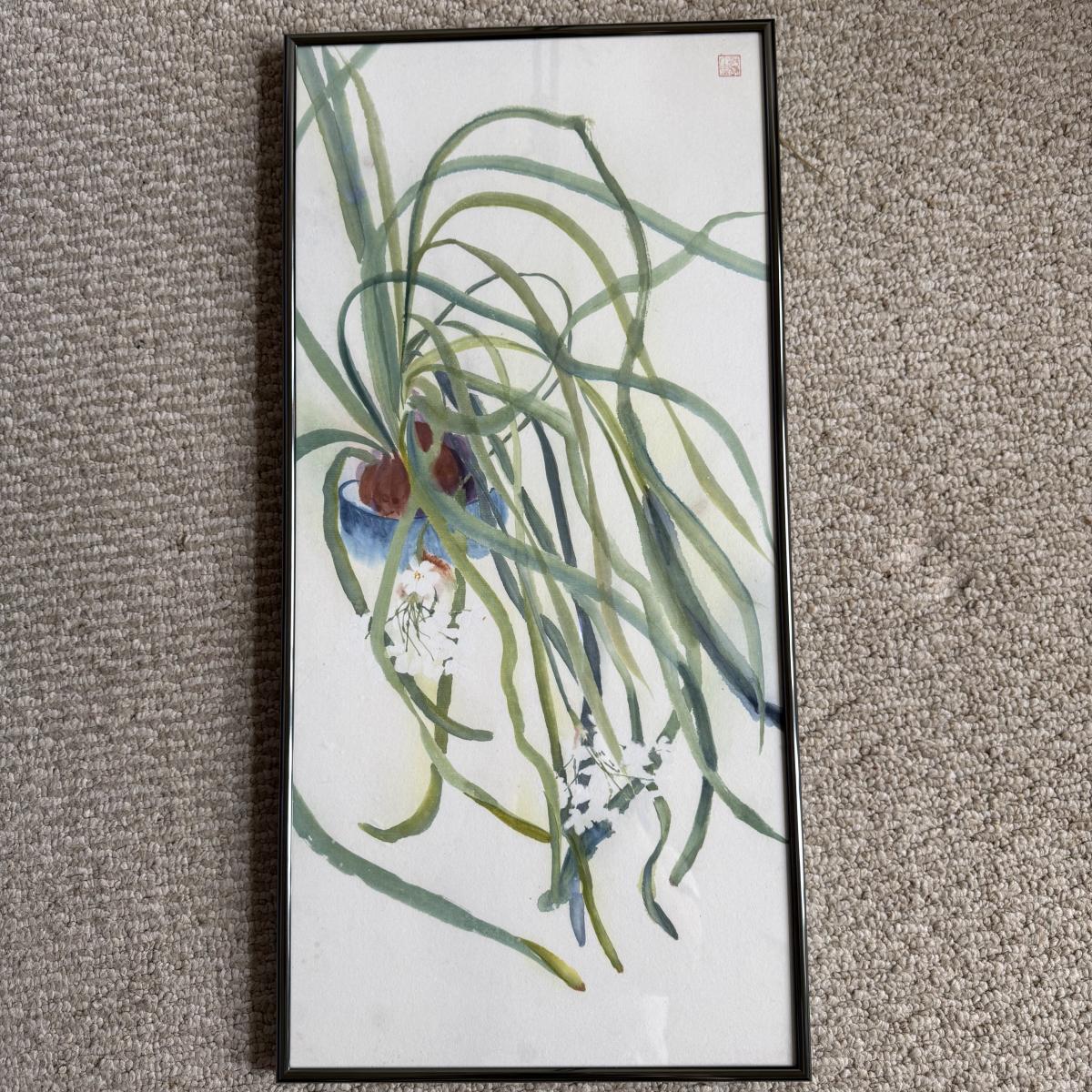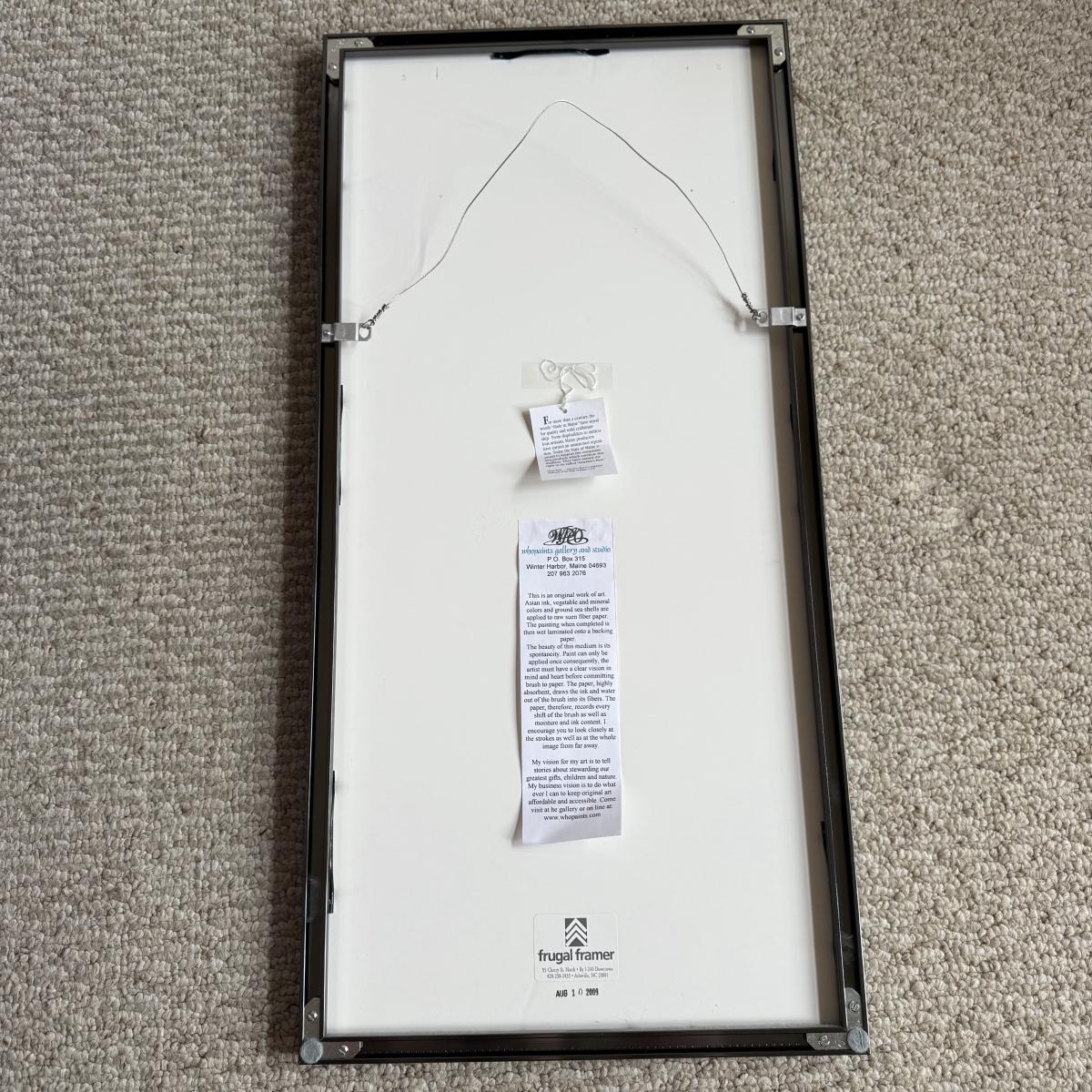 This lot contains a framed abstract what appears to be watercolor of a plant with white flowers. The painting sits behind glass in a silver metal frame. There is a small symbol in the top right corner. This item measures 13” x 27” and has hardware to be hung. There is some literature attached to the back stating this item is from Maine and a bit about the style of art, see pictures for details. Shipping available.