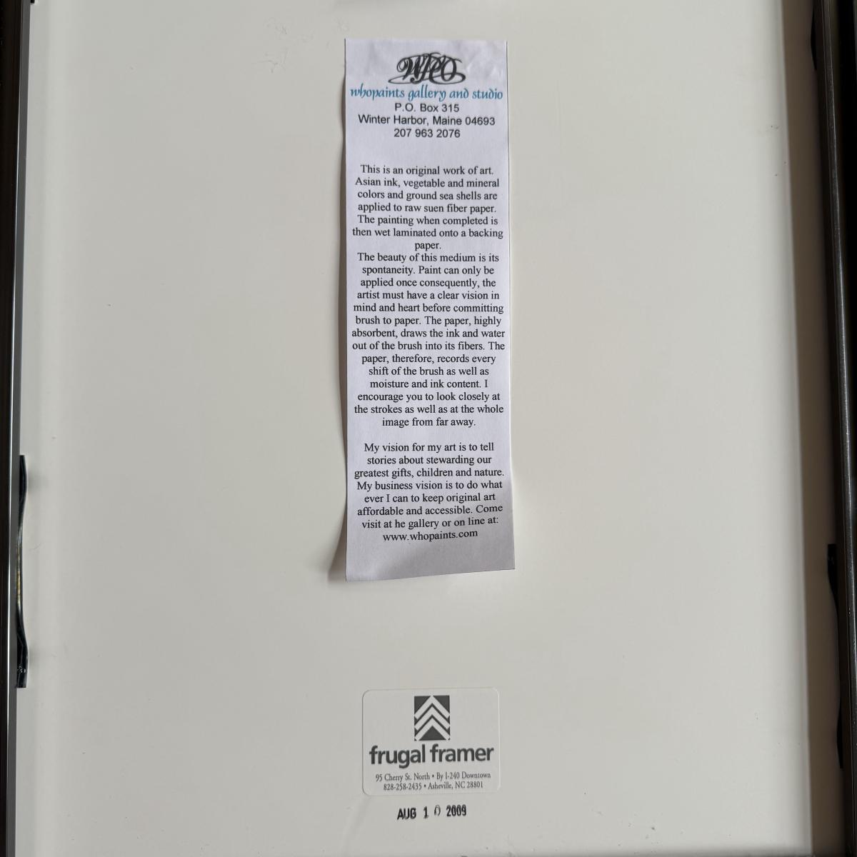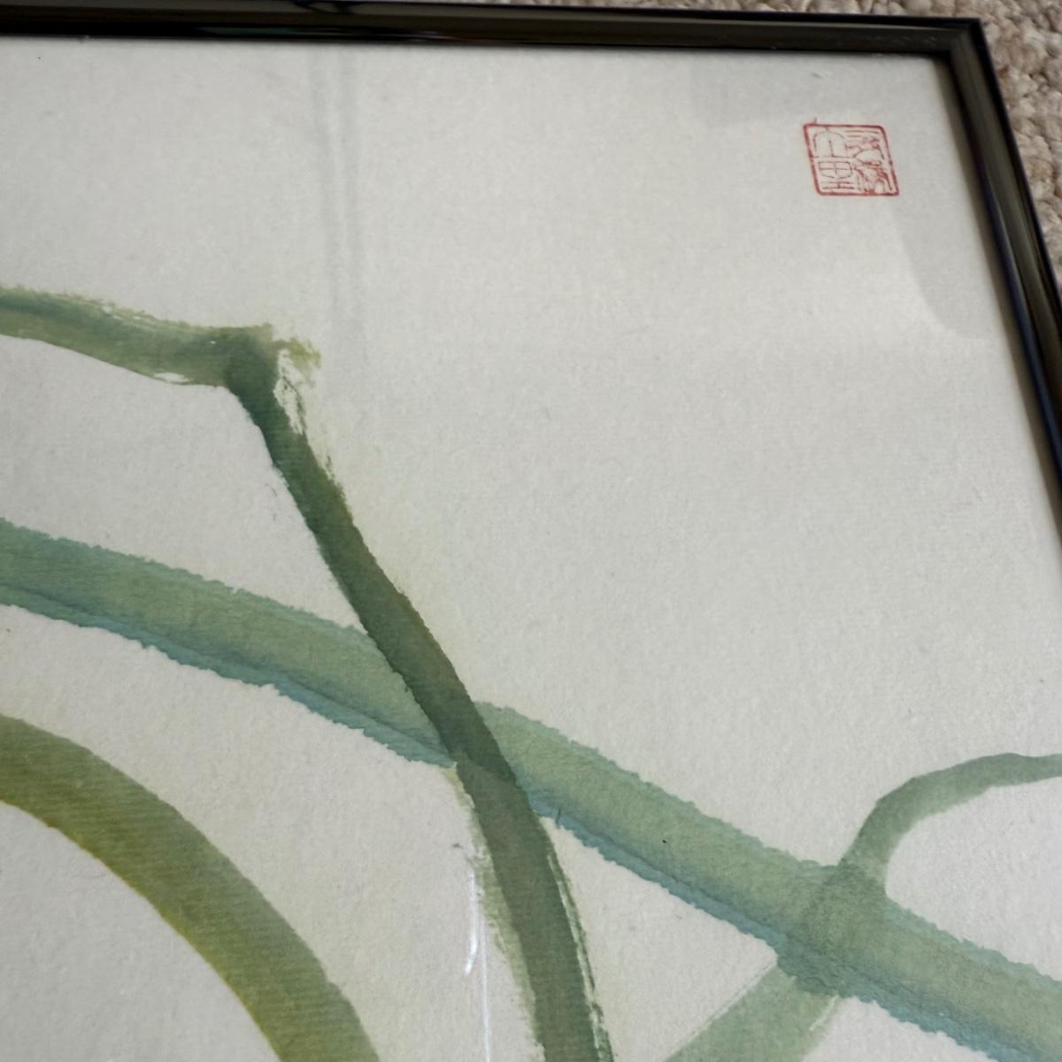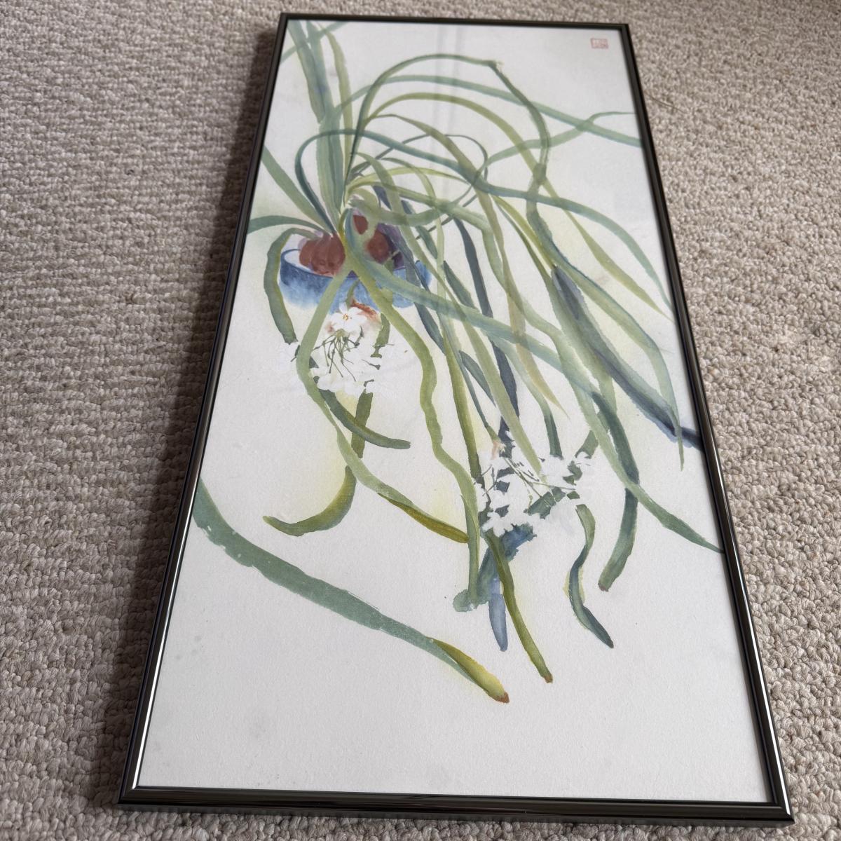 This lot contains a framed abstract what appears to be watercolor of a plant with white flowers. The painting sits behind glass in a silver metal frame. There is a small symbol in the top right corner. This item measures 13” x 27” and has hardware to be hung. There is some literature attached to the back stating this item is from Maine and a bit about the style of art, see pictures for details. Shipping available.