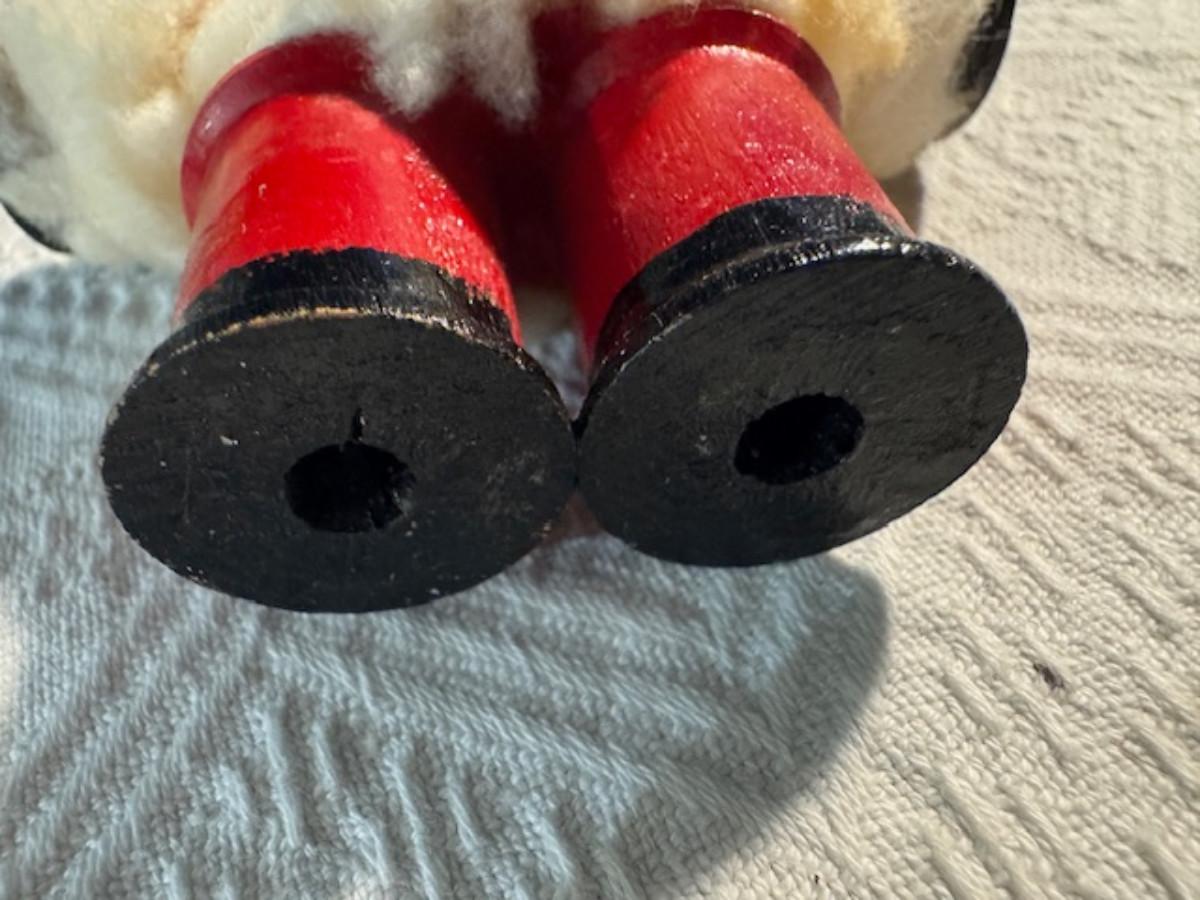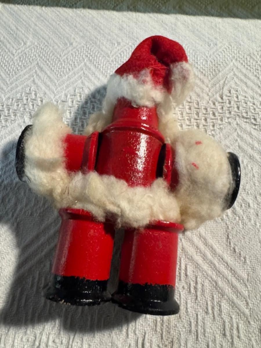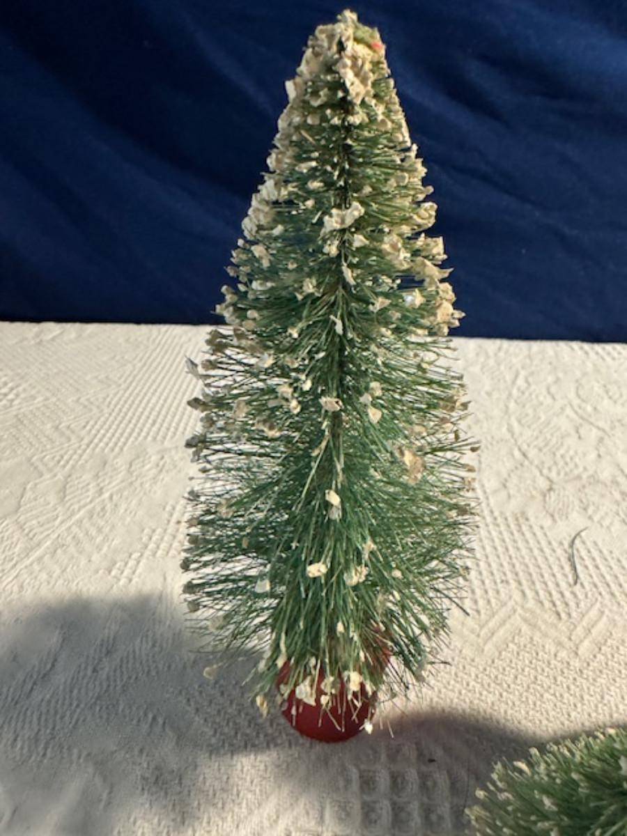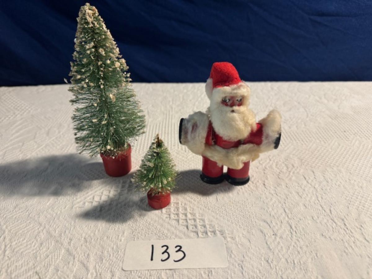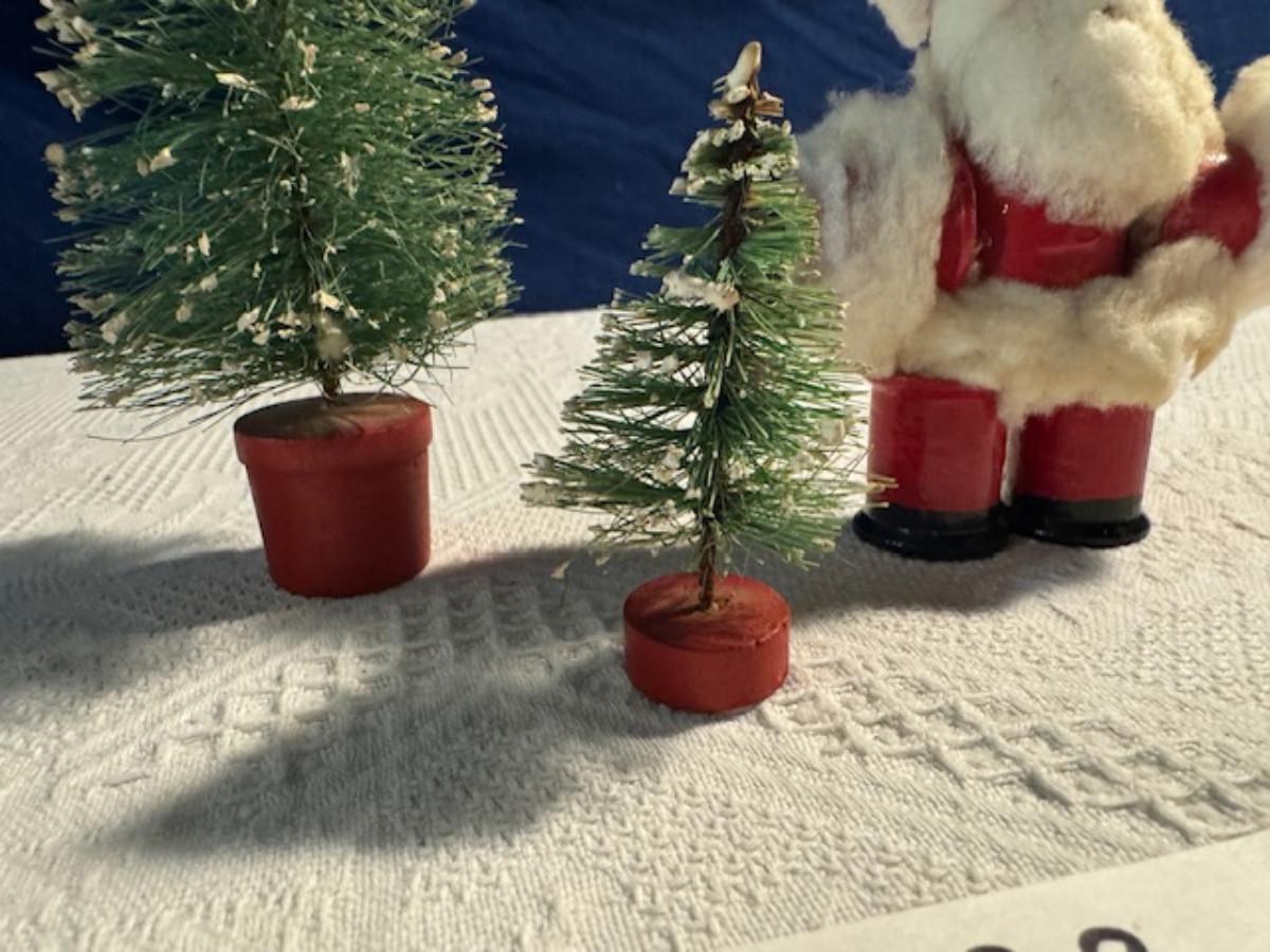 2 Vintage bottle brush trees and wooden thread bobbin Santa as found see pics.