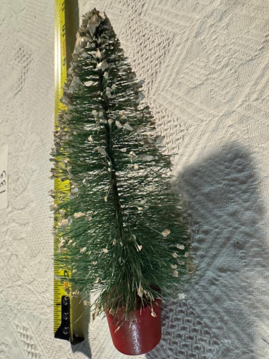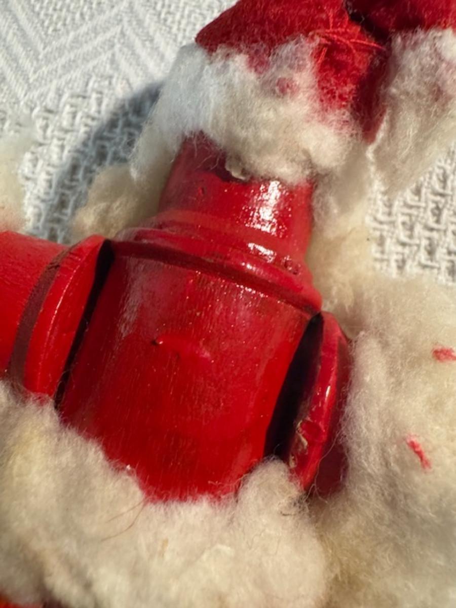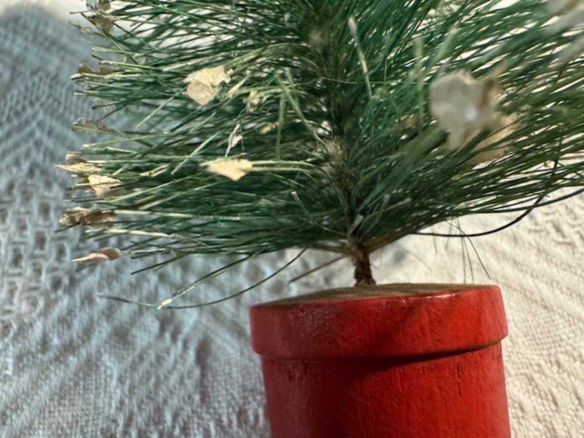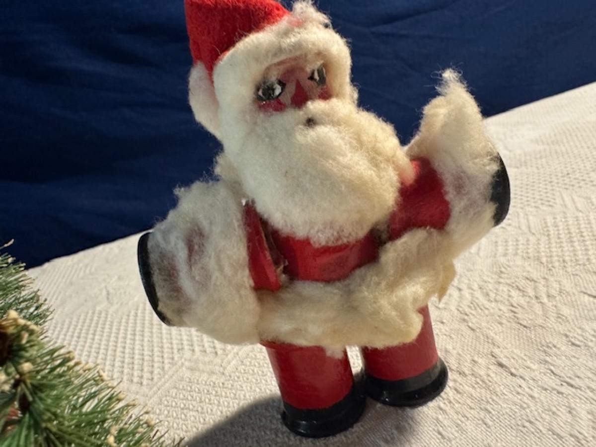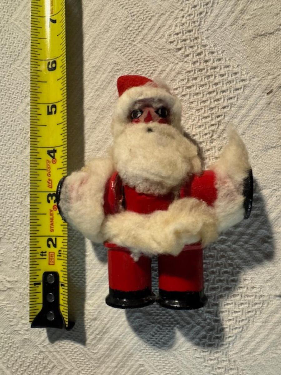 2 Vintage bottle brush trees and wooden thread bobbin Santa as found see pics.