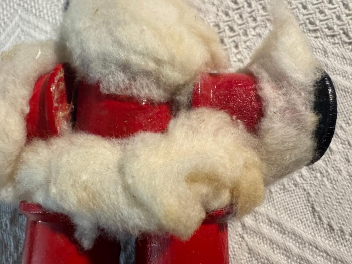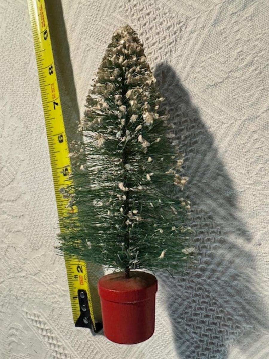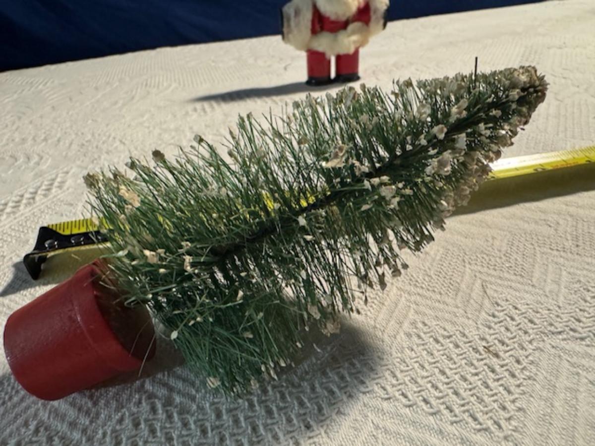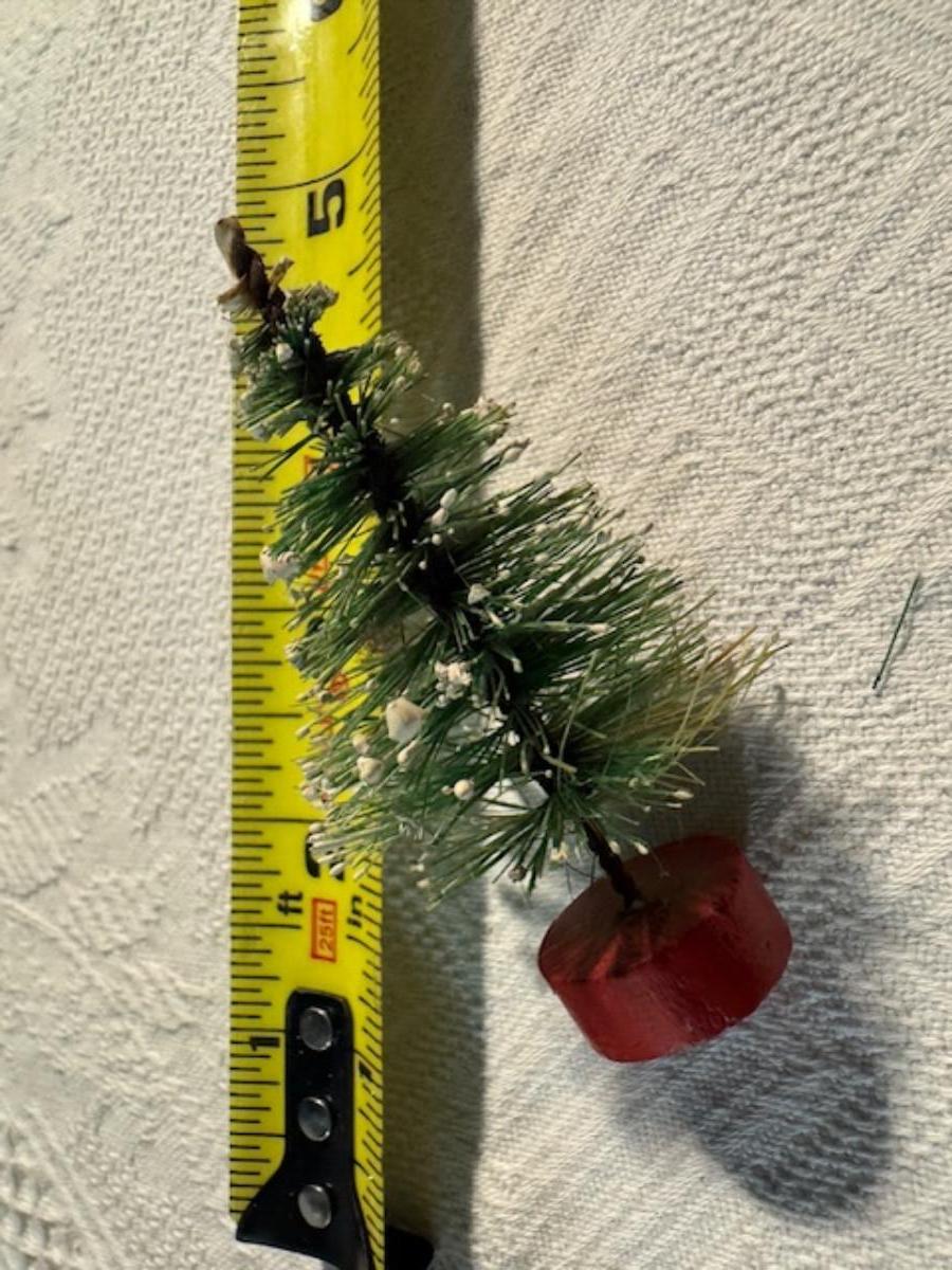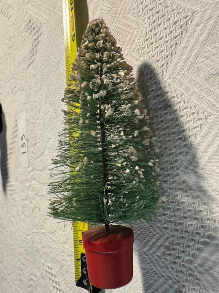 2 Vintage bottle brush trees and wooden thread bobbin Santa as found see pics.