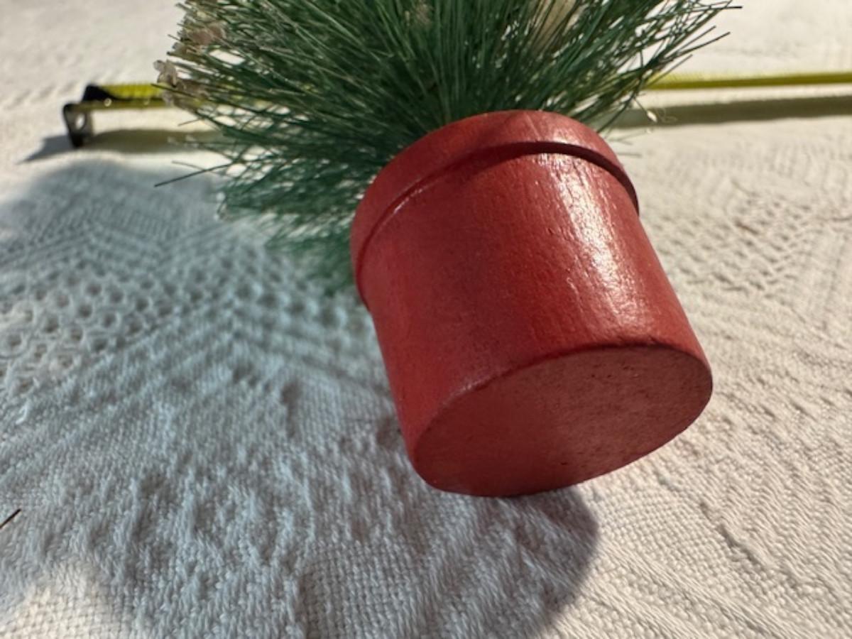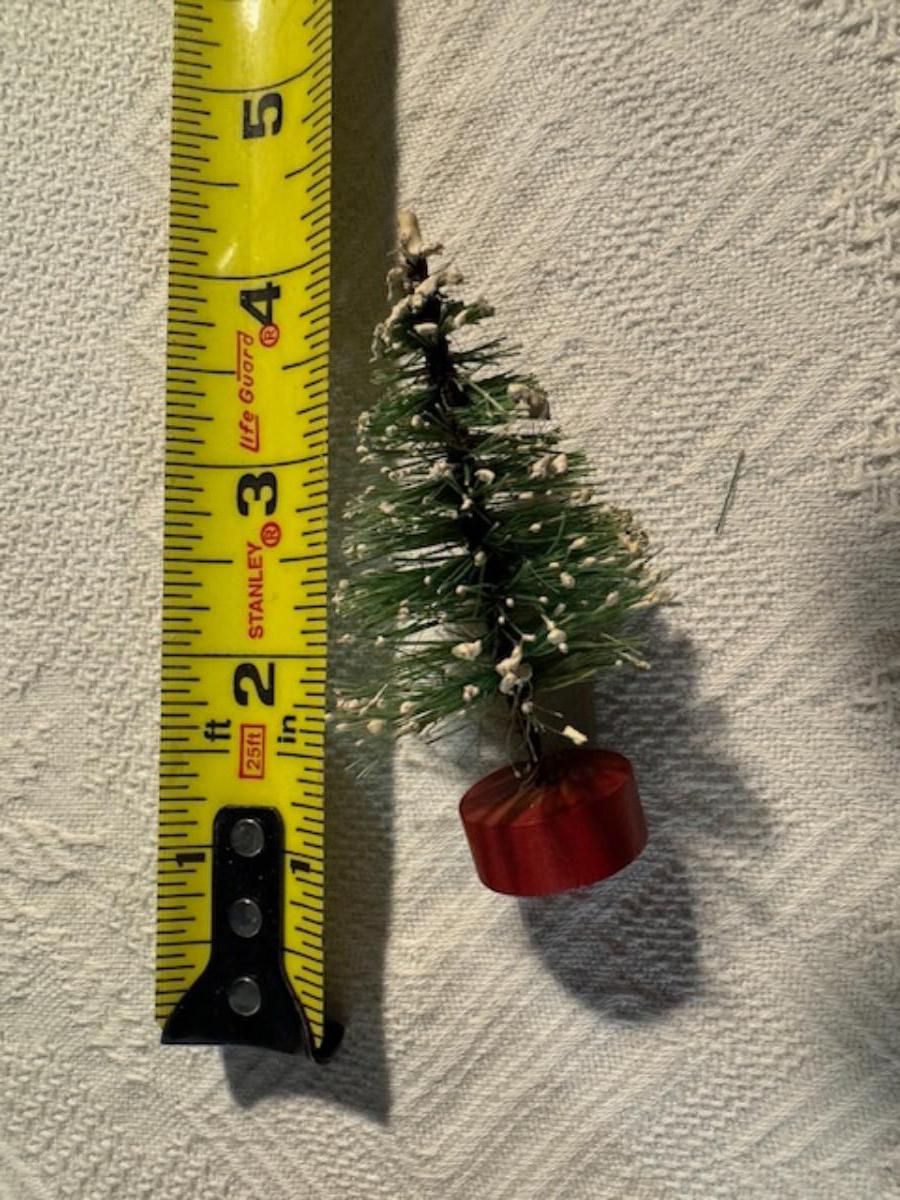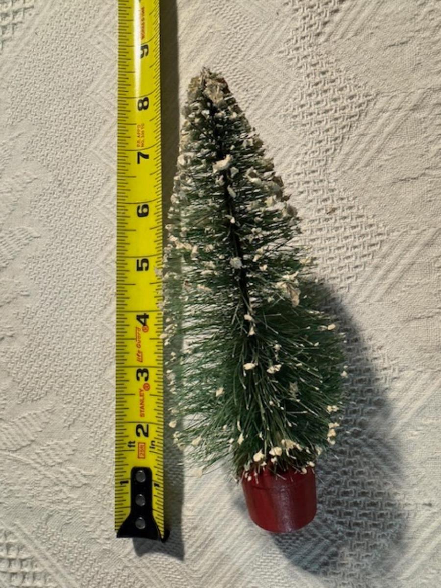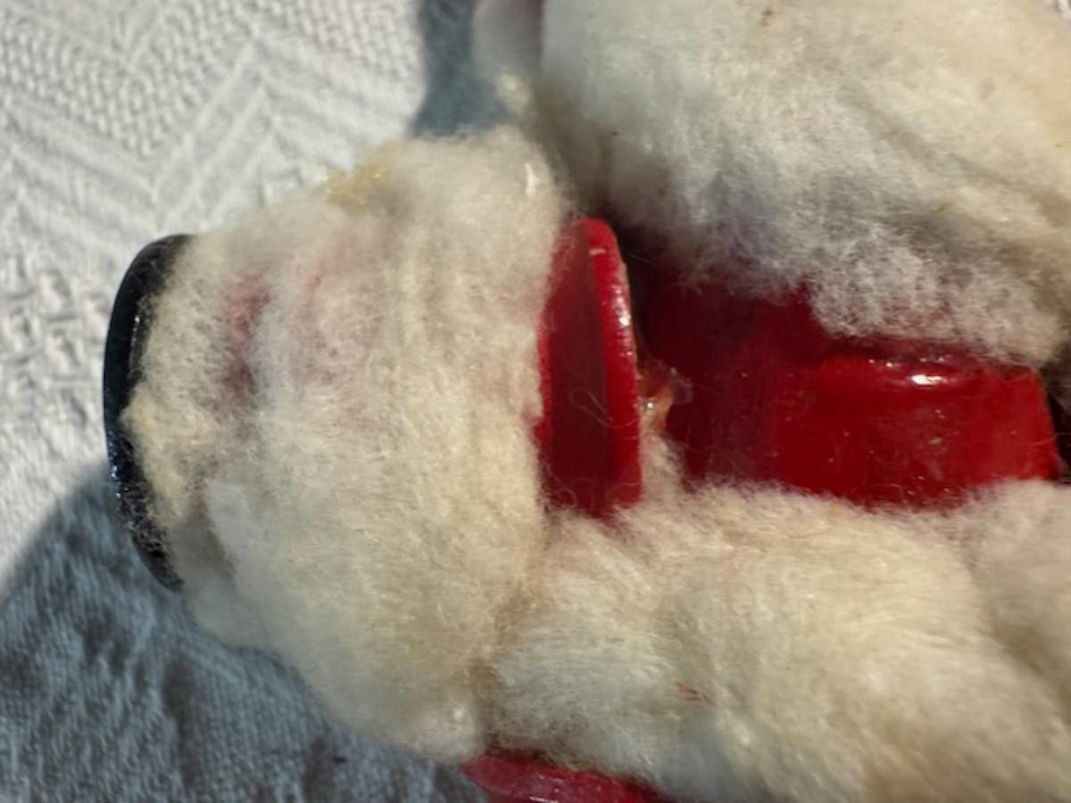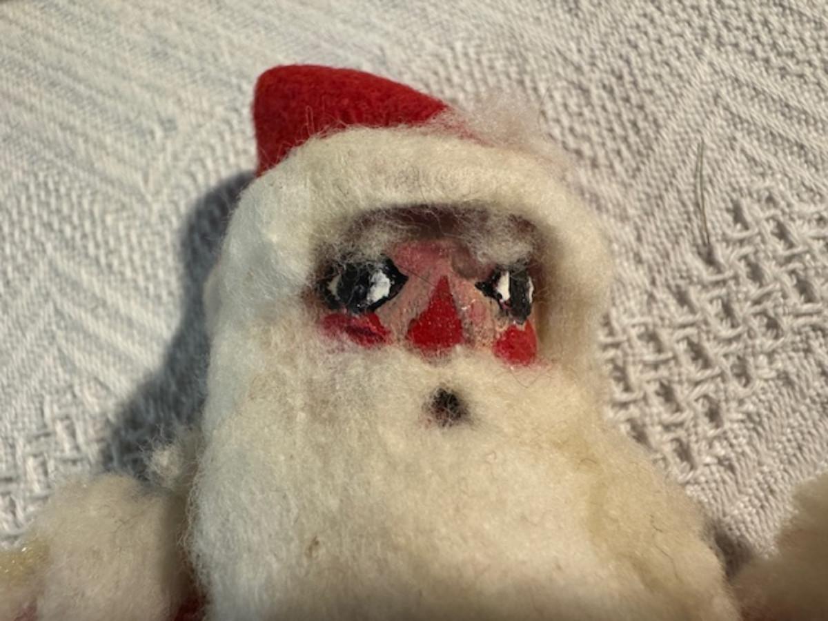 2 Vintage bottle brush trees and wooden thread bobbin Santa as found see pics.