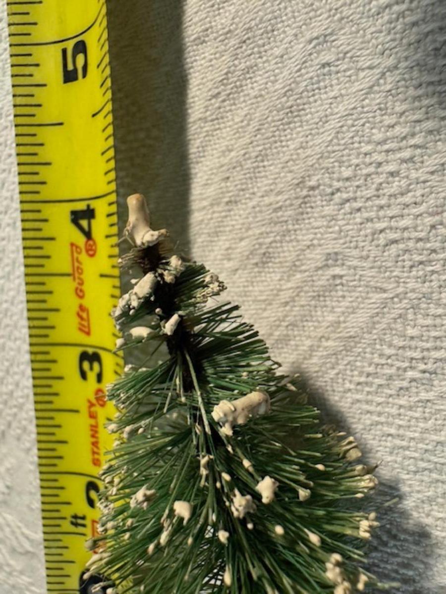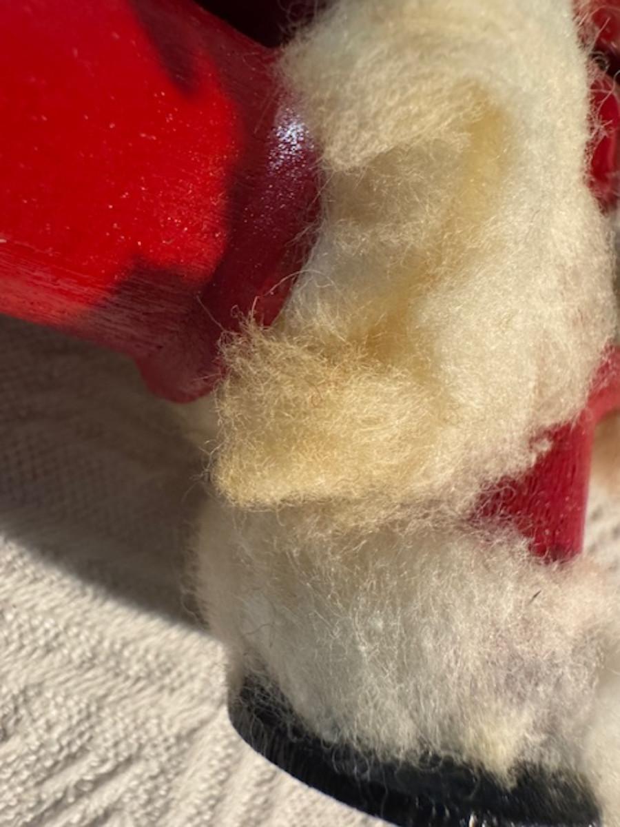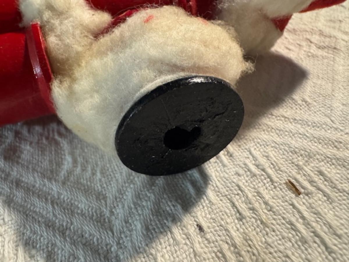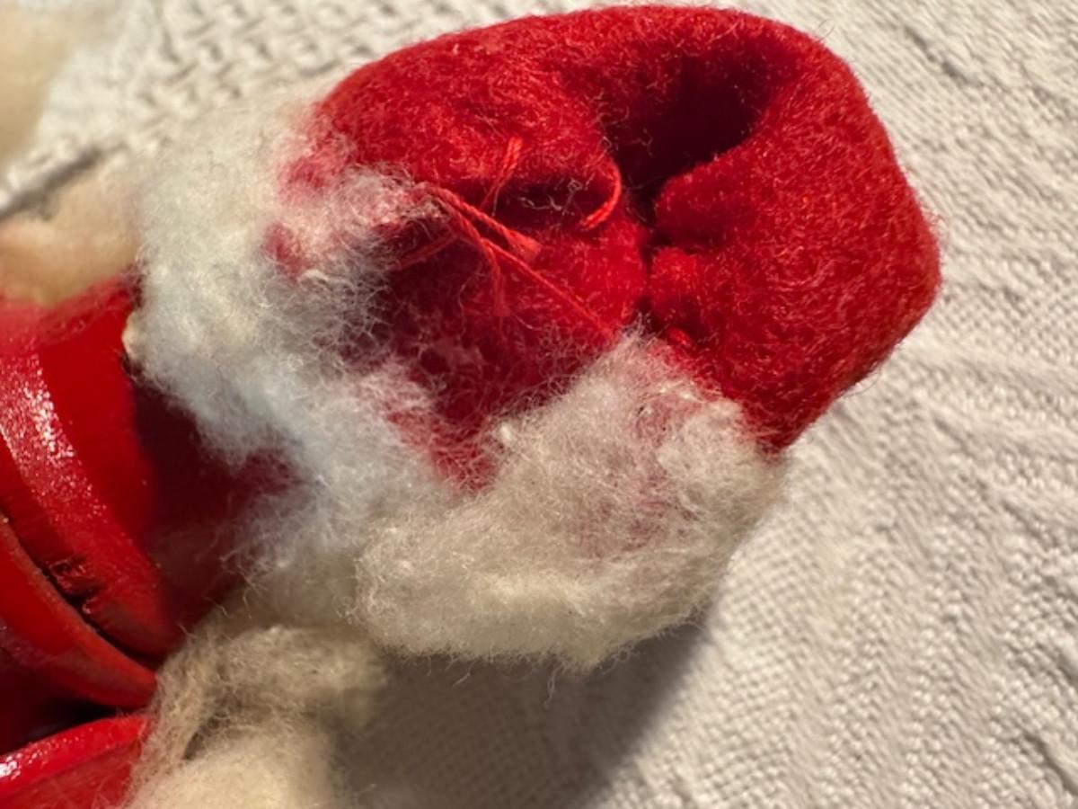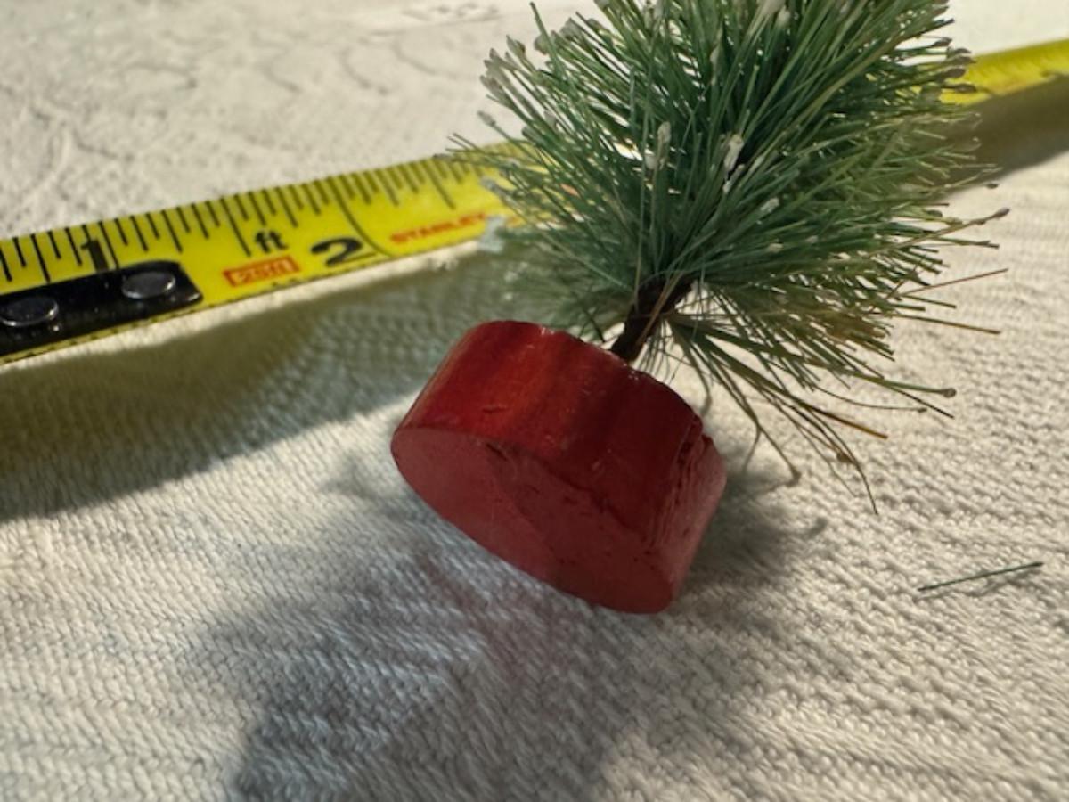 2 Vintage bottle brush trees and wooden thread bobbin Santa as found see pics.