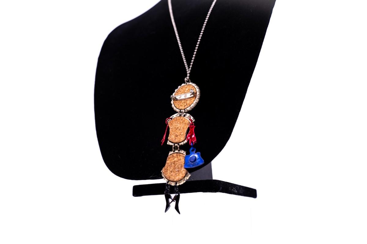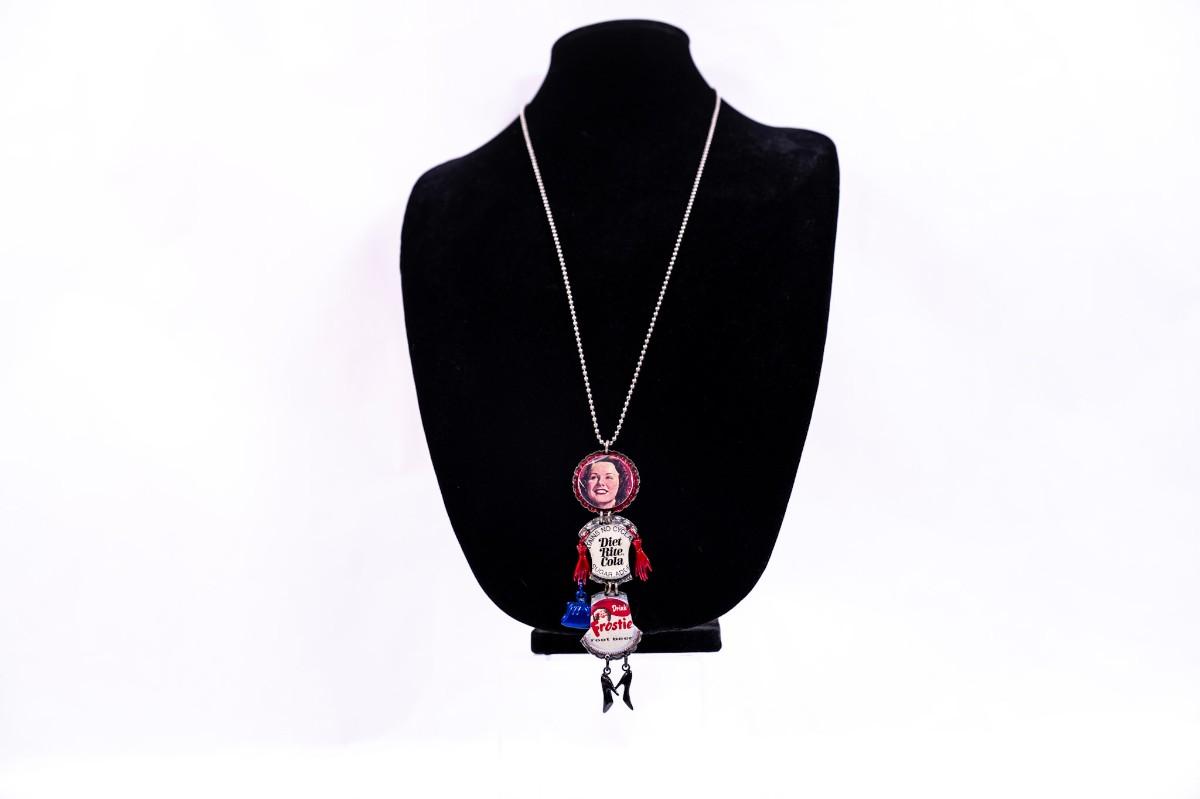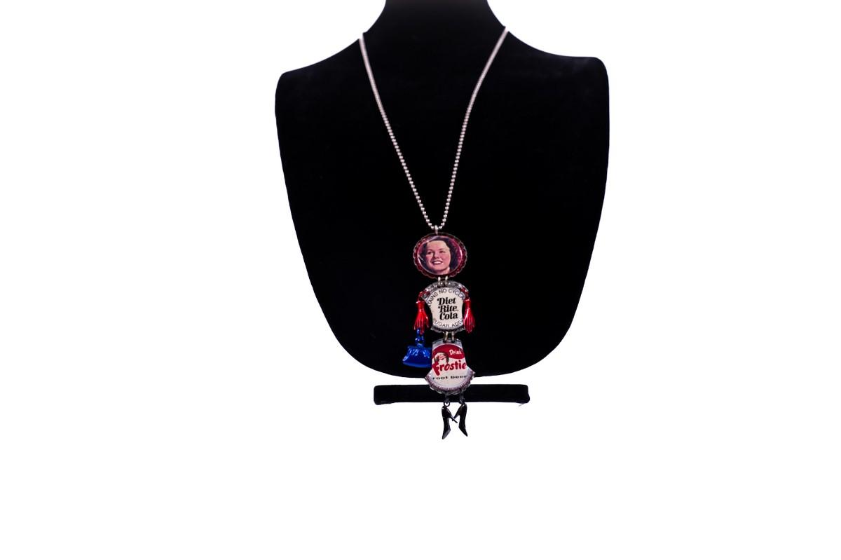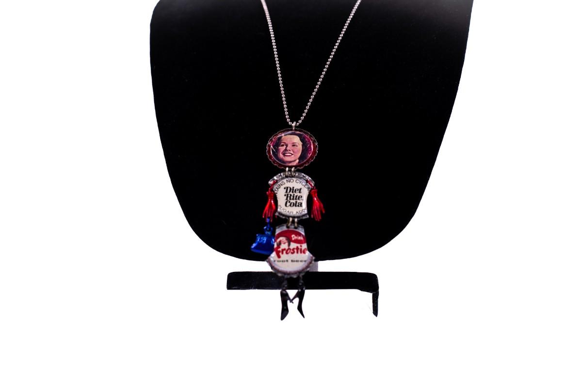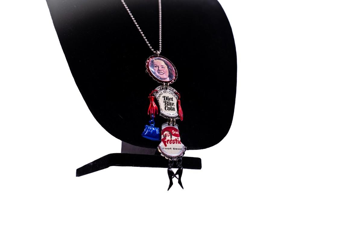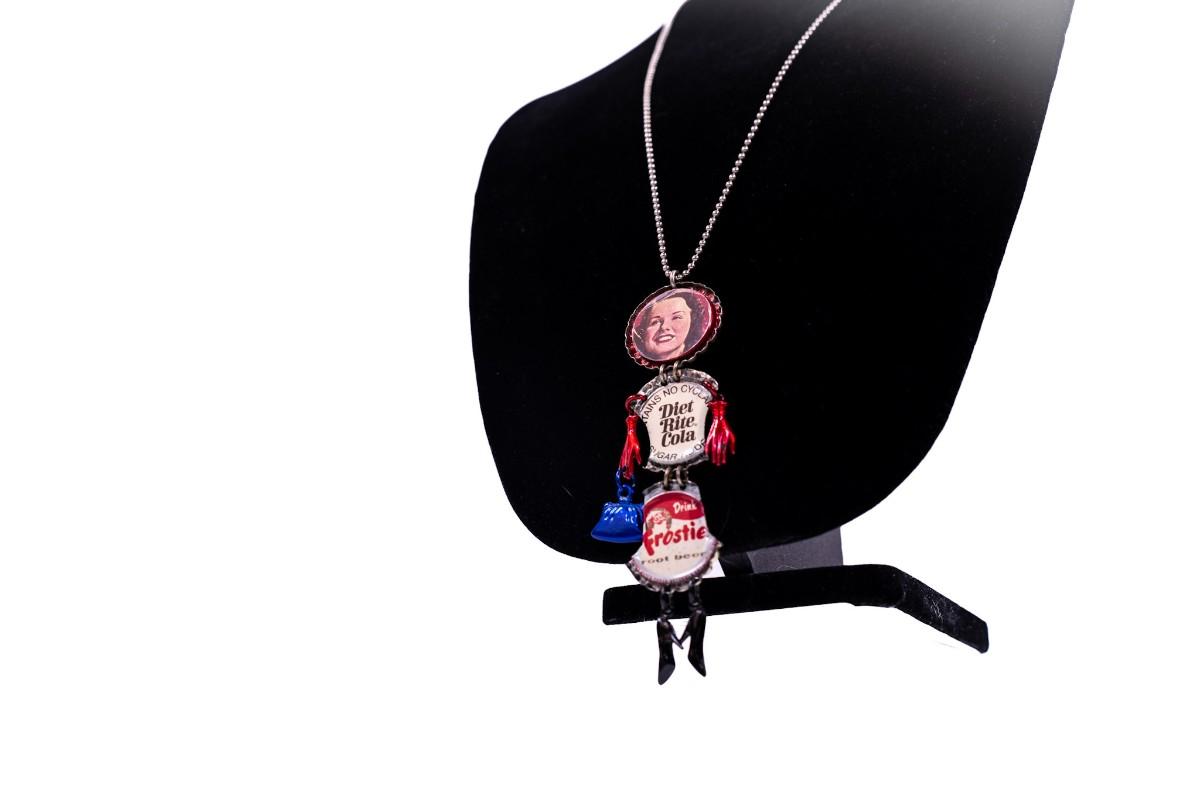 This is a handmade novelty necklace made from vintage Pabt Blue Ribbon and Frostie Root Beer bottle caps. Its features a figural design resembling a person, with the bottle caps forming the body and painted metal pieces for the limbs.