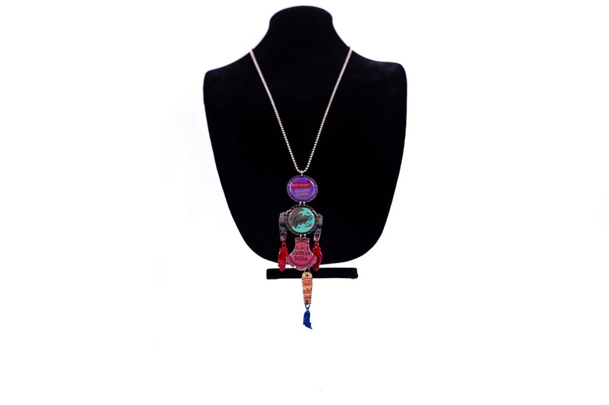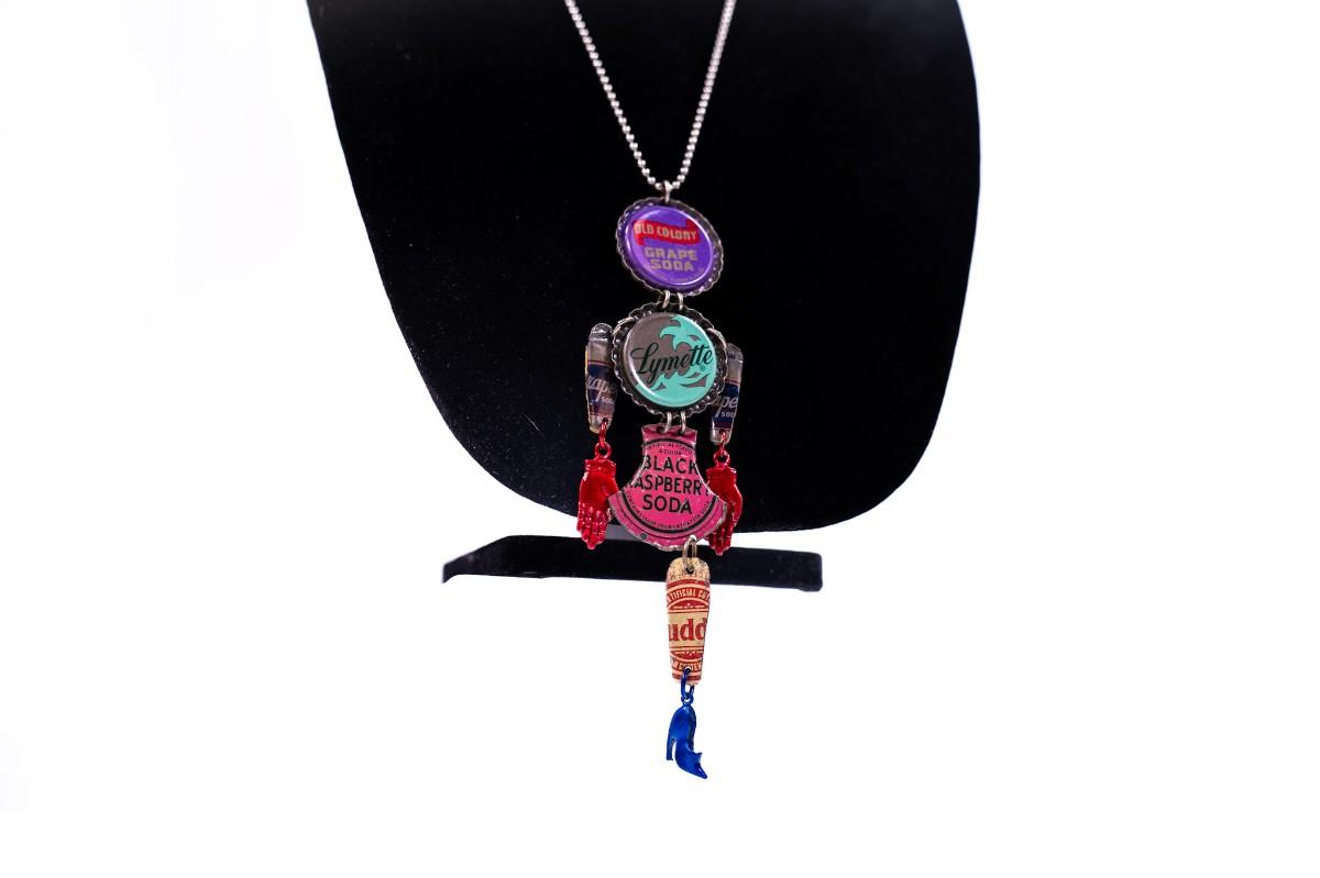 This is an upcycled, industrial- inspired bottle cap necklace featuring various soda bottle caps, including "Old Colony Grape Soda,' "Lymette," and "Black".