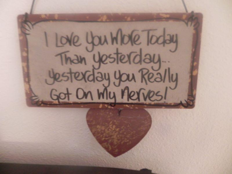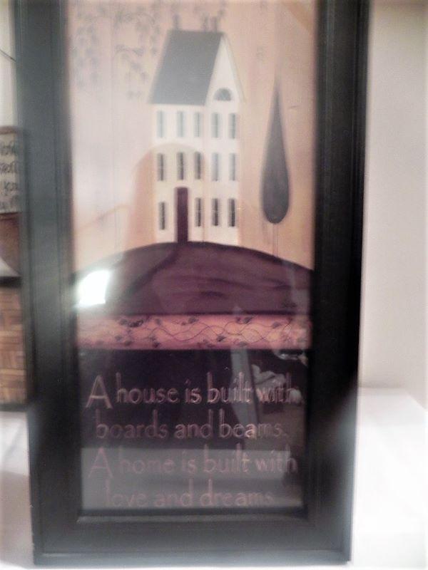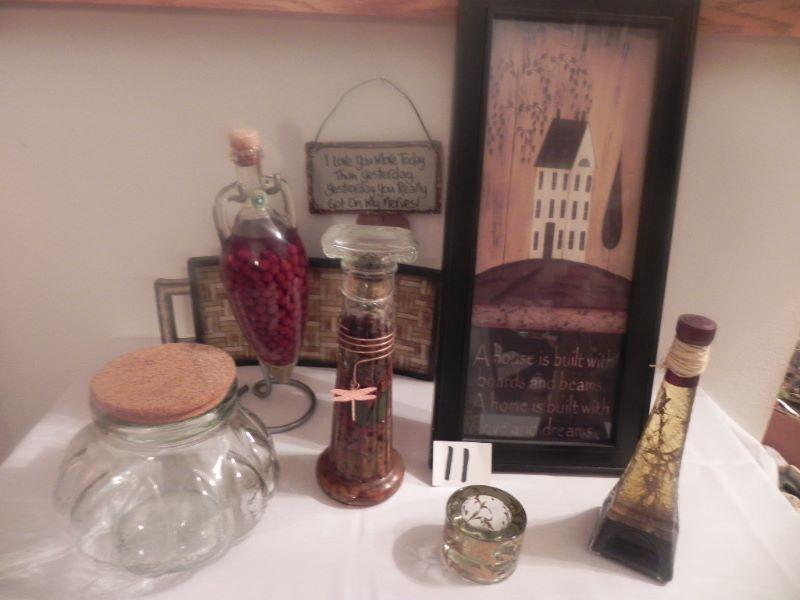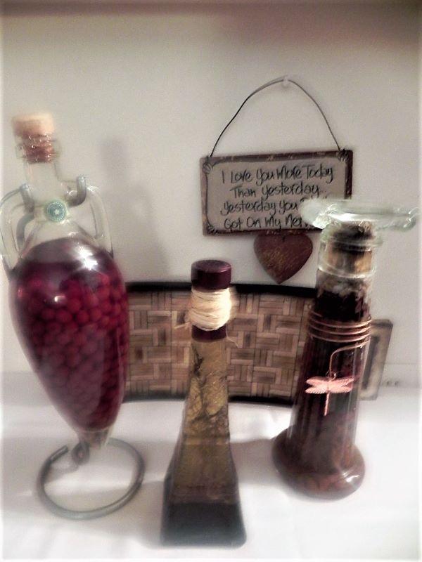 Filled décor bottles, glass container w/cork lid, candle holder, hanging signs, and Mosaic tray.