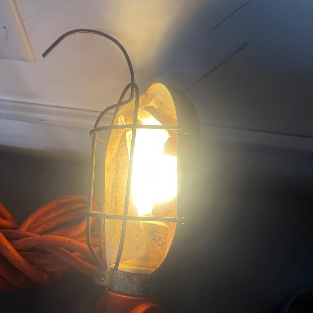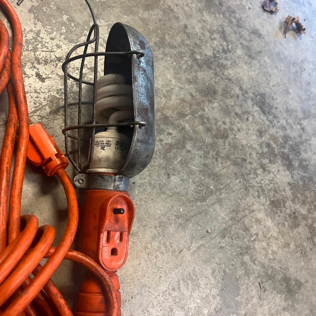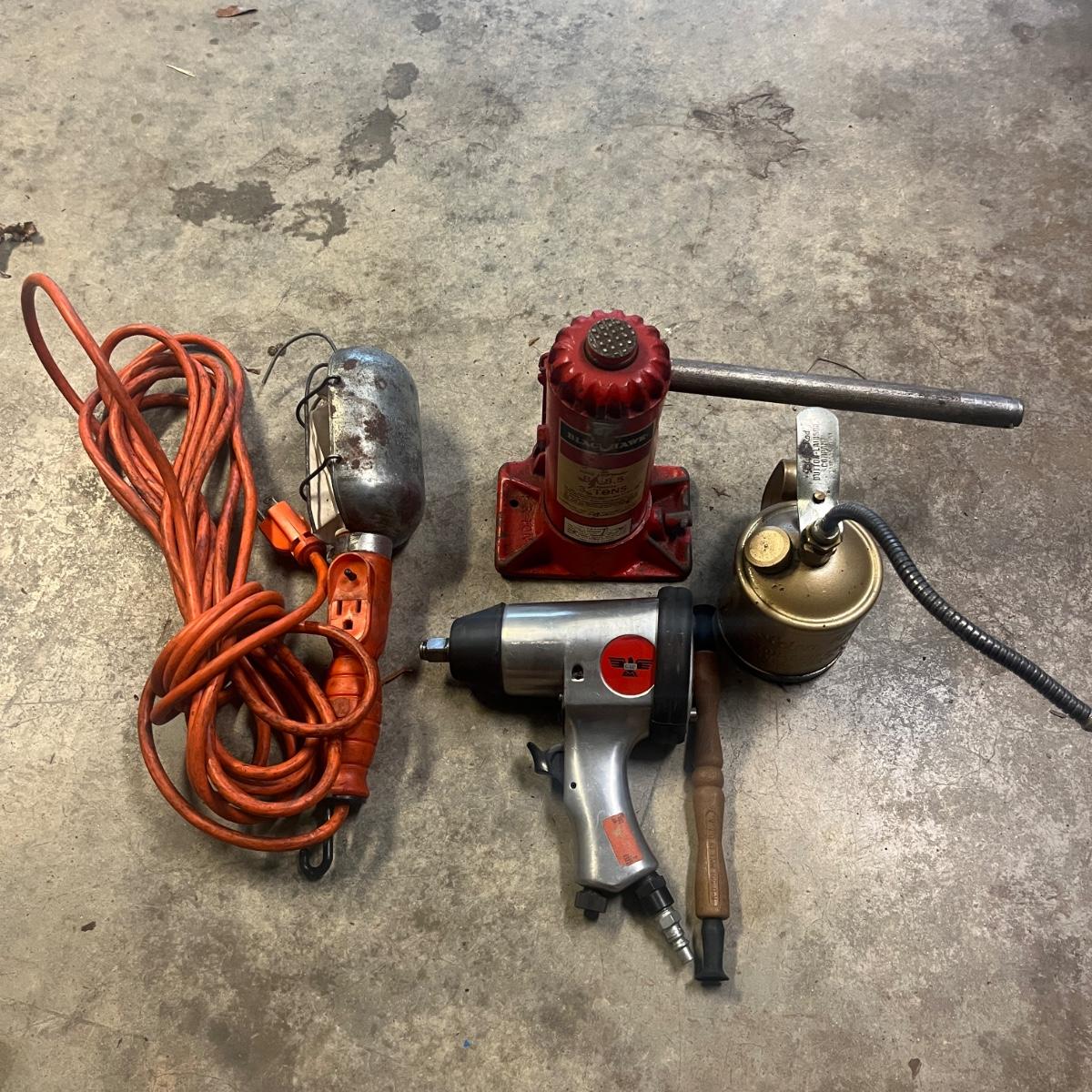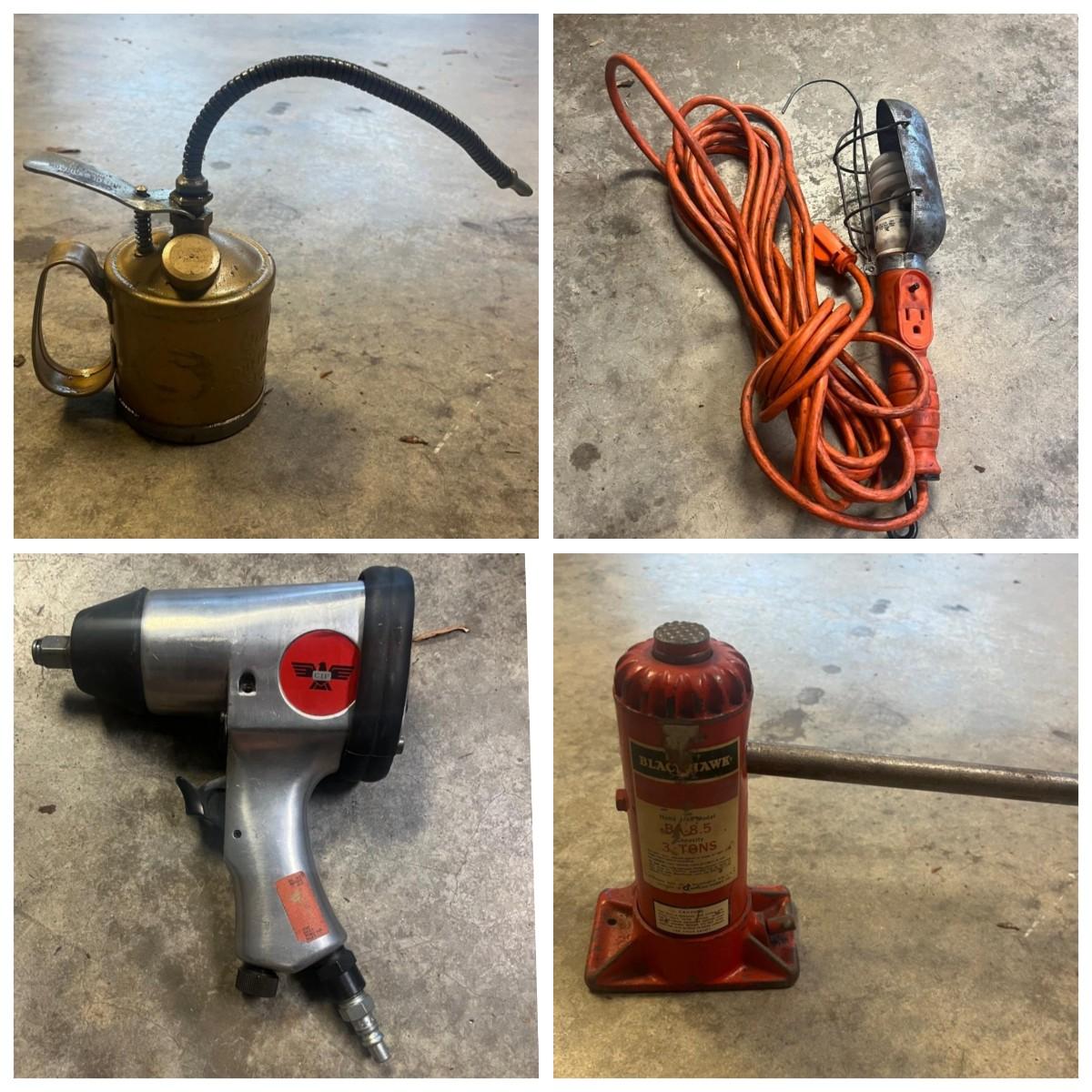 Lot includes a three ton bottle jack, GoldenRod metal oil can, 1/2” drive impact wrench, drop light and a valve lapping tool. Light powered on when plugged in.
