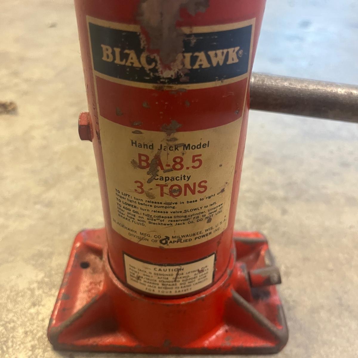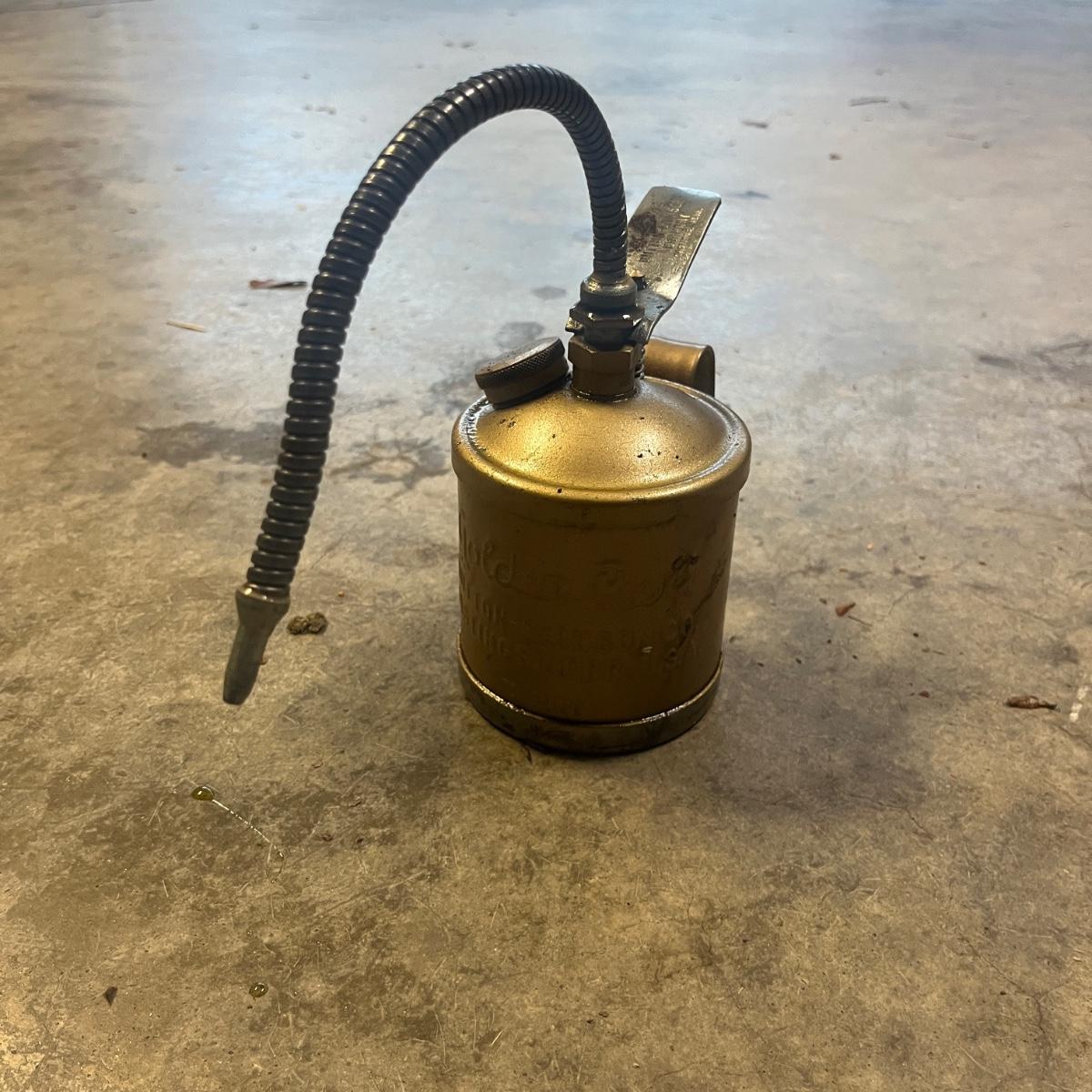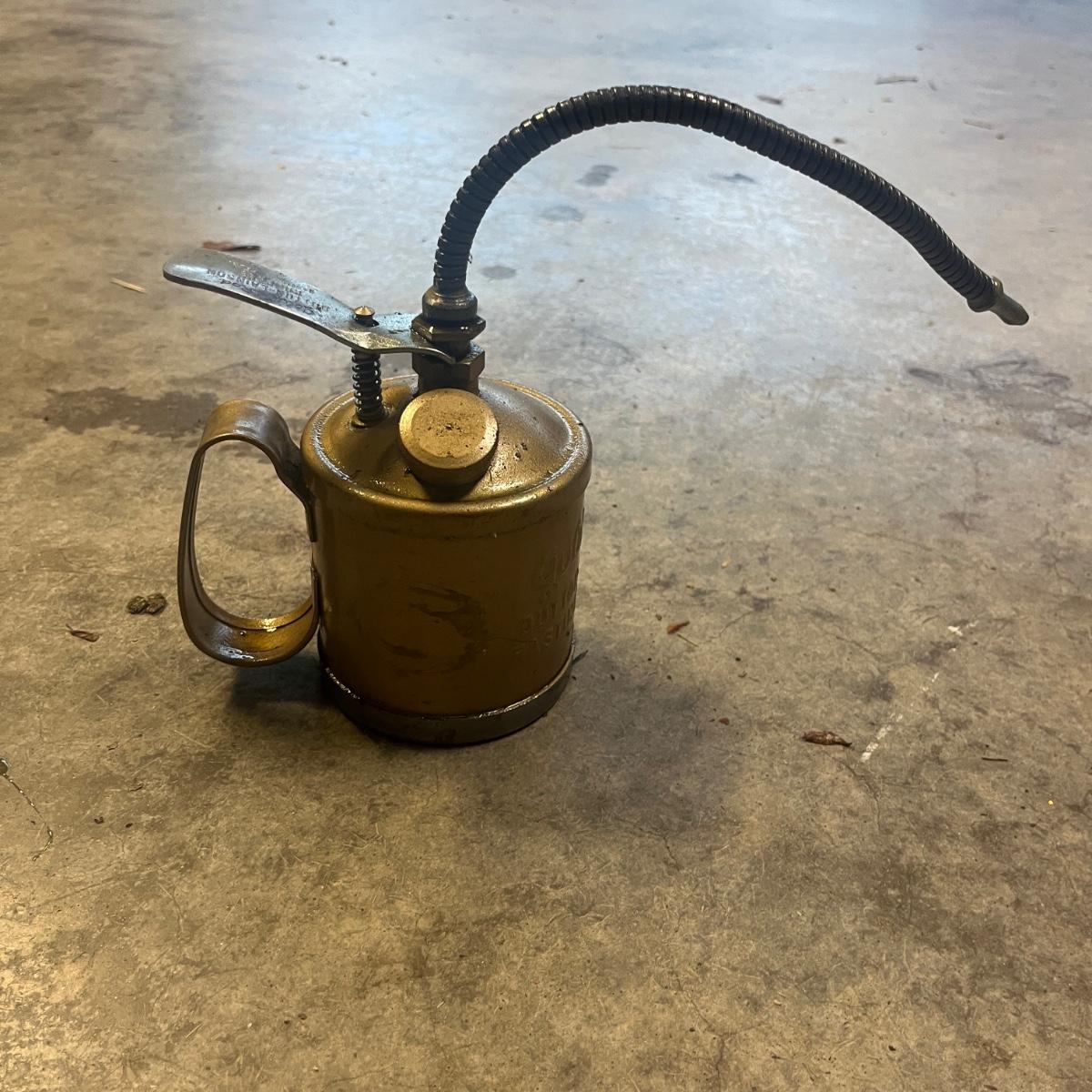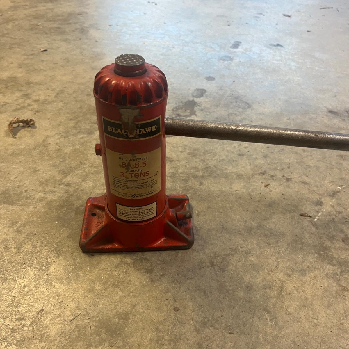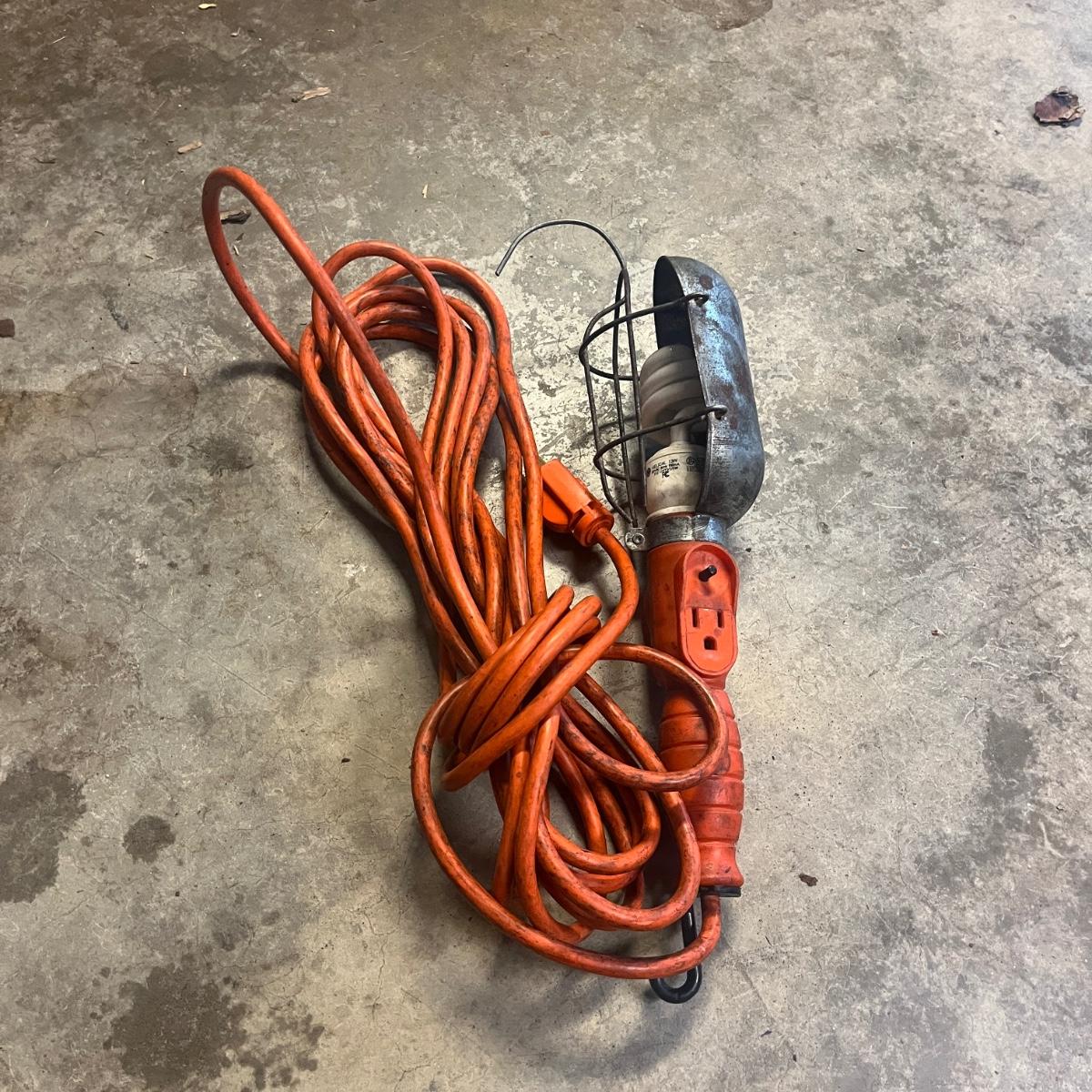 Lot includes a three ton bottle jack, GoldenRod metal oil can, 1/2” drive impact wrench, drop light and a valve lapping tool. Light powered on when plugged in.
