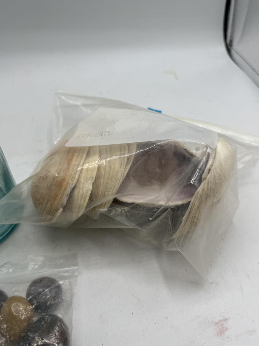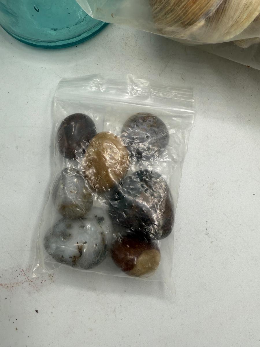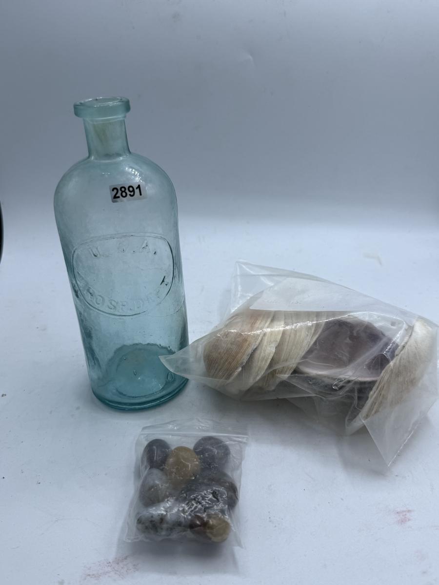 Bottle, oyster shells & polished rocks