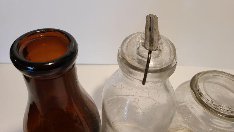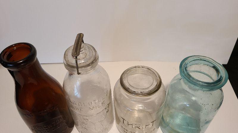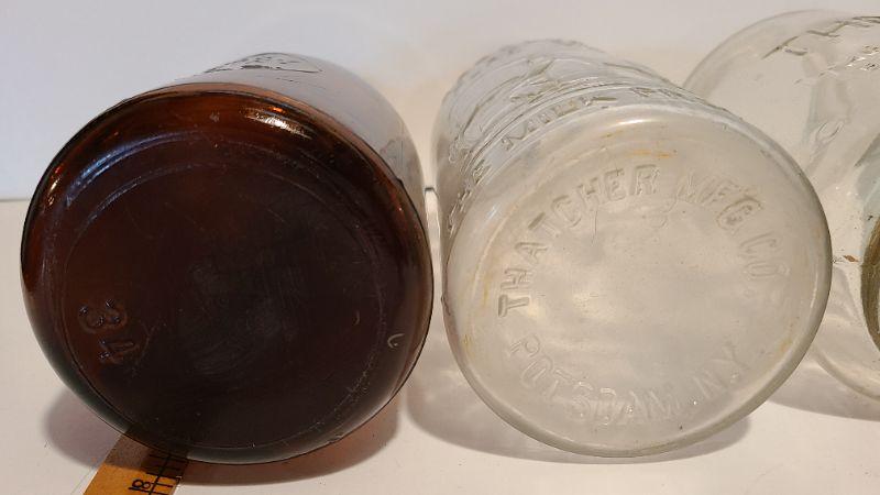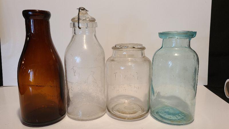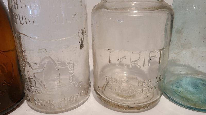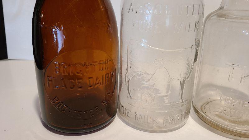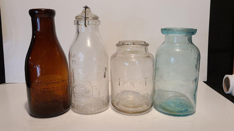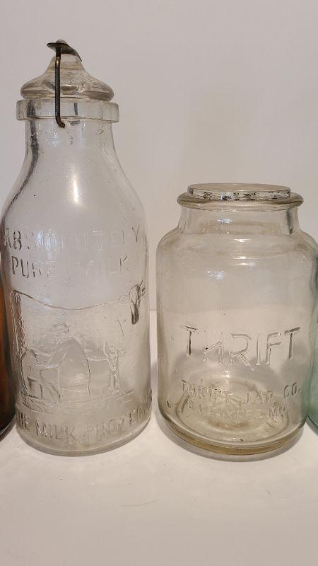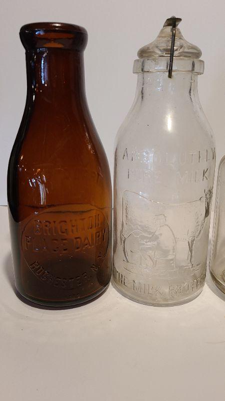 Rare Amber Brighton Place Dairy Bottle, Old S. McKee Wax Sealer Bottle, Thrift Jar and Absolutely Pure Milk Bottle. Each lot is unique and you will need to see all pictures. Pictures have been taken from all side to see condition and markings. What you see in the pictures is the actual content of the lot and the pictures are the best representation of the bottles. All bottles are sold-is according to the pictures. For further information please google the makers marks for age.