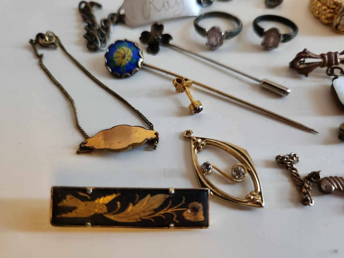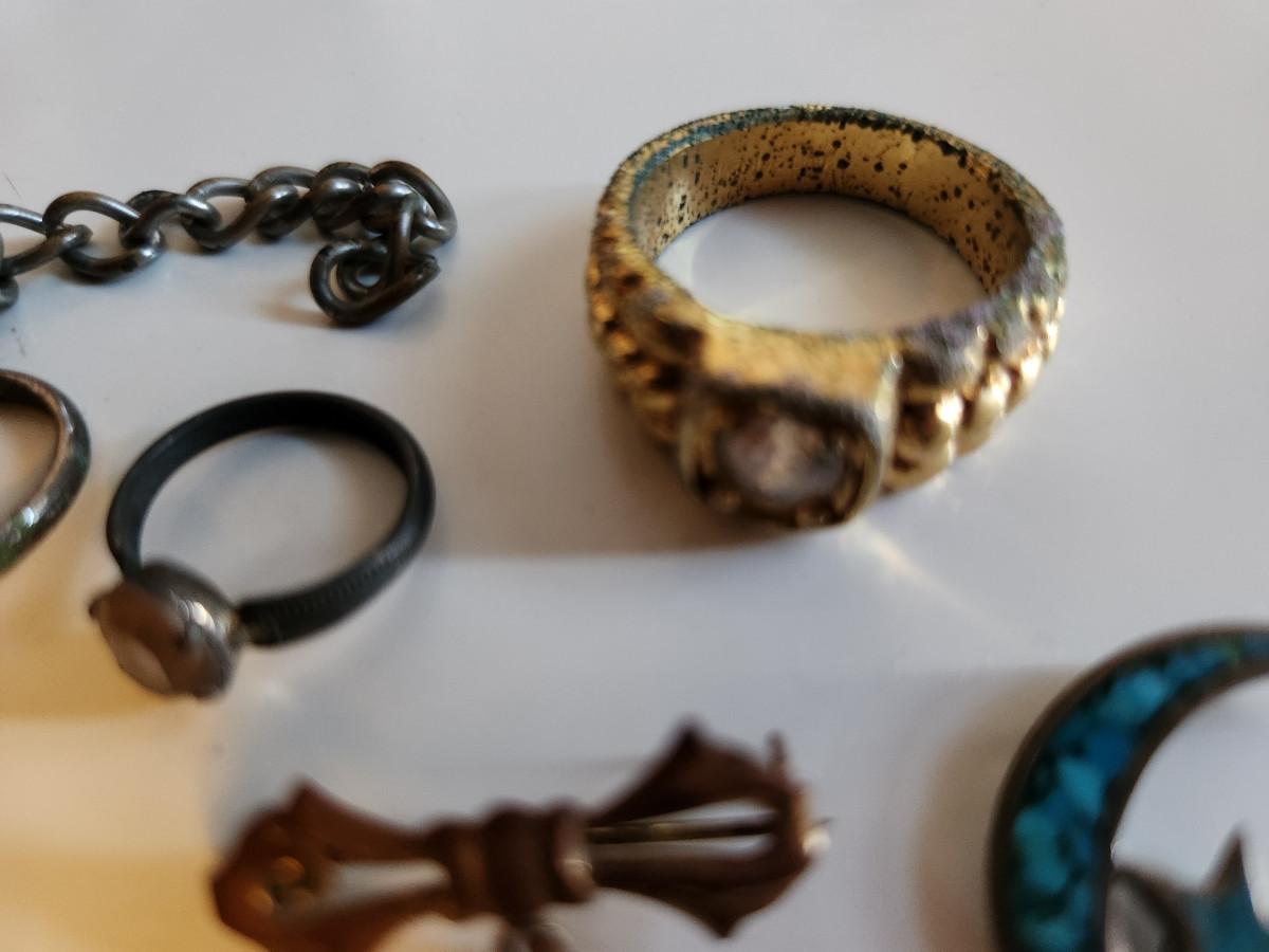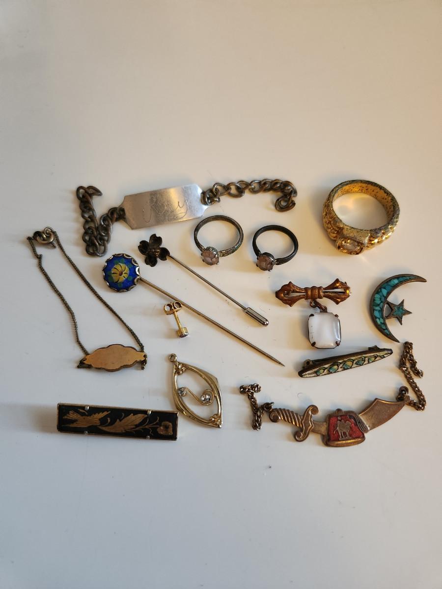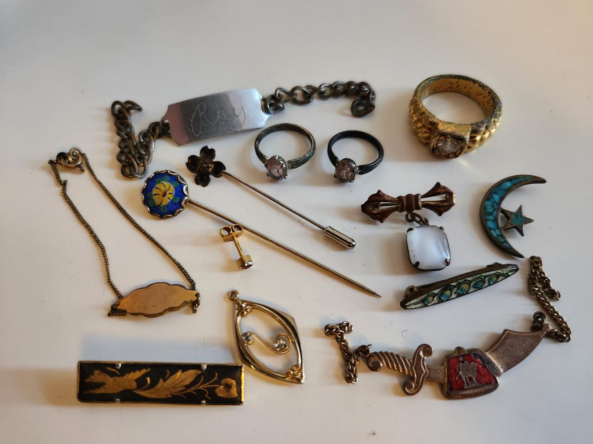 This lot is for items we found in the Bottom of the Jewelry Box. Several rings, tie clasps, pins and bars. Some interesting pieces that could be used for many purposes.