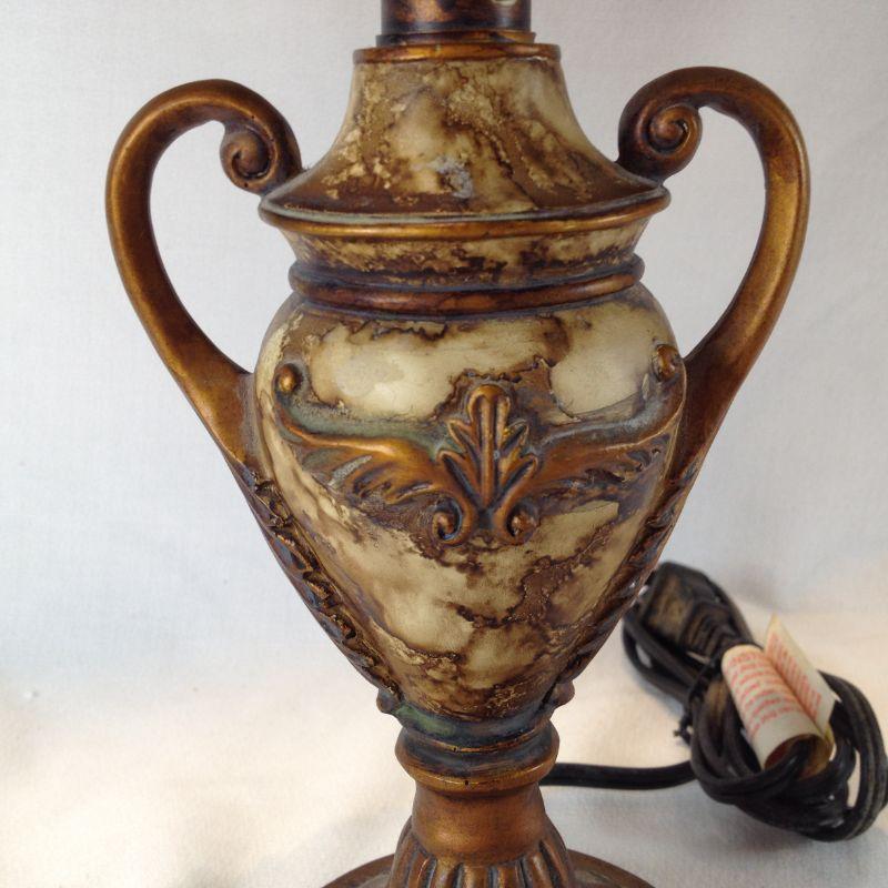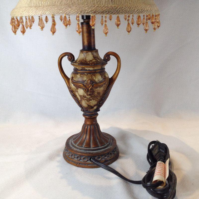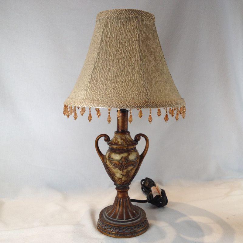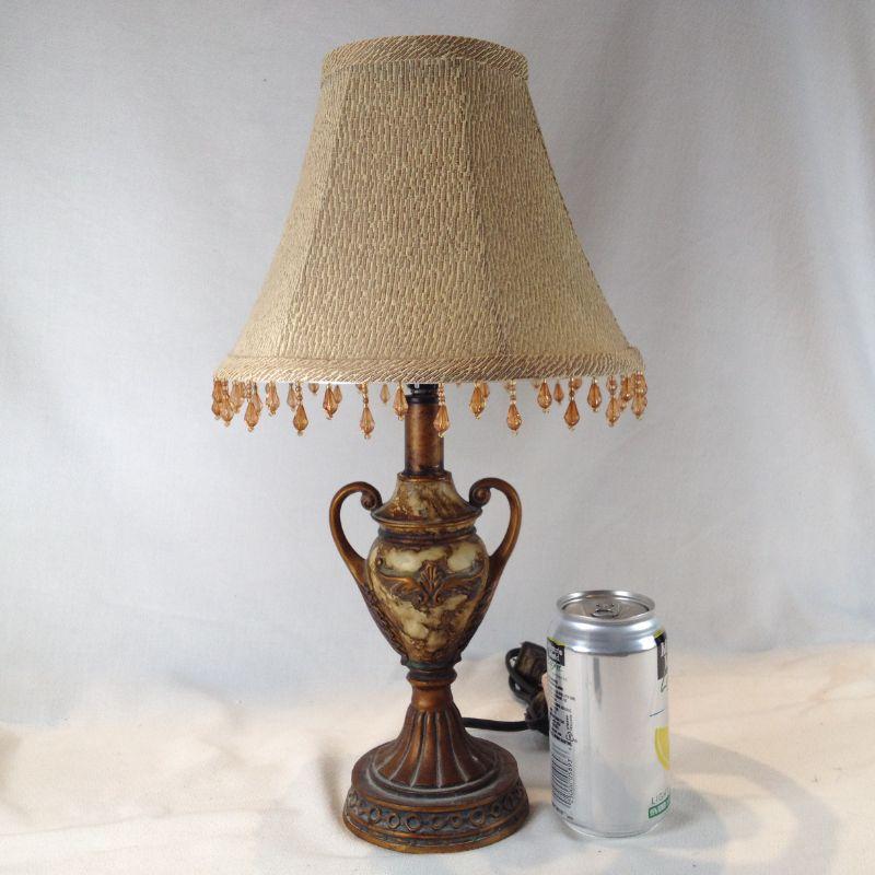 This lot is for a vintage-appearing fun short/small Boudoir Lamp. It is made out of resin but is very stylish. Shade is in very good condition also. Lamp stands 16-1/2-inches tall.