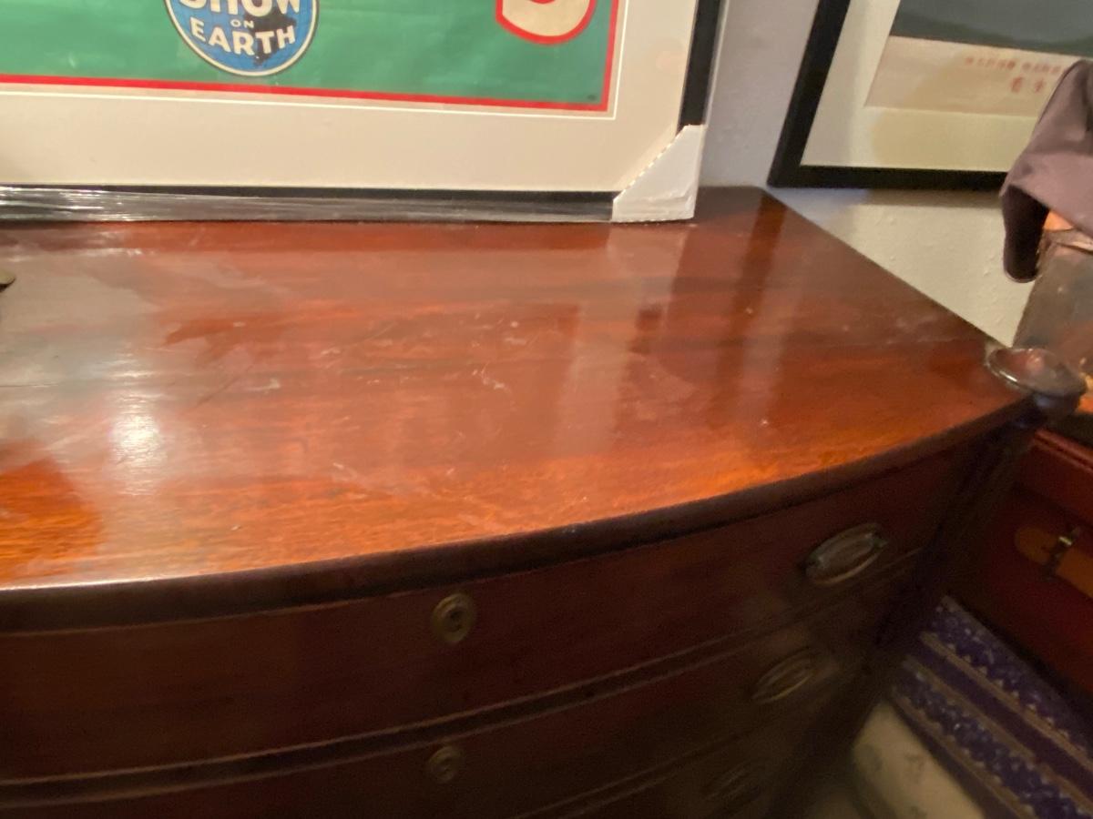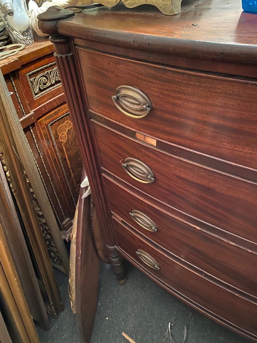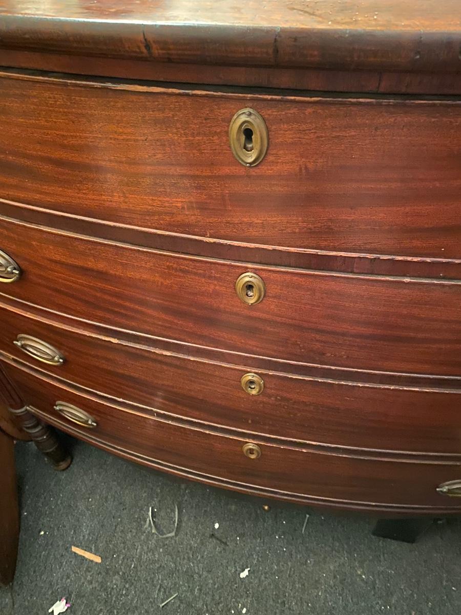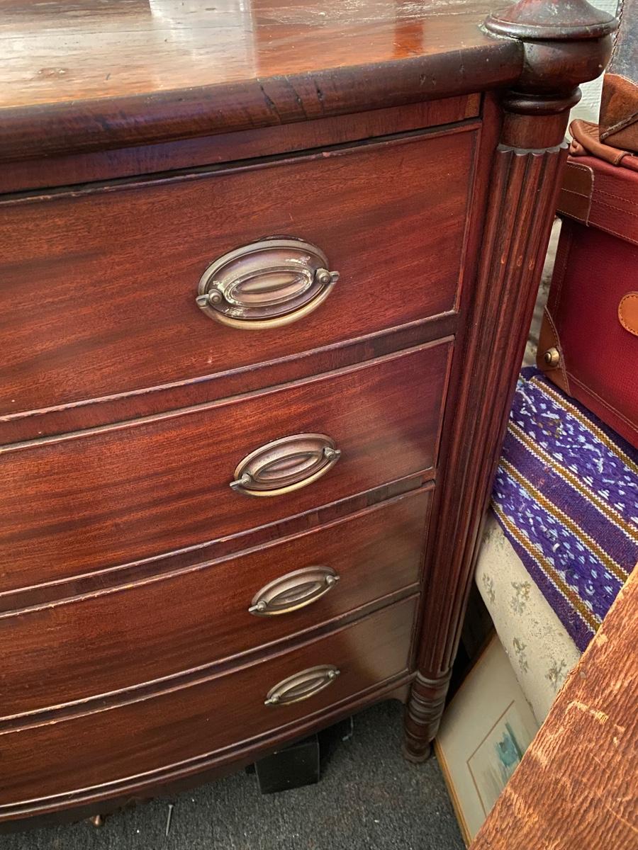 Bow Fronted Mahogany Chest withbrass handles and fluted corner details. Measures approx 41Wx40Hx22 D