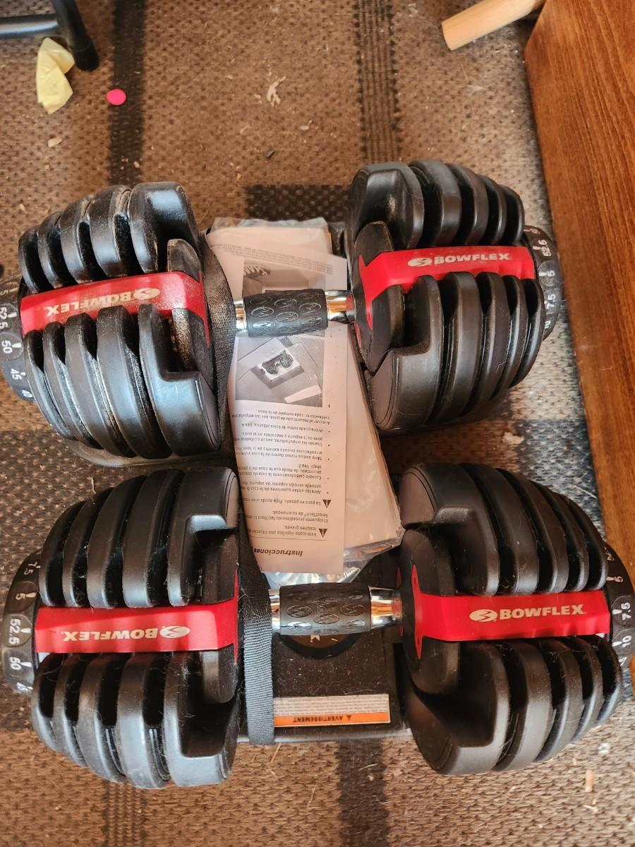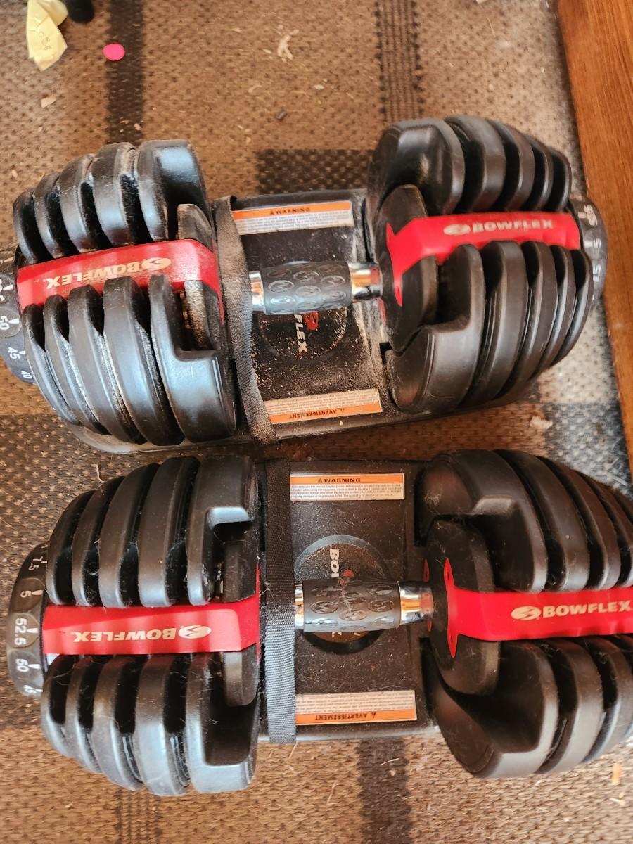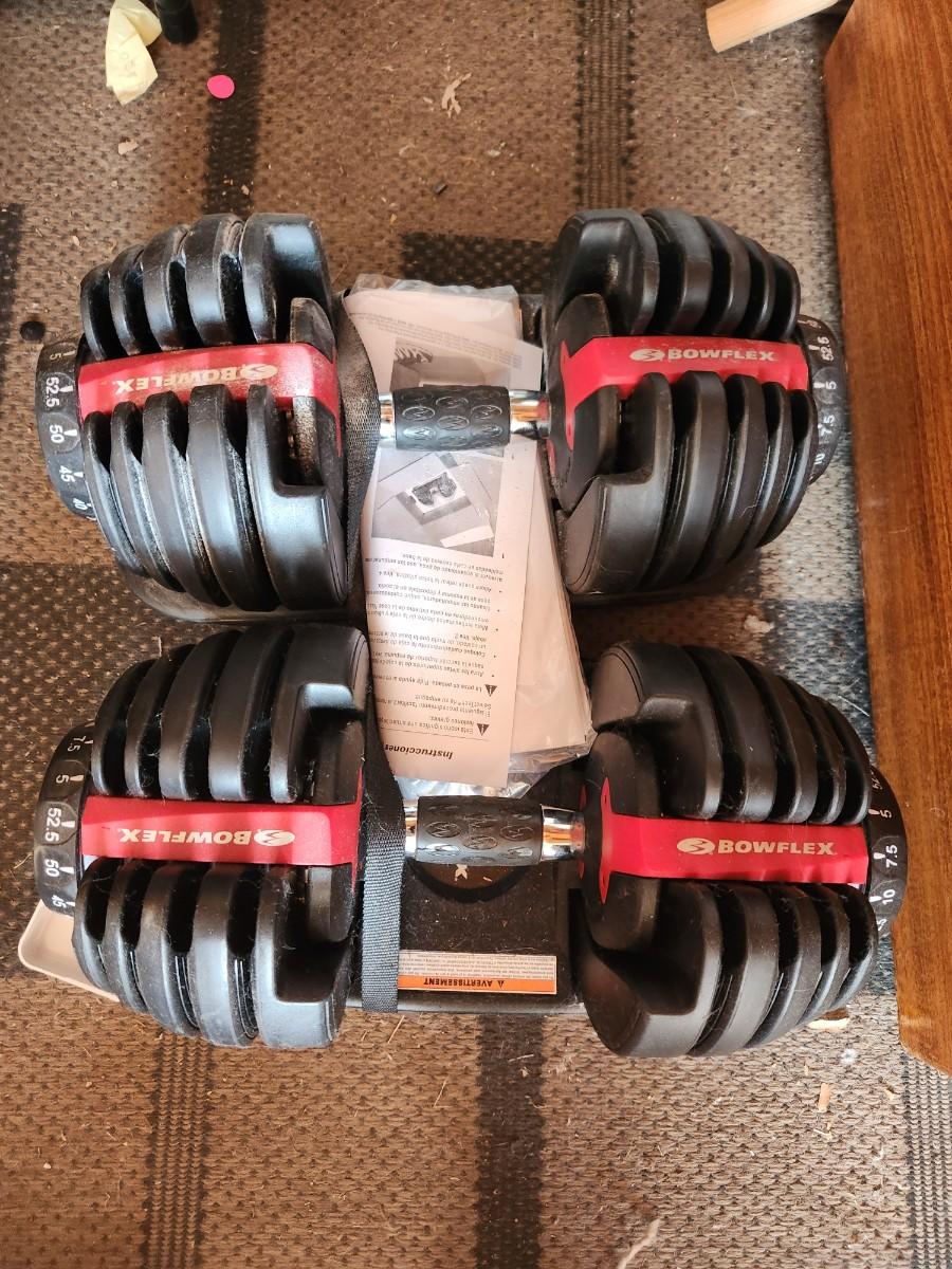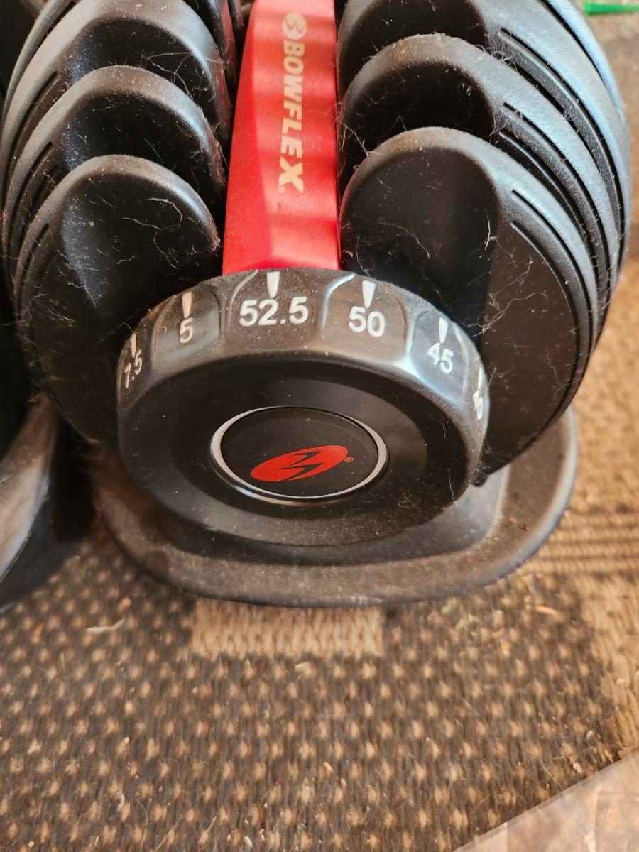Spin the knob to adjust your weight. Each dumbbell goes up to 52.5 pounds.