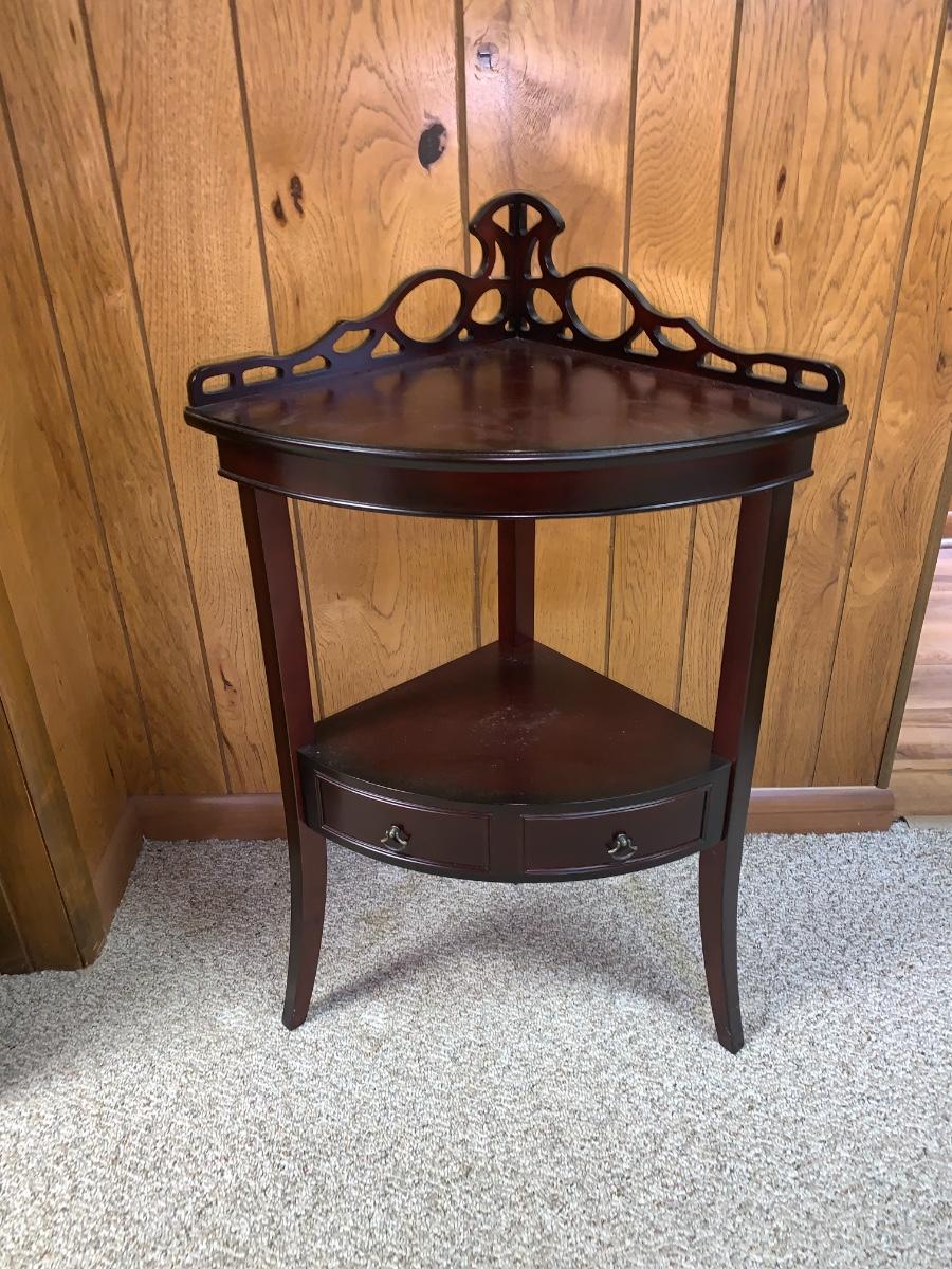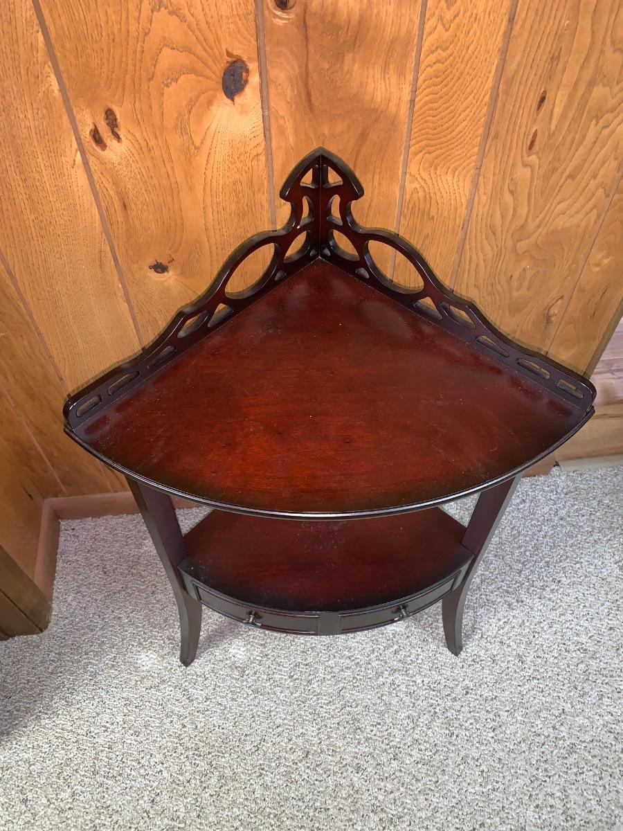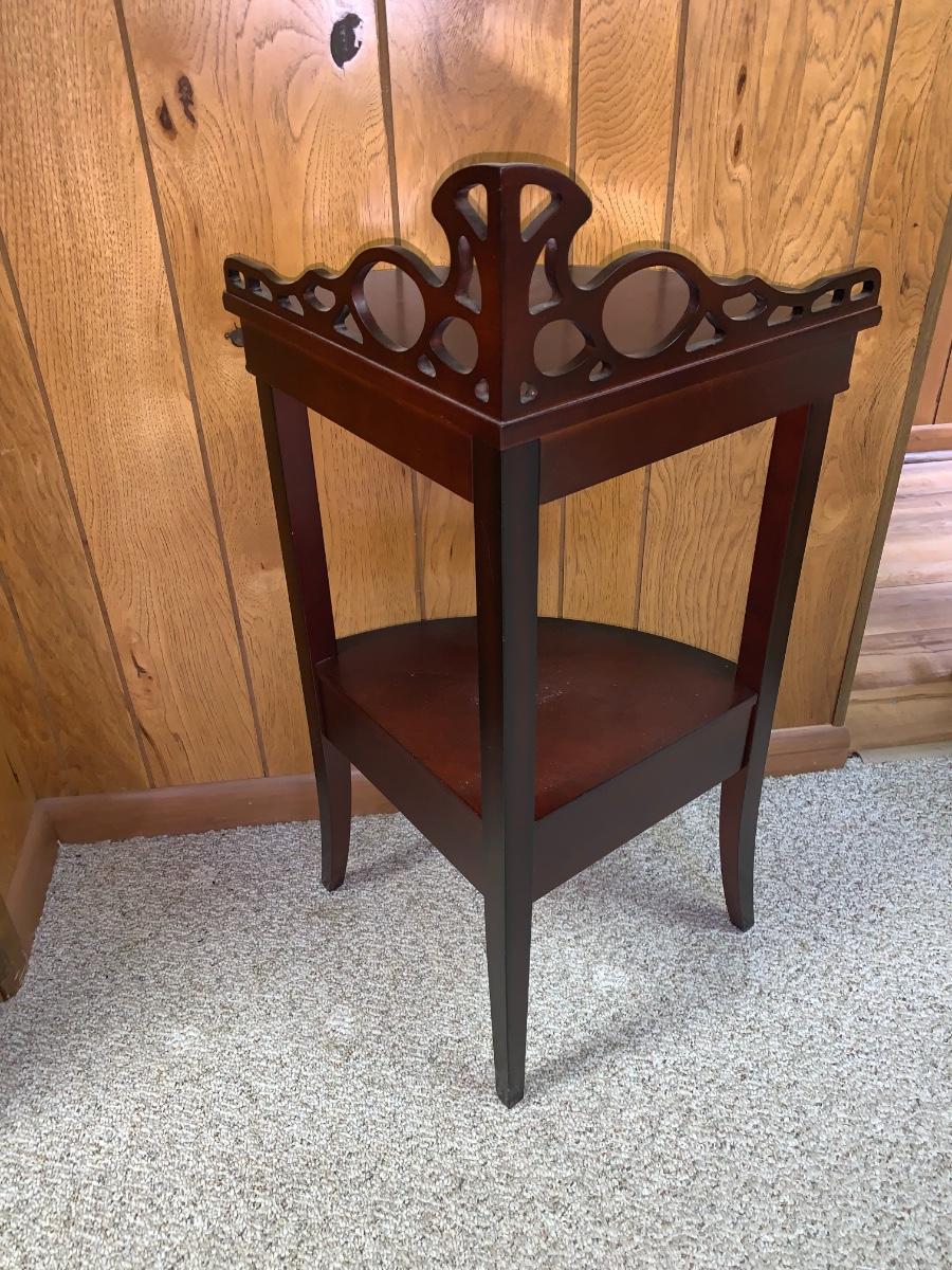 Lovely little accent corner table,dark wood, with bowed out legs