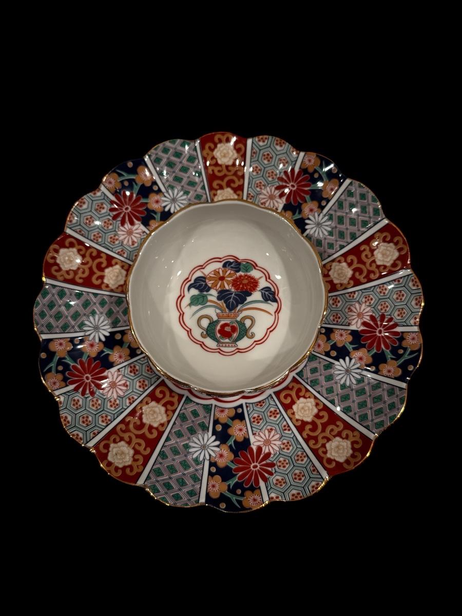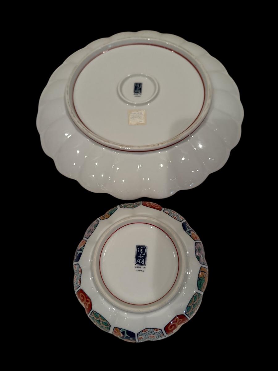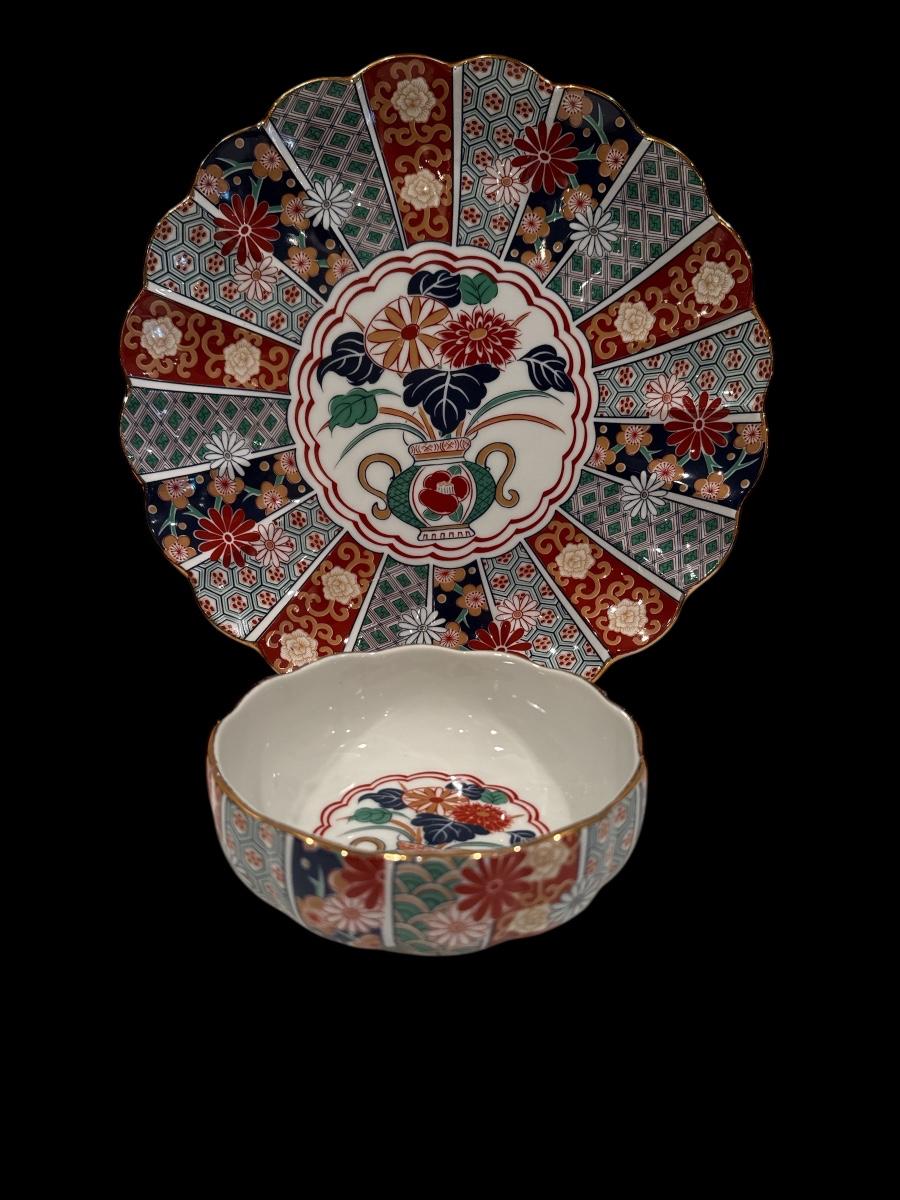 Colorful Japanese porcelain bowl and plate set in the Imari style. Features scalloped edges and bold floral and geometric designs in red, blue, green, and gold. Both pieces are marked “Made in Japan” on the bottom. A vibrant and decorative set.