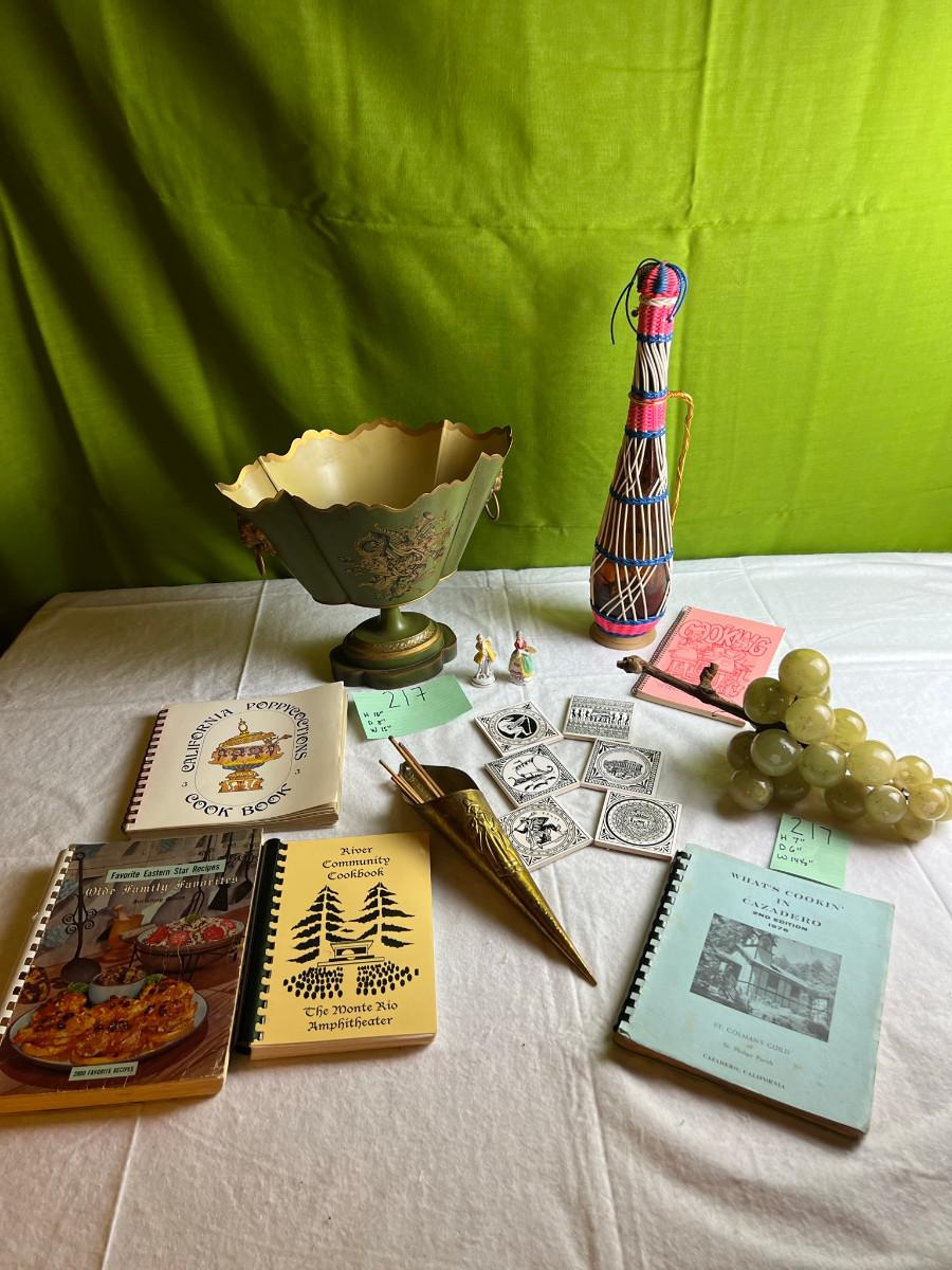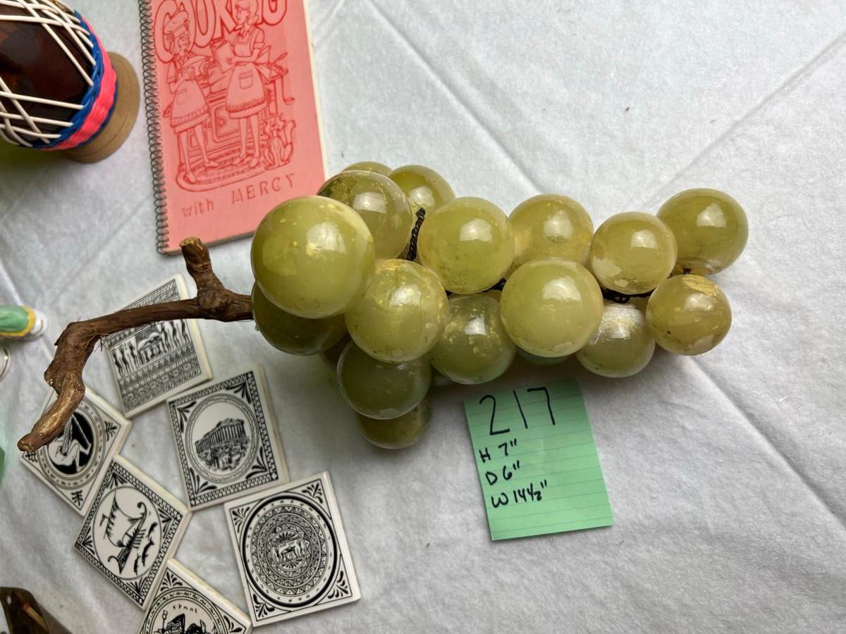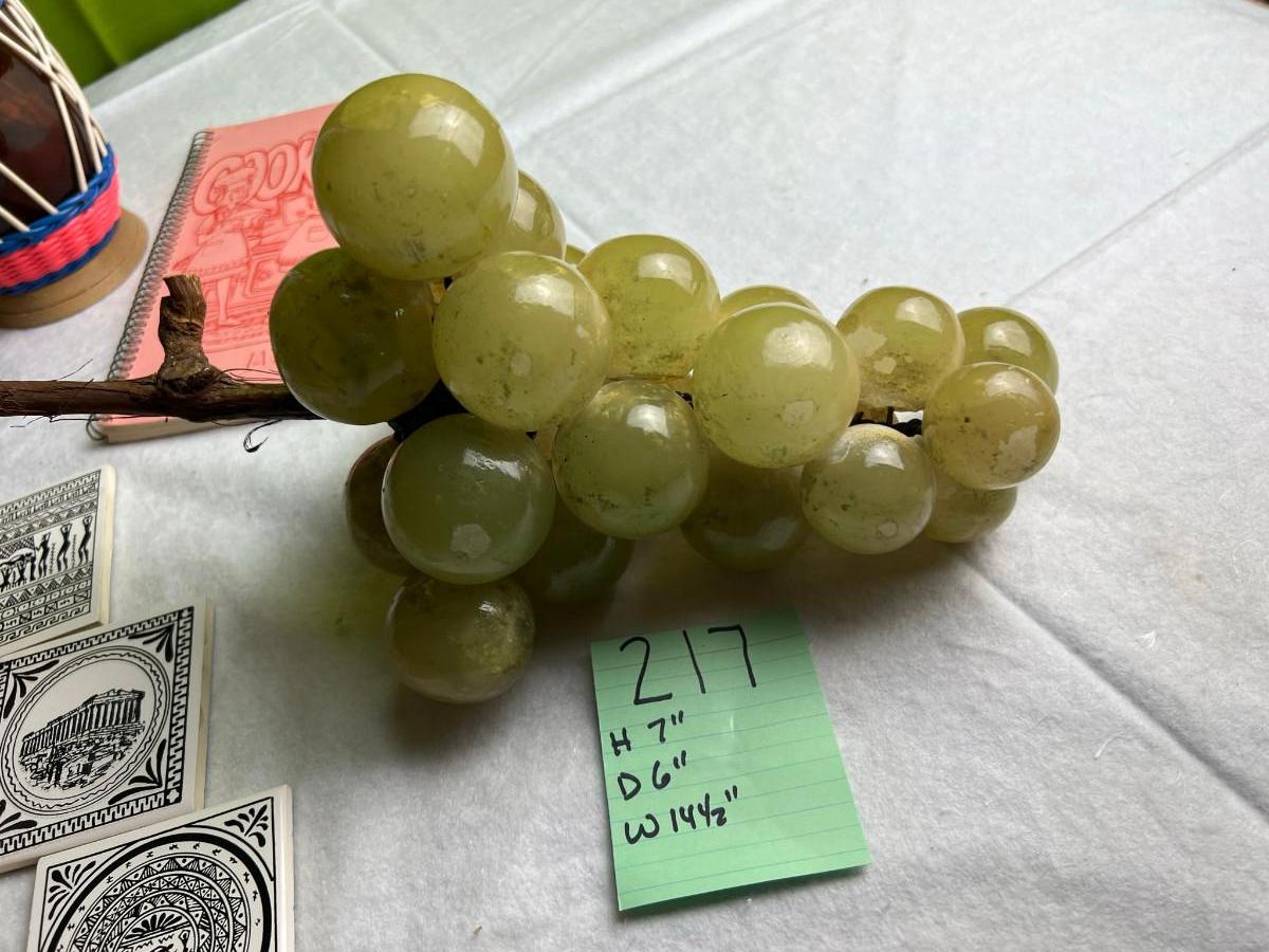 Fruit bowl 16" x 8" x 15", glass grapes 14.5" x 6", match metal holder, bottle wrapped with gold handle 18" x 3 1/4" x 3.5", and 6 drink coasters and 2 figurines.