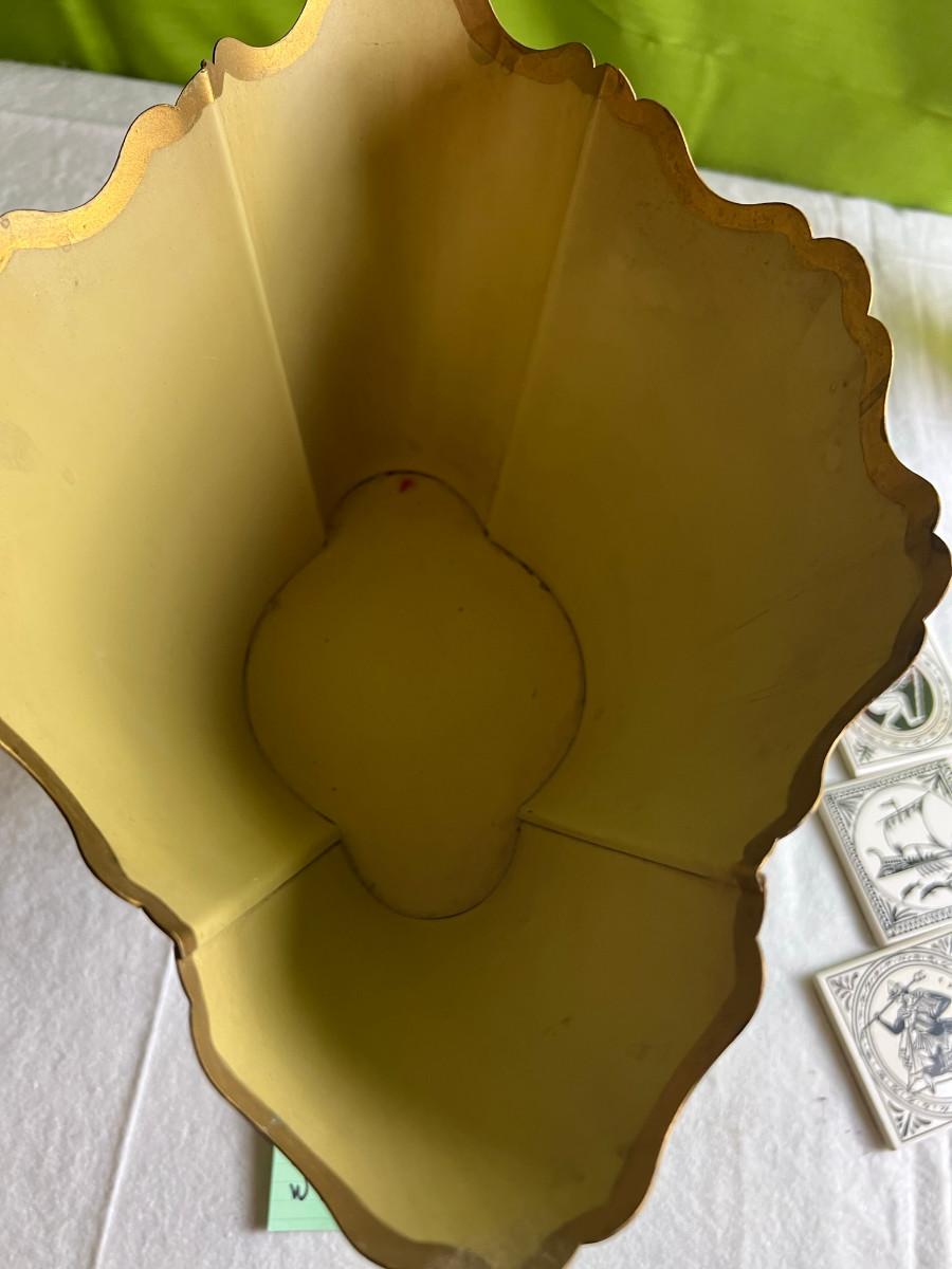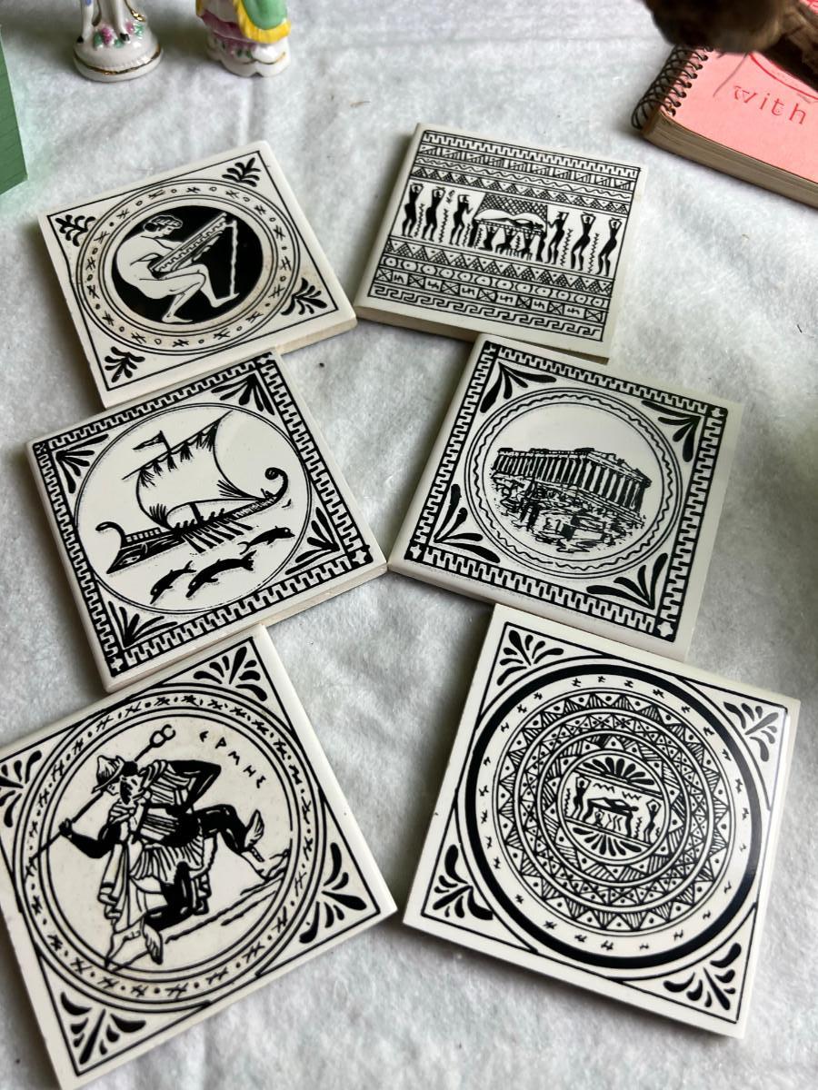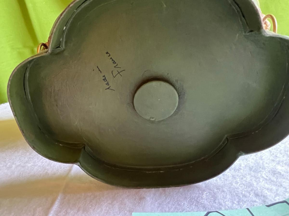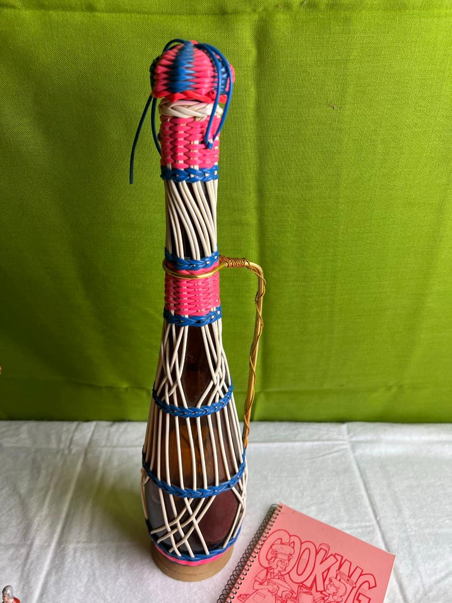 Fruit bowl 16" x 8" x 15", glass grapes 14.5" x 6", match metal holder, bottle wrapped with gold handle 18" x 3 1/4" x 3.5", and 6 drink coasters and 2 figurines.