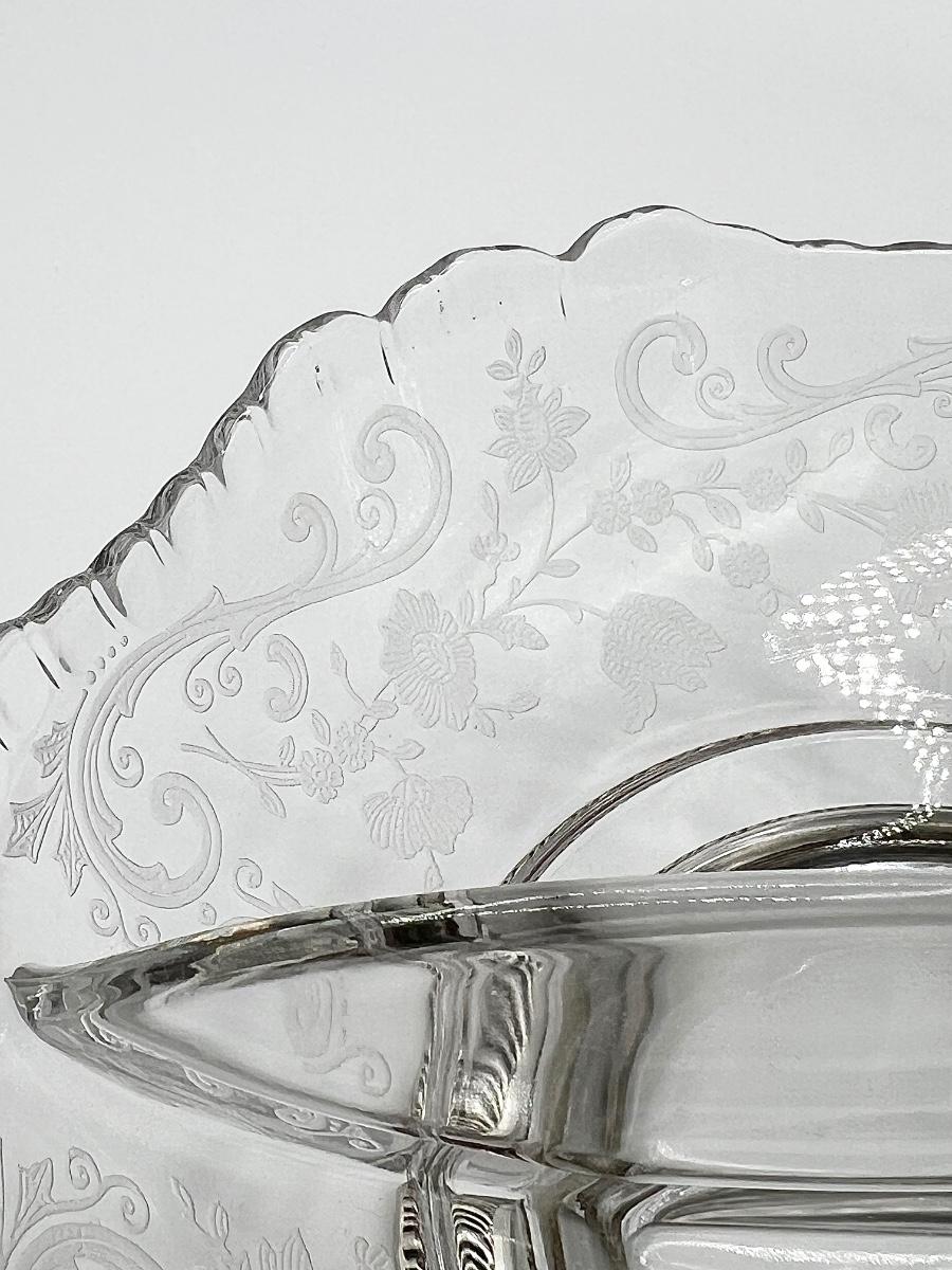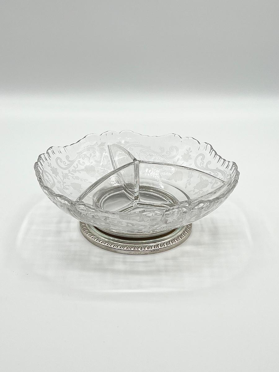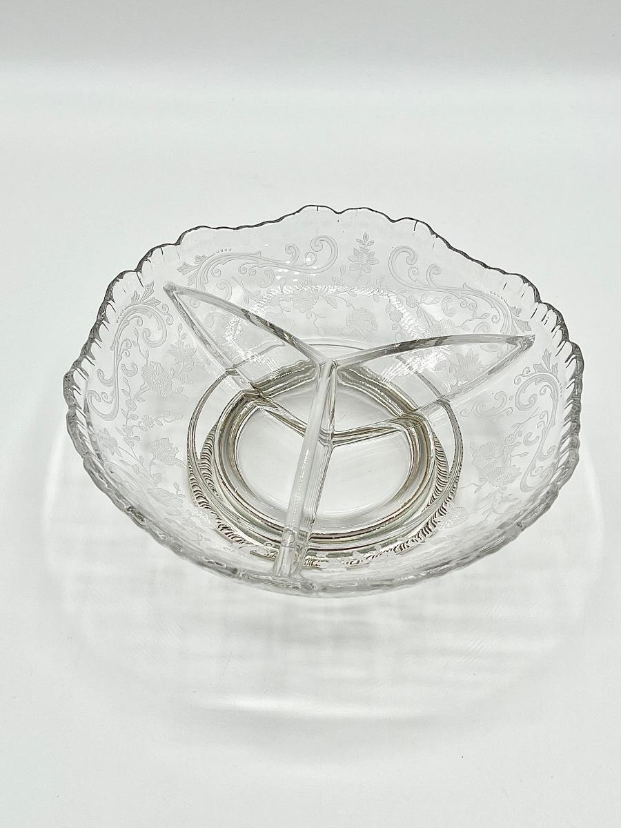 Vtg Floral Etched Glass Sterling Silver Base Divider Bowl
