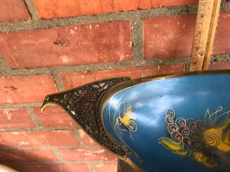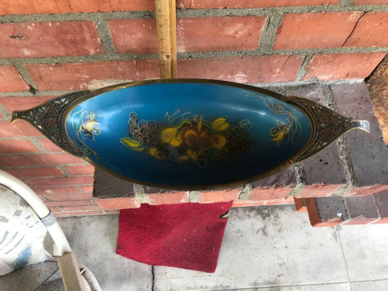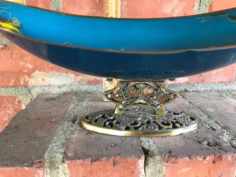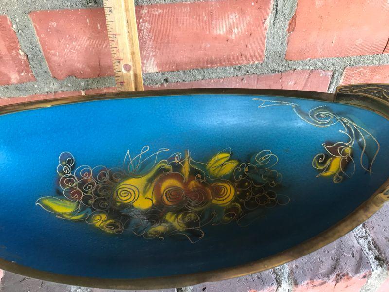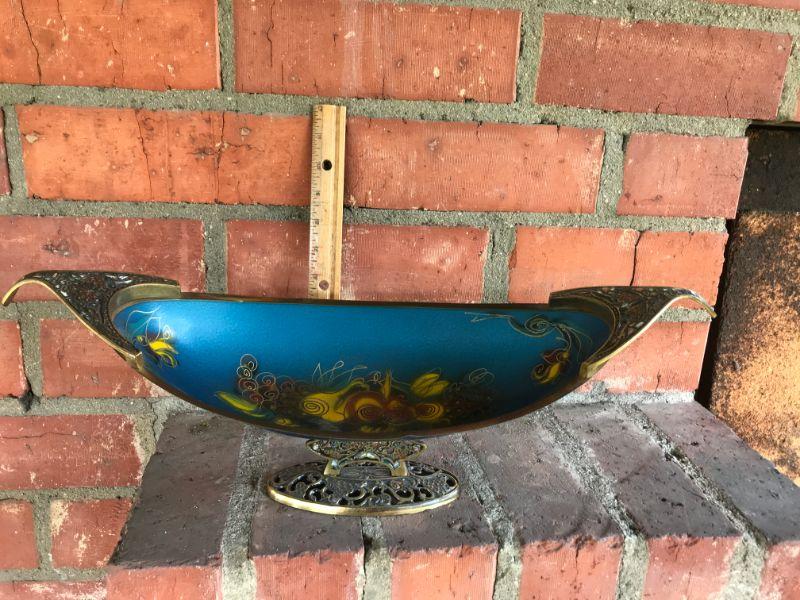 Brass blue enamel wheelbarrow bowl made in Israel, floral pattern