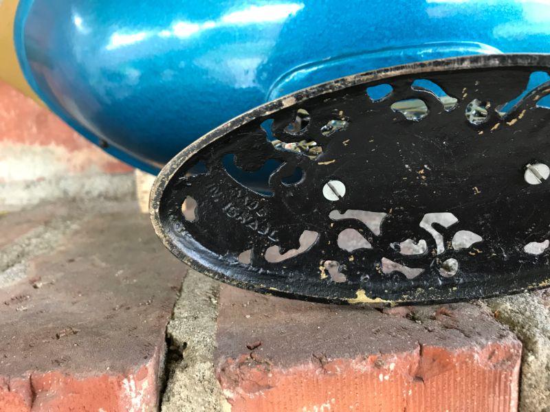 blue metal with painted flower design and jewel-encrusted handles. In fair condition. It tips forward, but I can’t tell if that is intentional. 20" wide x 7.5" x 8" high