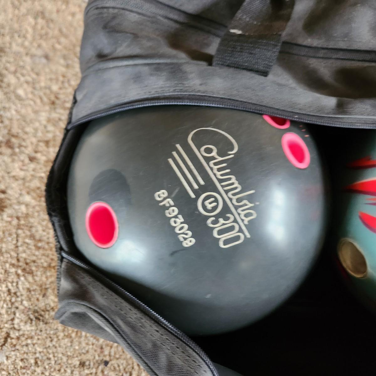 Bowling Bag w 2 Balls 1 Miami Dolphin 1 Columbia 300 plus 1 Red Storm Bonus Ball