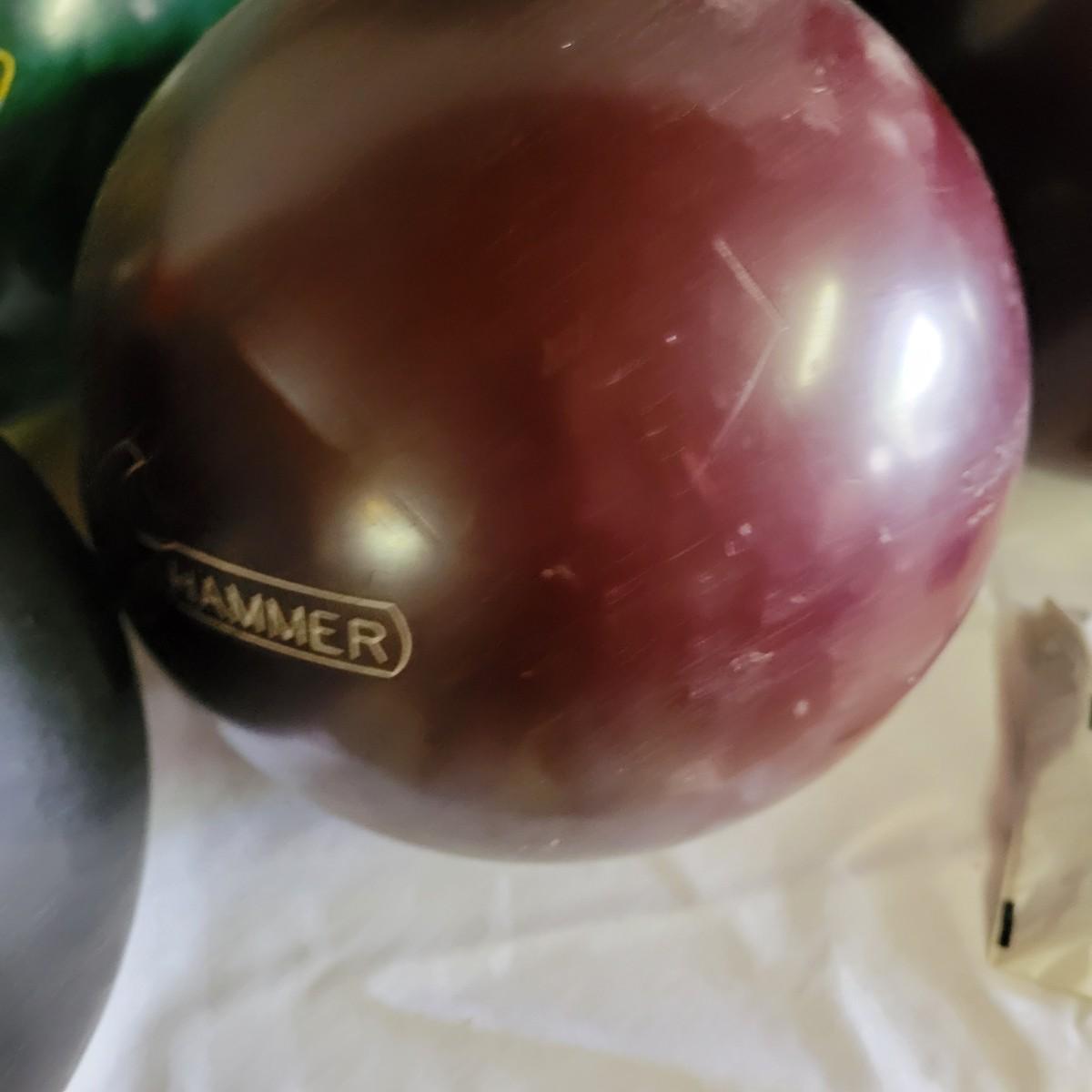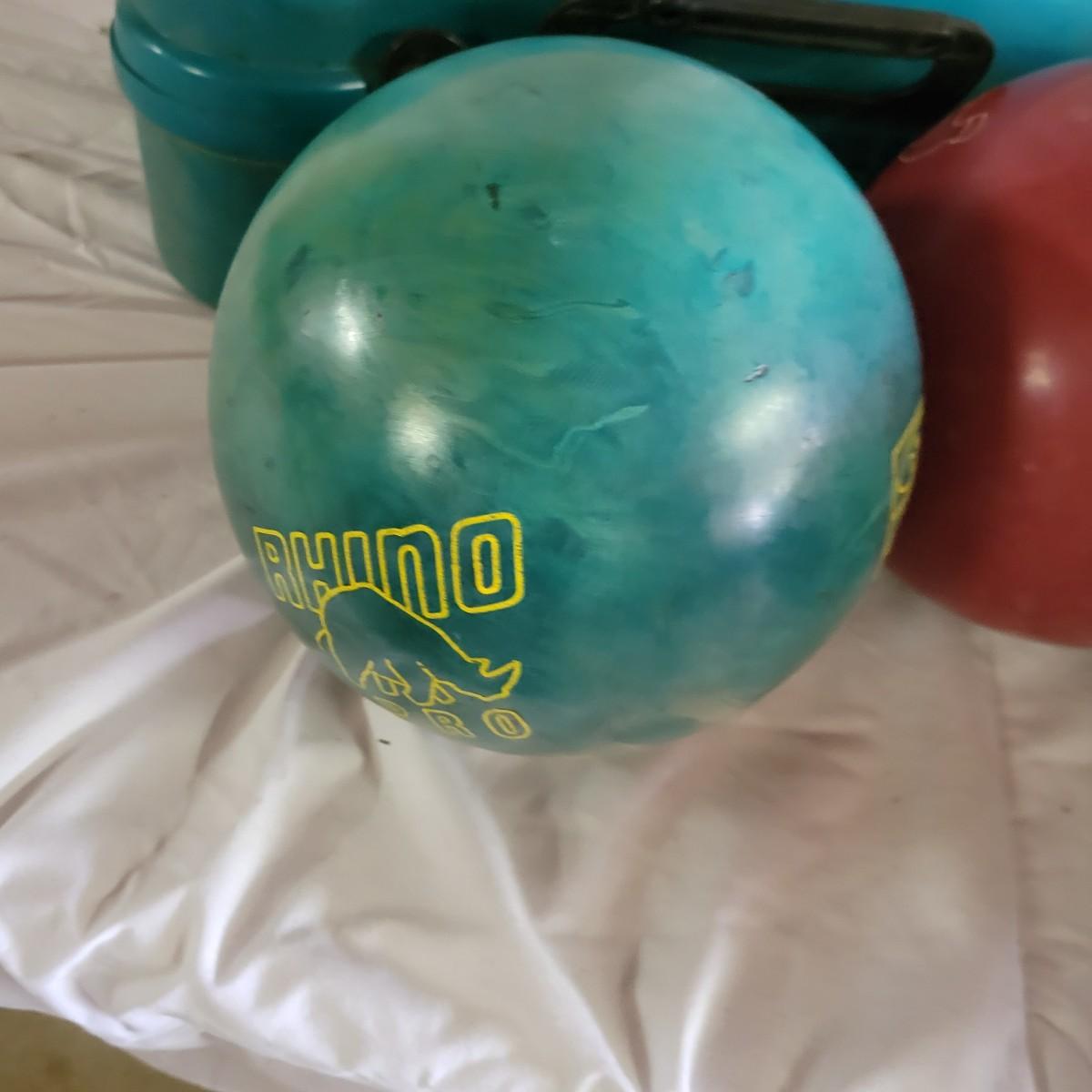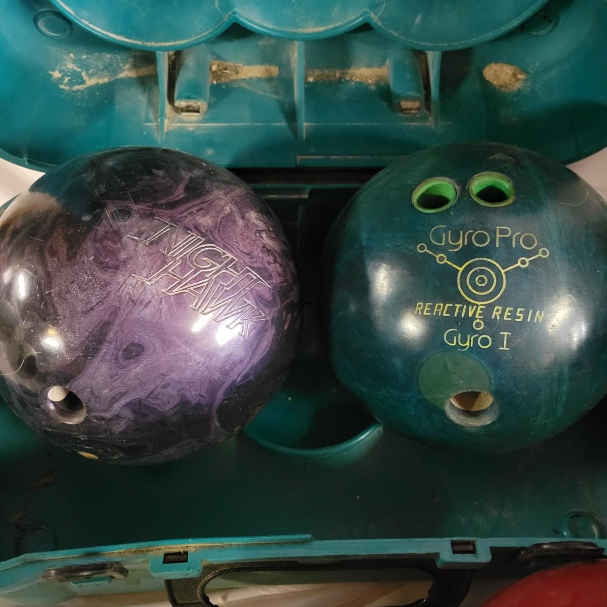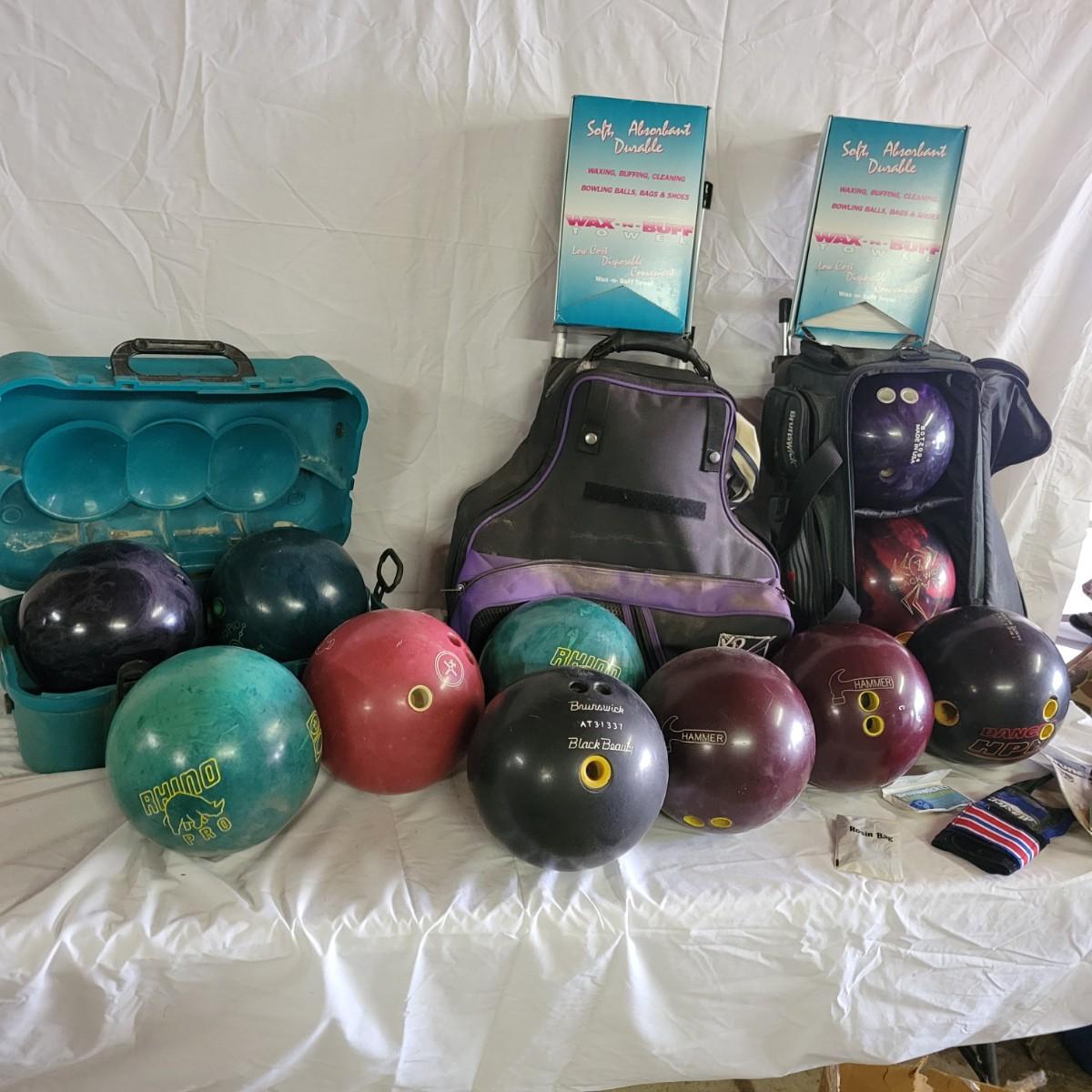 Over twelve bowling balls, three carrying cases and more accessories. It appears that the balls are a mix of weights, possibly 12lb and 16lb balls with finger holes fitting a man and a woman. Includes carrying cases, a braced glove, rosin packs and additional accessories. Largest case measures approximately 18" x 15" x 37.5"H. Local pickup only