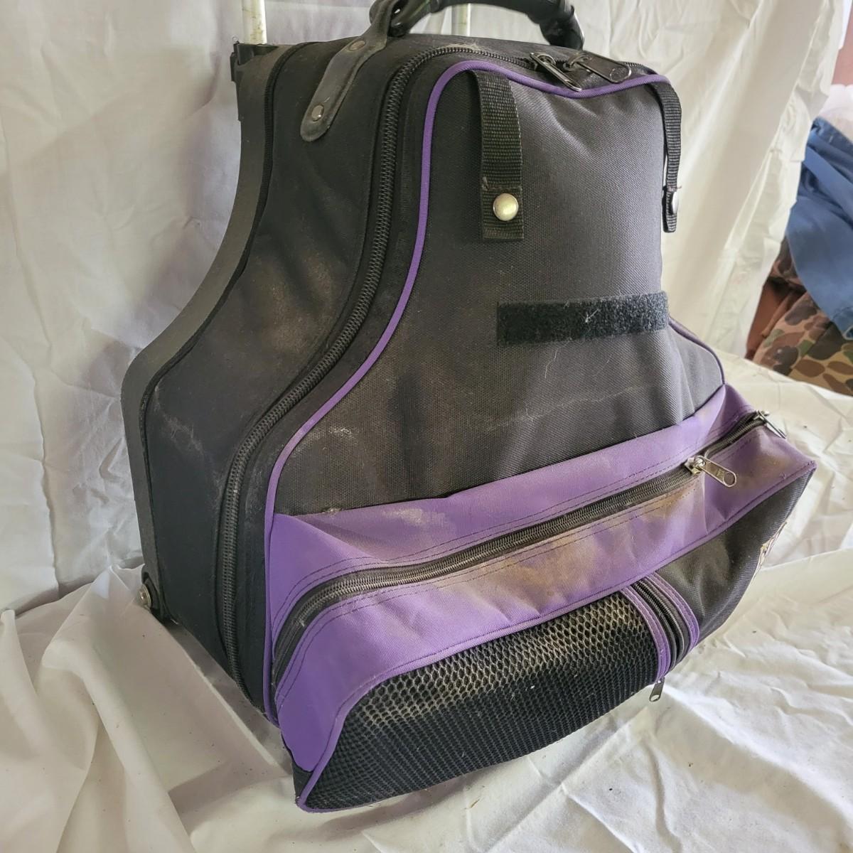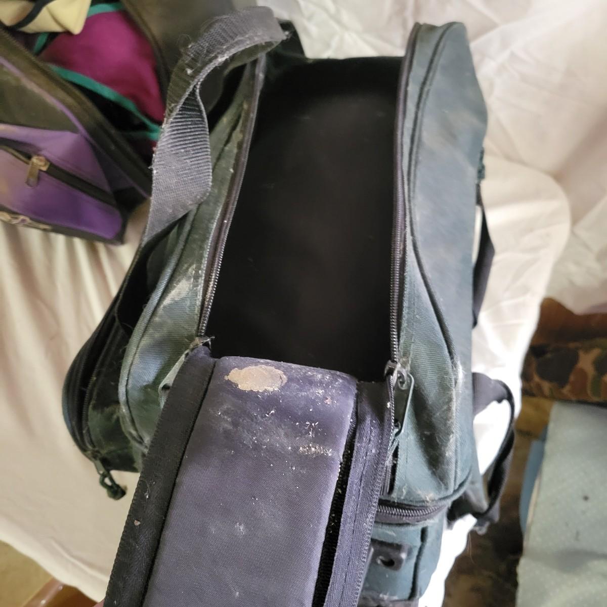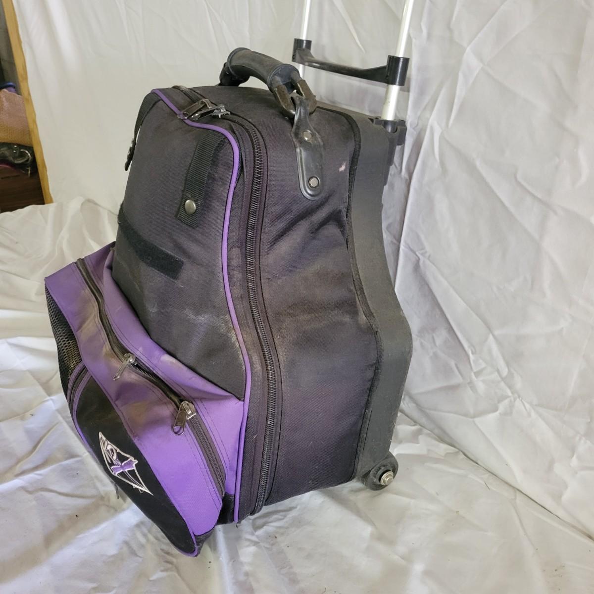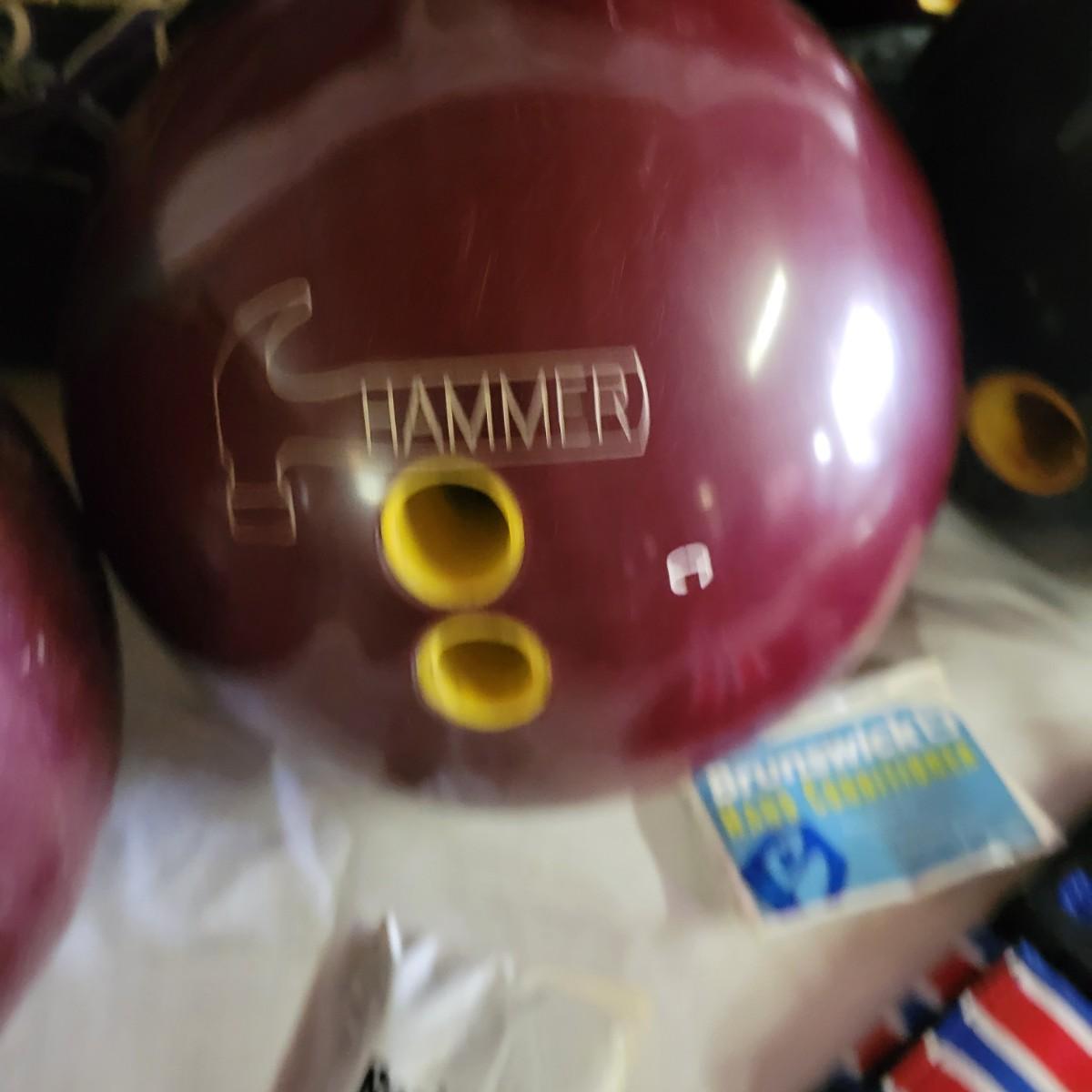 Over twelve bowling balls, three carrying cases and more accessories. It appears that the balls are a mix of weights, possibly 12lb and 16lb balls with finger holes fitting a man and a woman. Includes carrying cases, a braced glove, rosin packs and additional accessories. Largest case measures approximately 18" x 15" x 37.5"H. Local pickup only