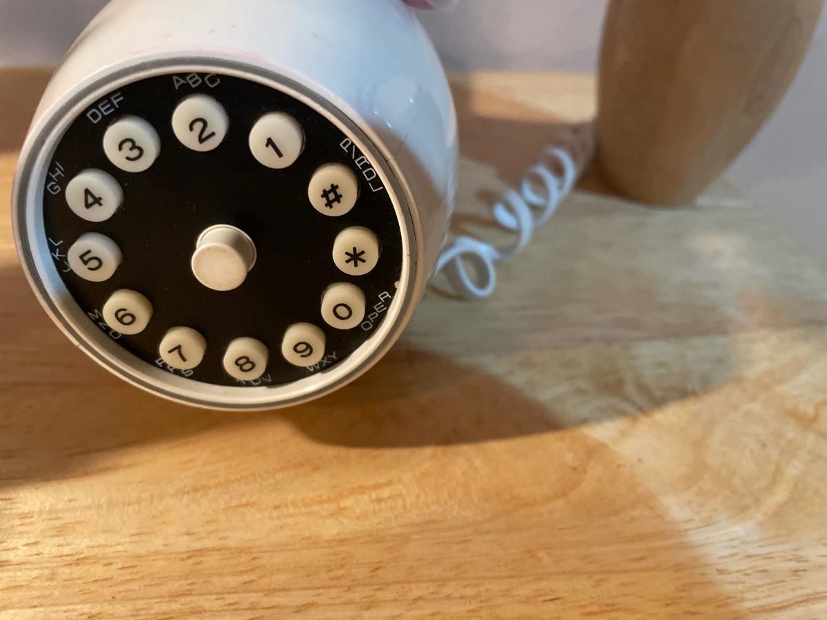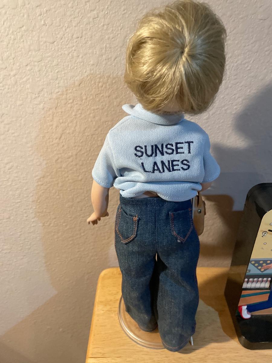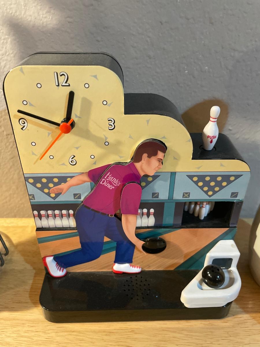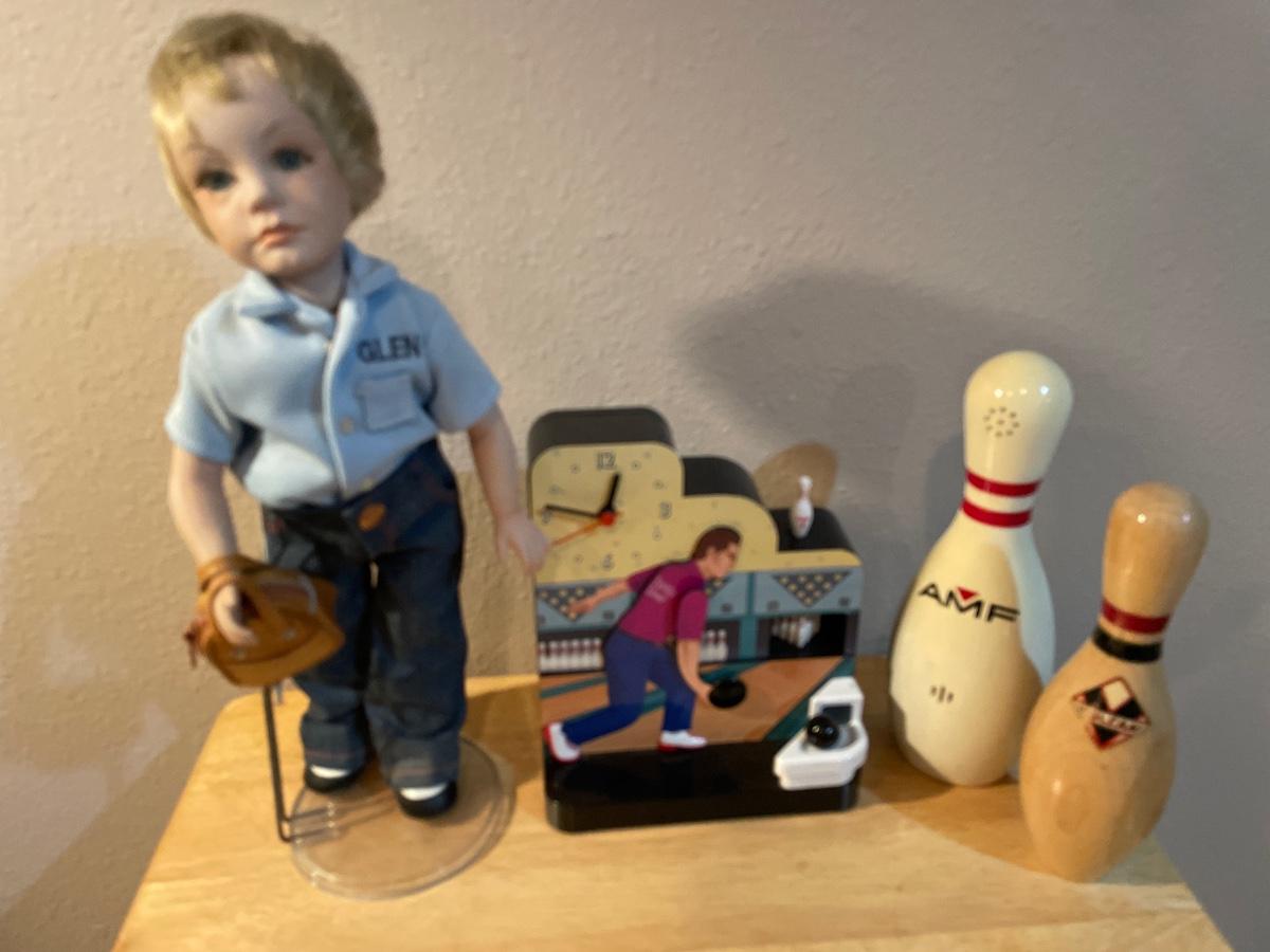 Bowling decor with doll, clock, phone and pin