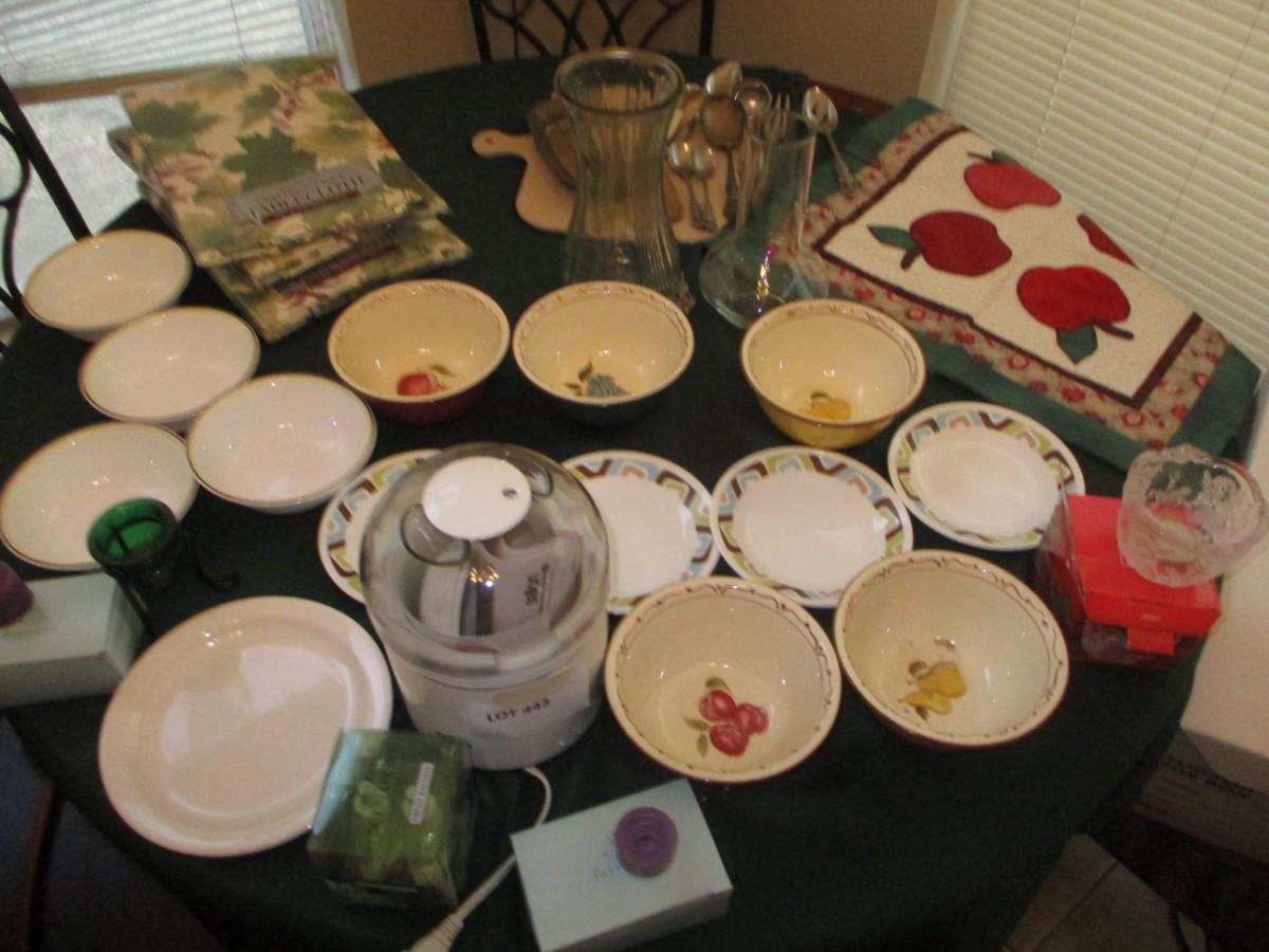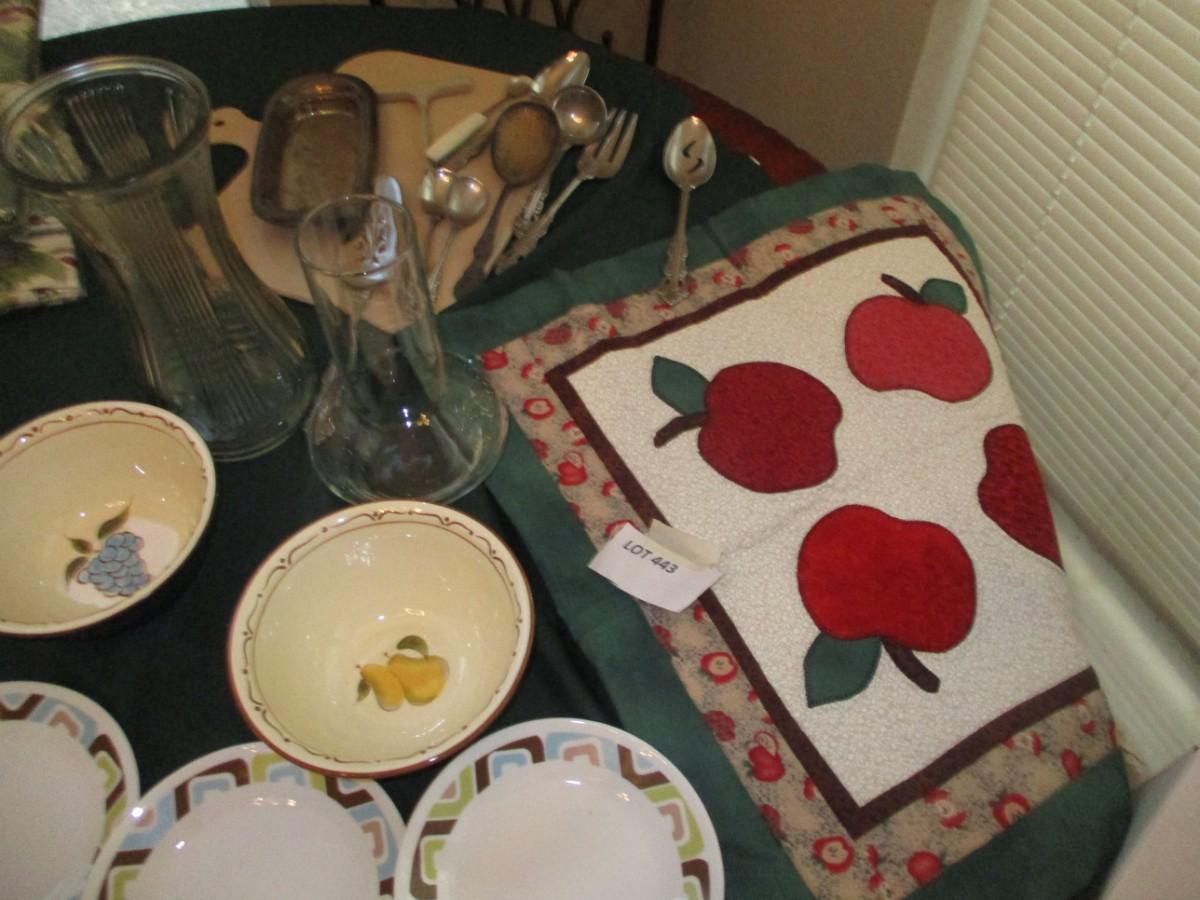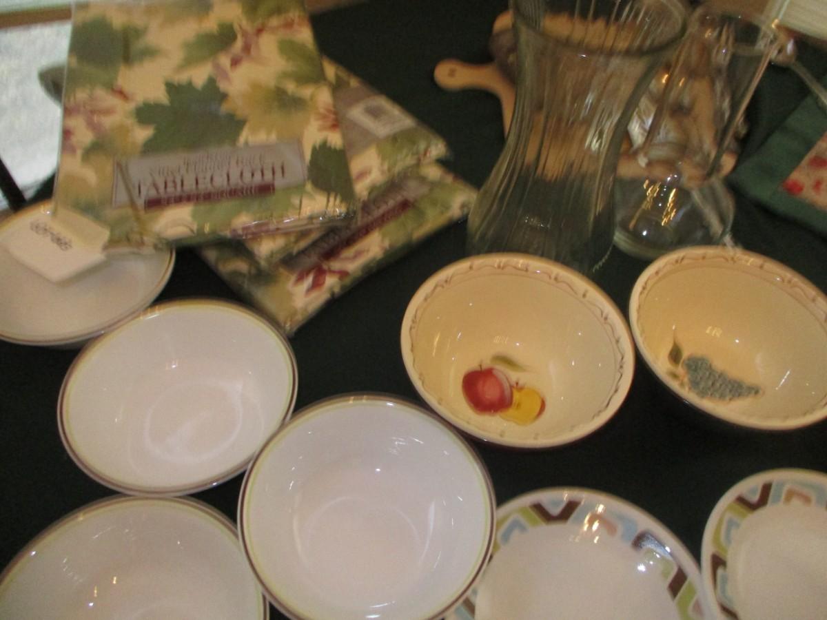 corelle Bowls (4). Vinyl Tablecloths (3). Corelle saucers (4). Yogurt maker. LaTour Flatware. Vases. apple Table mats