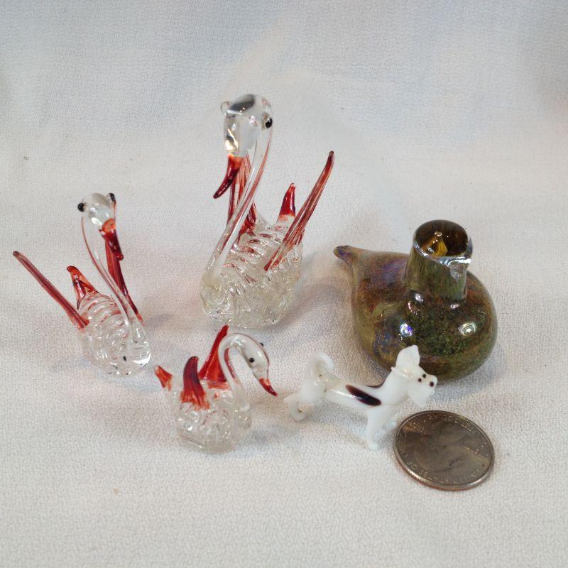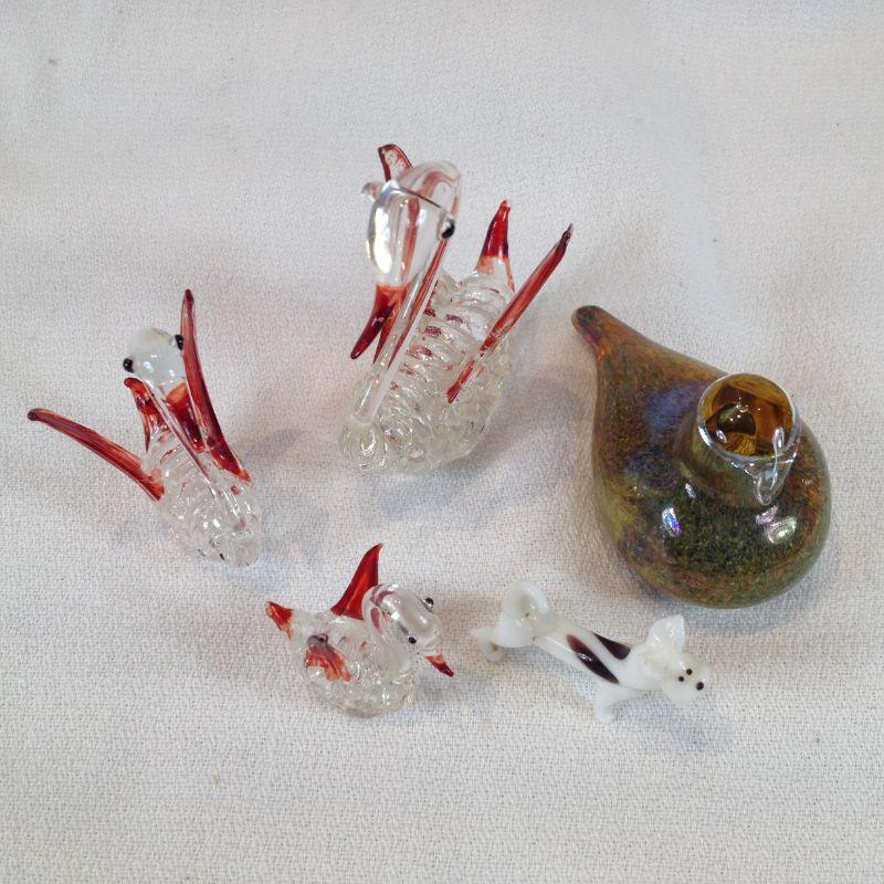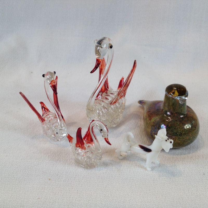 This is a fun grouping of blown glass animals - 3 swans, a very nice duck and a dog. There is some paint loss on the swans but overall everything else is in very good condition. Tennessee Williams would be proud to own the likes of these, how about you.