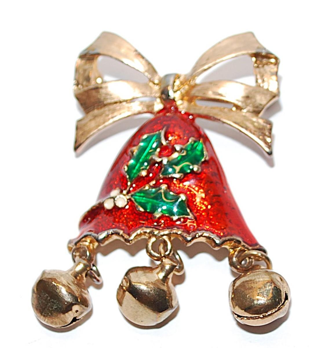 BOWTIE Red & Green BROOCH (2" x 1½") with 3 Gold Colored BELLS and Gold Tone Setting