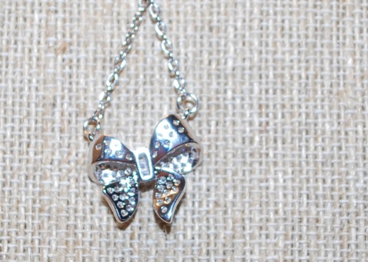 "Bowtie Ribbon" Sparkle Stones PENDANT (¾" x ¾") on a Silver Tone Necklace Chain 16" L