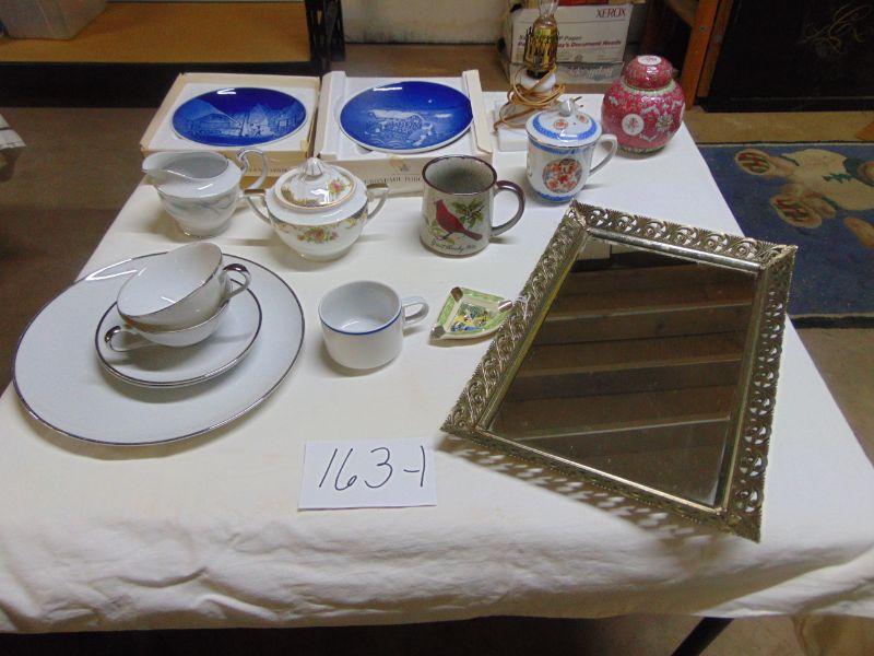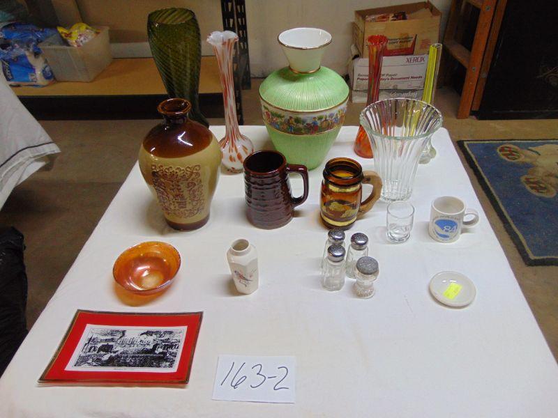 Box 163 -- note two pictures -- Two decorator plates, several vases, Harmony House dinner plate with 2 cups and saucers, oriental container w/lid (raspberry, yellow, green, white), salt/pepper shakers, Valmont china creamer "royal wheat", oriental jug (no stopper), 2 small steins