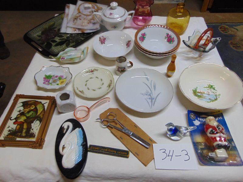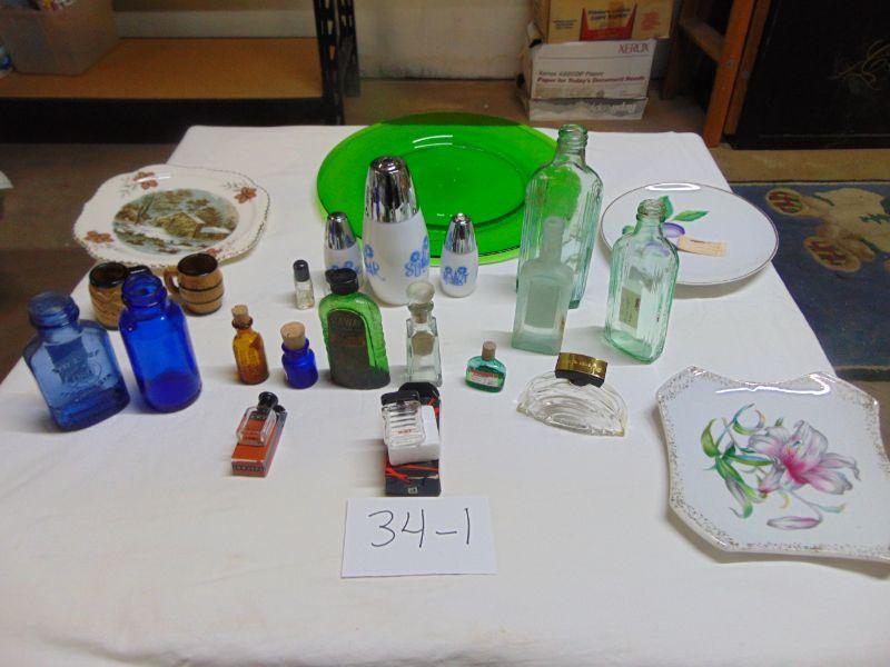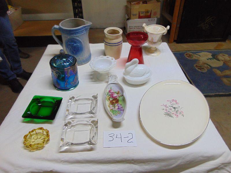 Box 34 -- notice three pictures -- Blue ceramic milk pitcher, 50's-60's style sugar and salt/pepper shakers, body powder dish, ashtrays, small compote, bluish carnival dish with lid, several plates (including Currier and Ives), ash trays