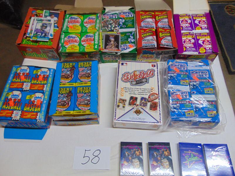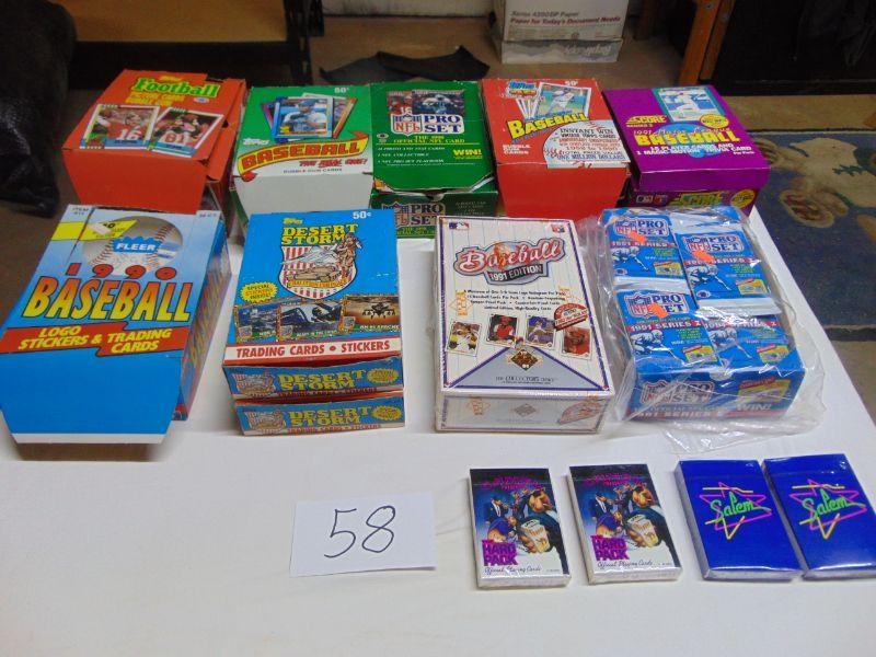 Box 58 -- Topp football and baseball sets, NCL Pro set, 1991 Major League Baseball, 1990 Baseball, 1991 Edition Baseball Collector's Choice, two boxes Desert Storm, 2 Joe Camel playing cards, 2 Salem playing cards, Topp 40 years Baseball