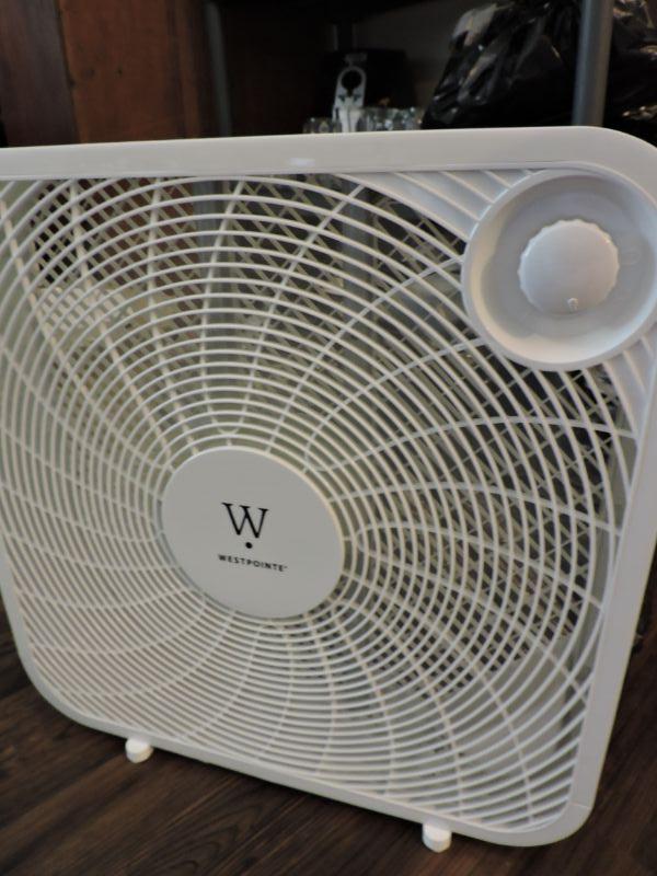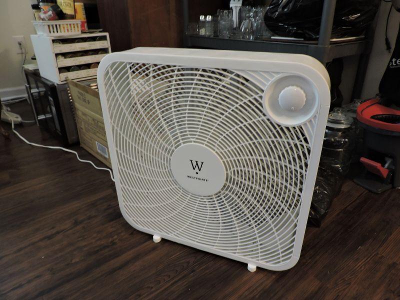 West Pointe box fan. **Please read Terms and Conditions before placing a bid. Pick up is Thursday, August 15, 2019 from 4pm to 7pm or Sunday, August 18 from 11am-2pm in Mullica Hill. All sales are final. All sales are as is, where is. Please review all photos. Any props included in photos are not included in listing. All measurements are approximate.
