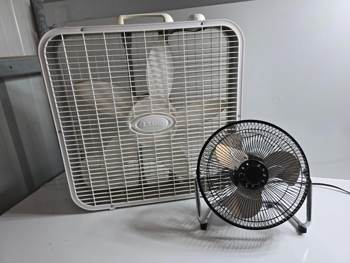 Stay cool with this functional fan duo! Includes a classic white Lasko box fan (20”) and a compact black metal desk fan. Both are tested and working. Great for shop use, garage airflow, or backup cooling indoors.