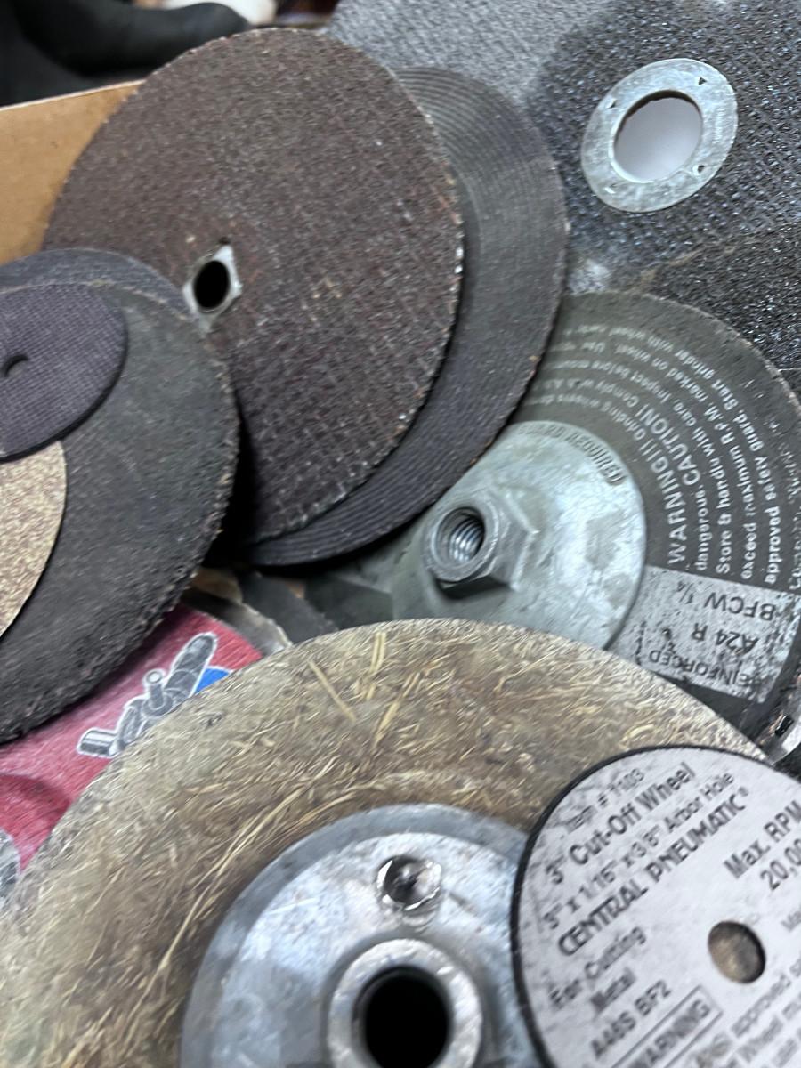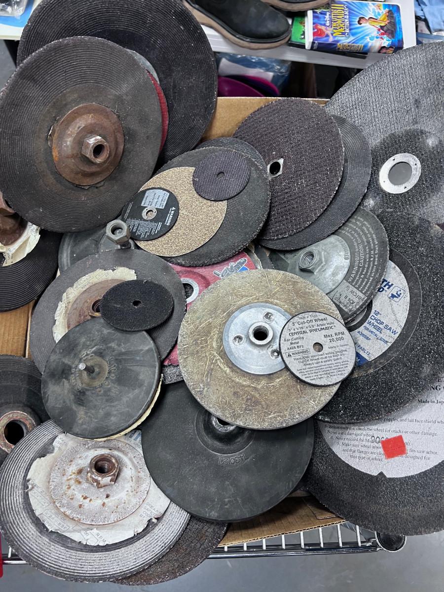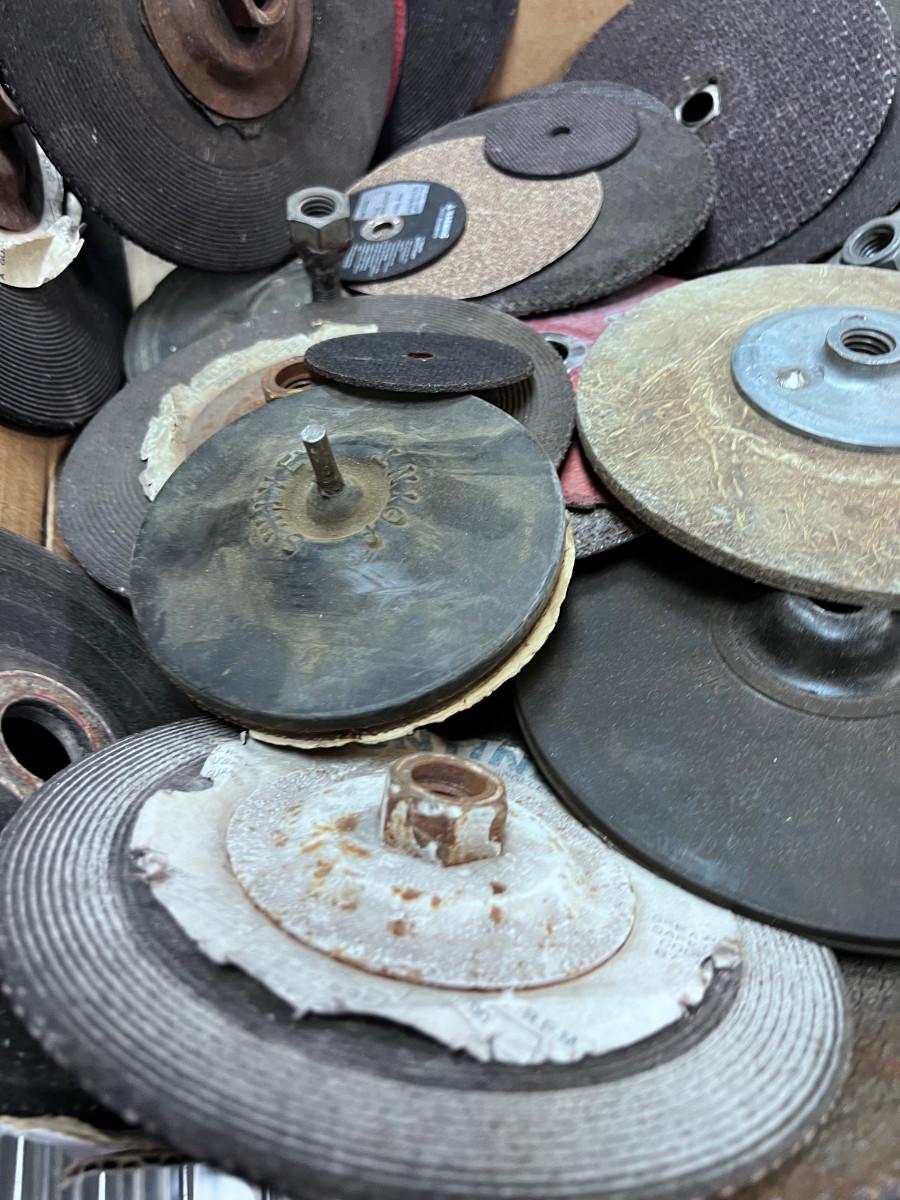 Box full of Abrasive wheels, Cut off Wheels and Sanding Discs.- Mostly New
