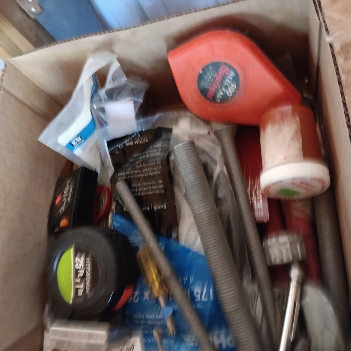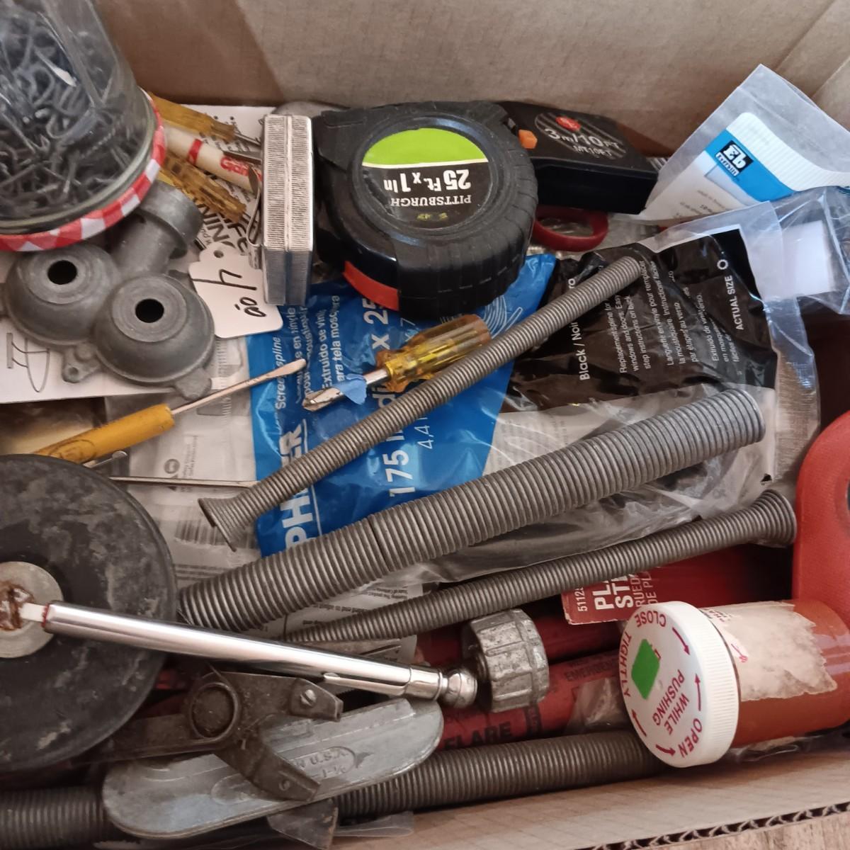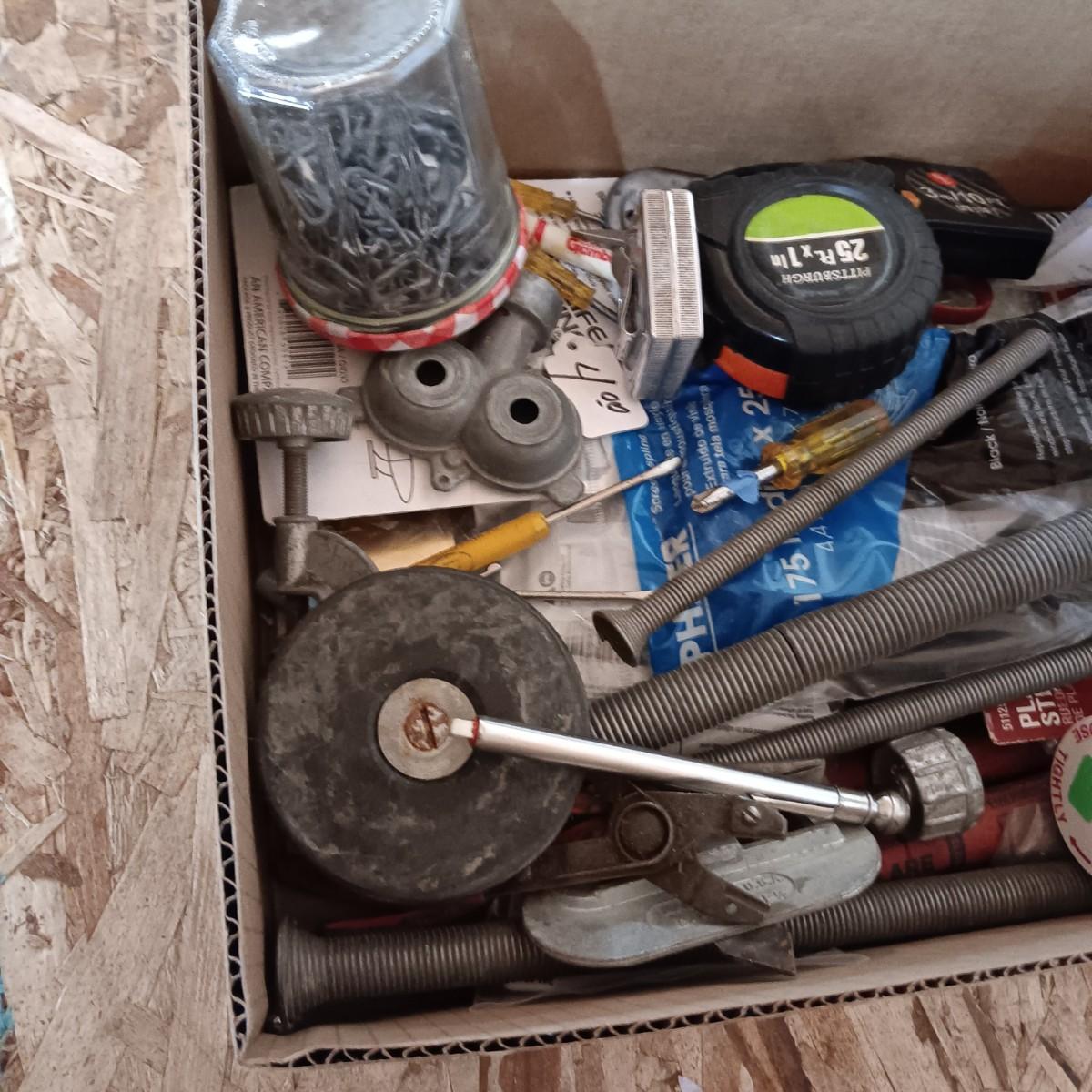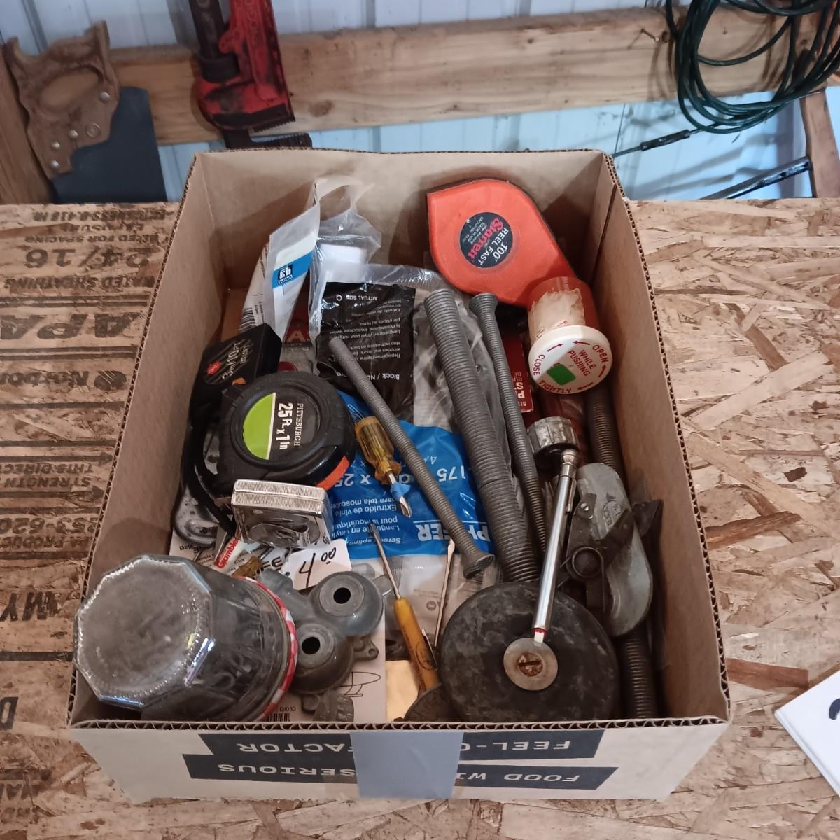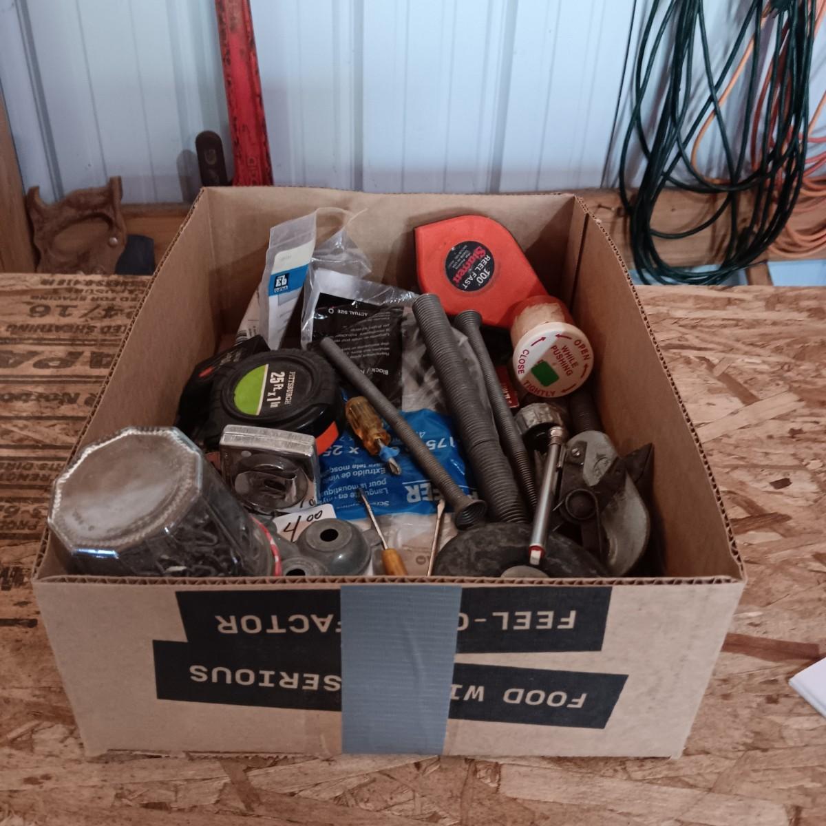 BOX FULL OF MISC HARDWARE, SMALL TOOLS, ETC (3)