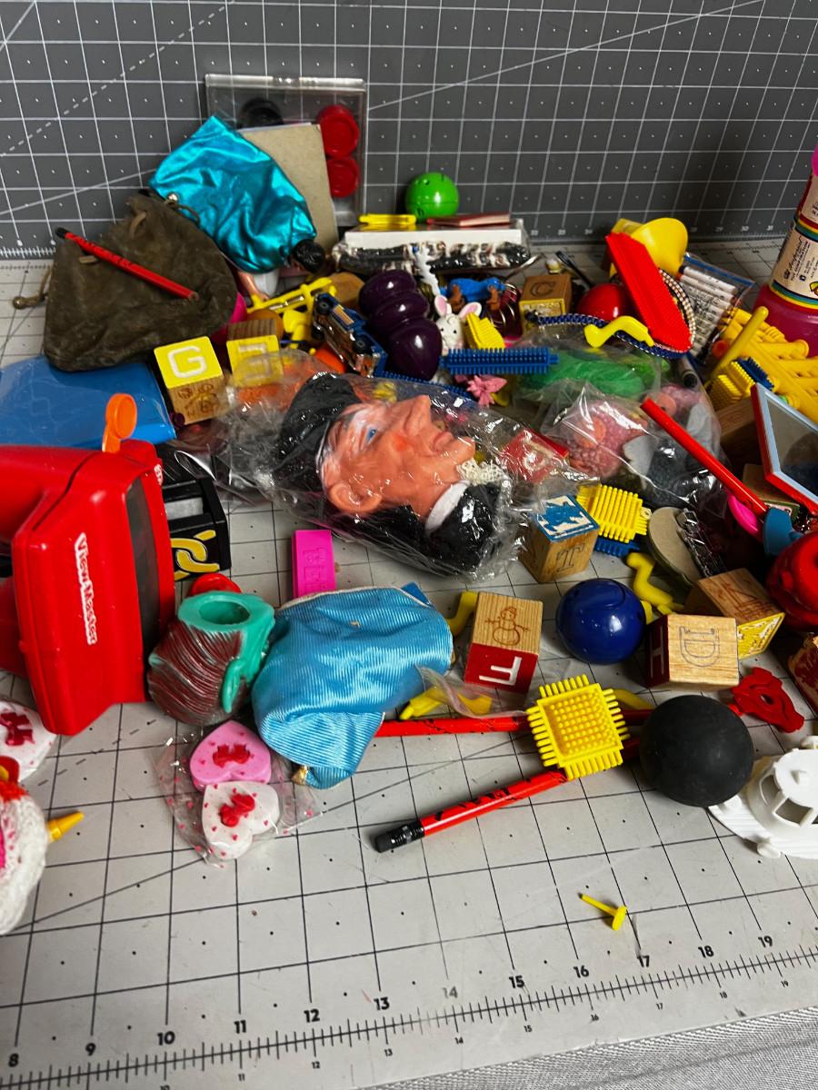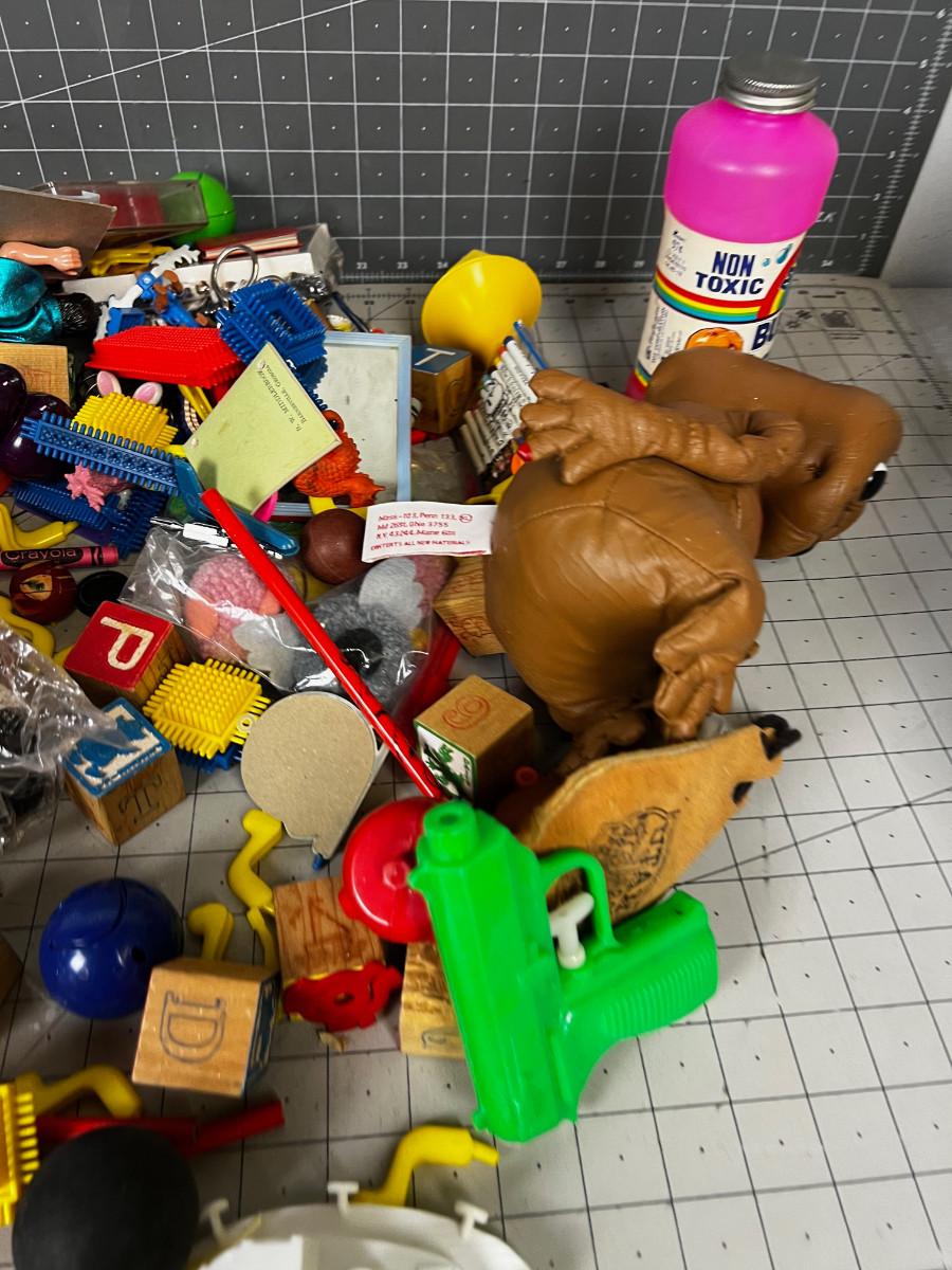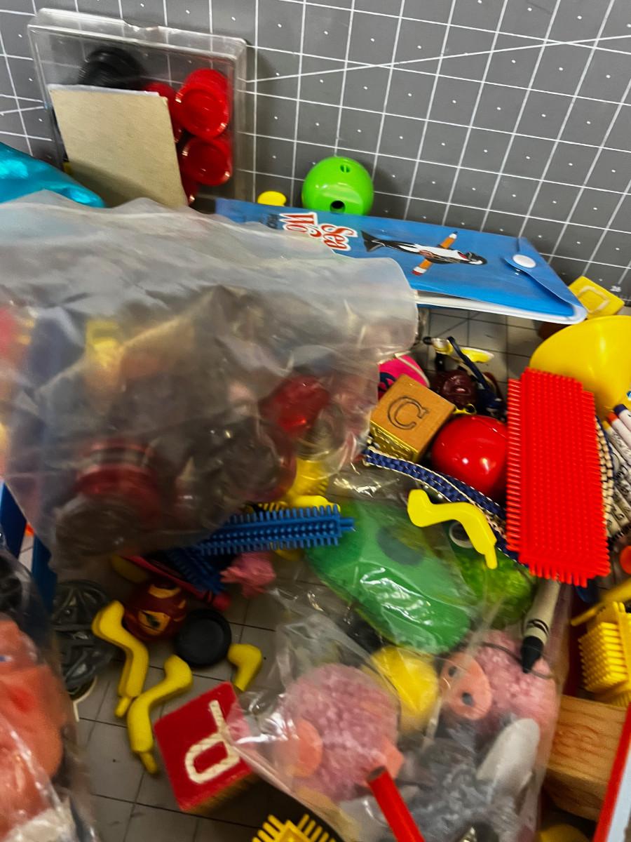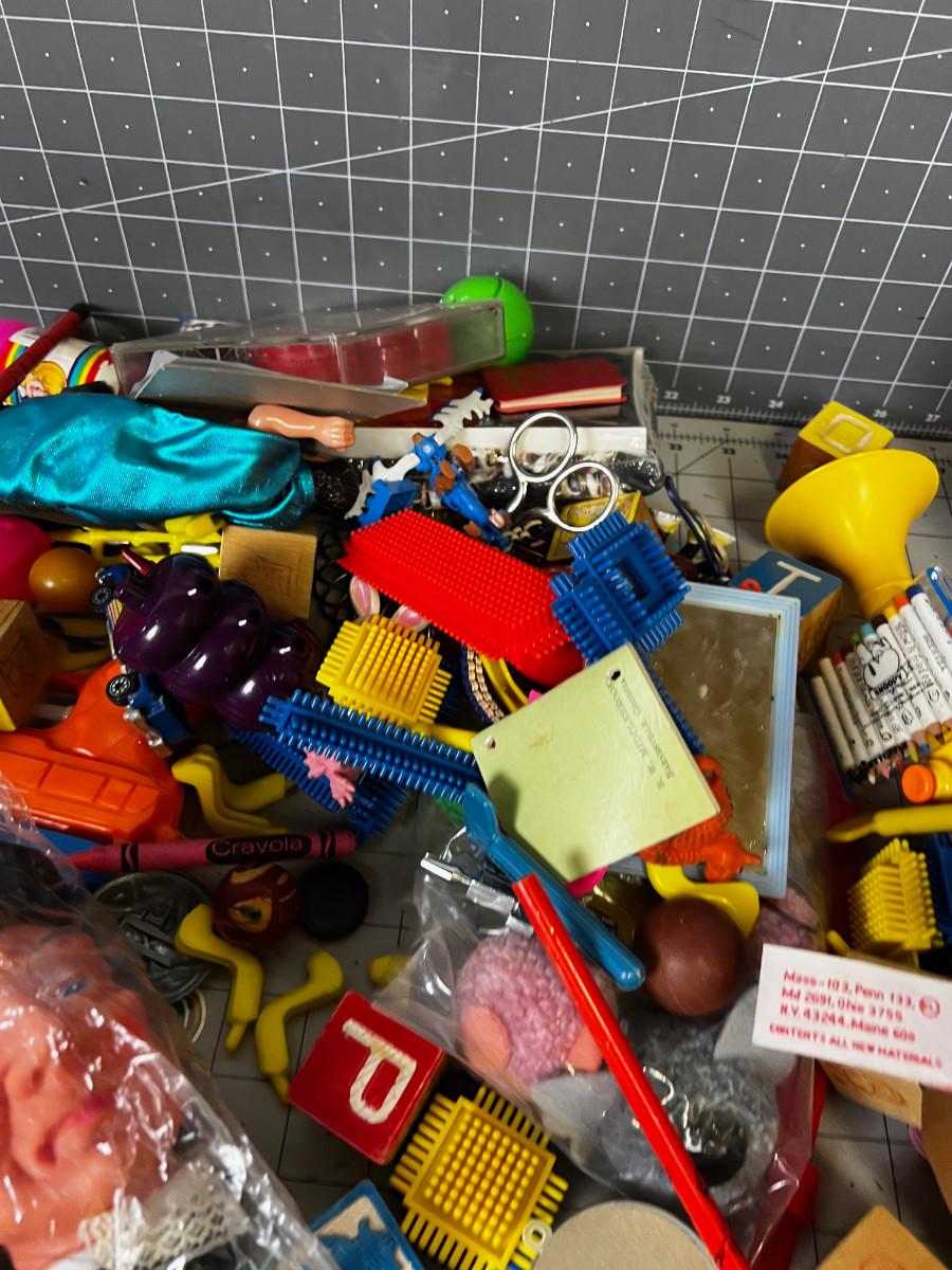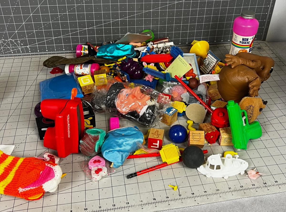 Box full TOYS, Parts and Pieces of Vintage Children's do das, figurines.