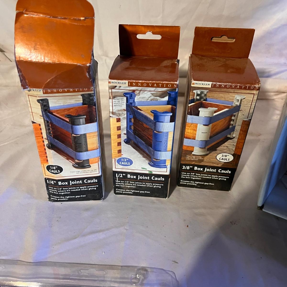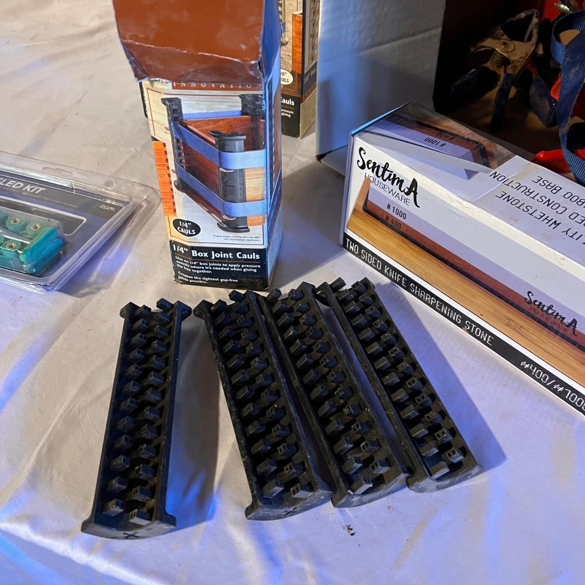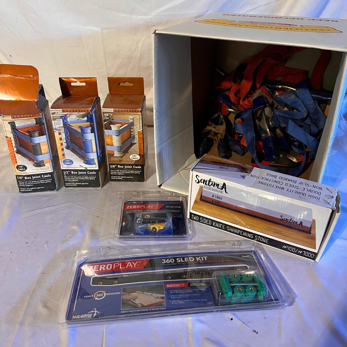 Three sets of box joint cauls (1/4, 1/2 and 3/8), a new in box Sentima two sided knife sharpening stone. Zeroplay miter stop and 360 sled kit that are also new in box. Approximately 6 clamps and a couple of ratchet straps.