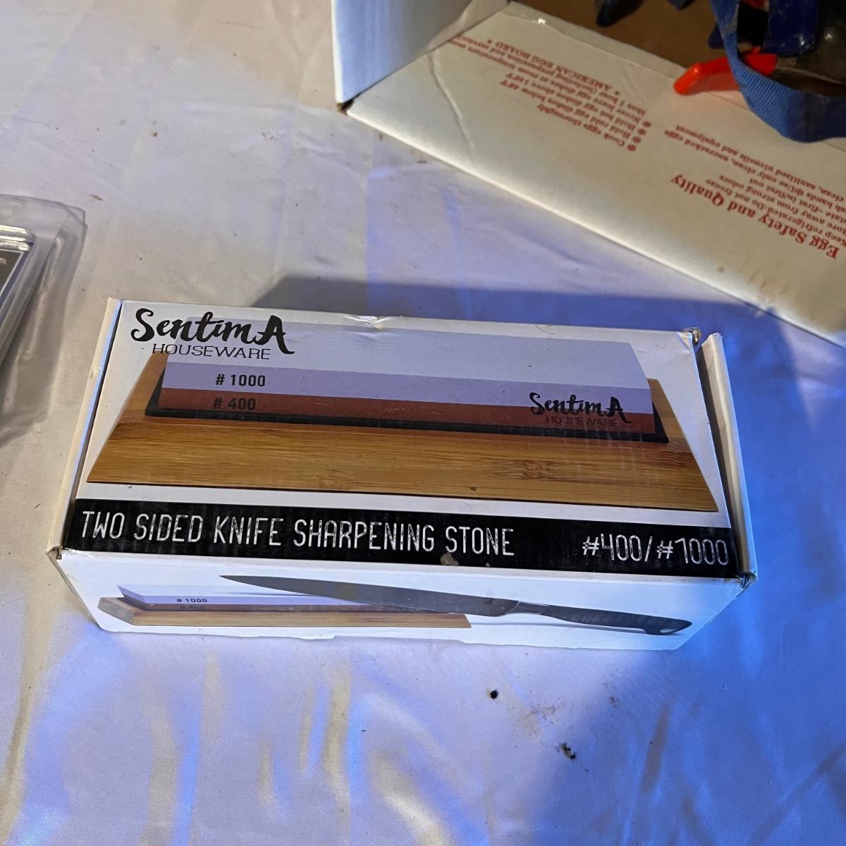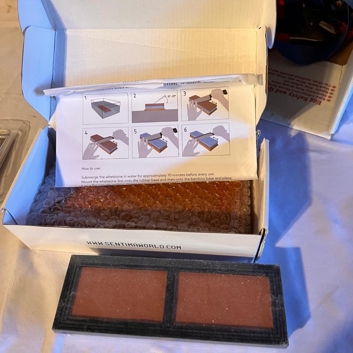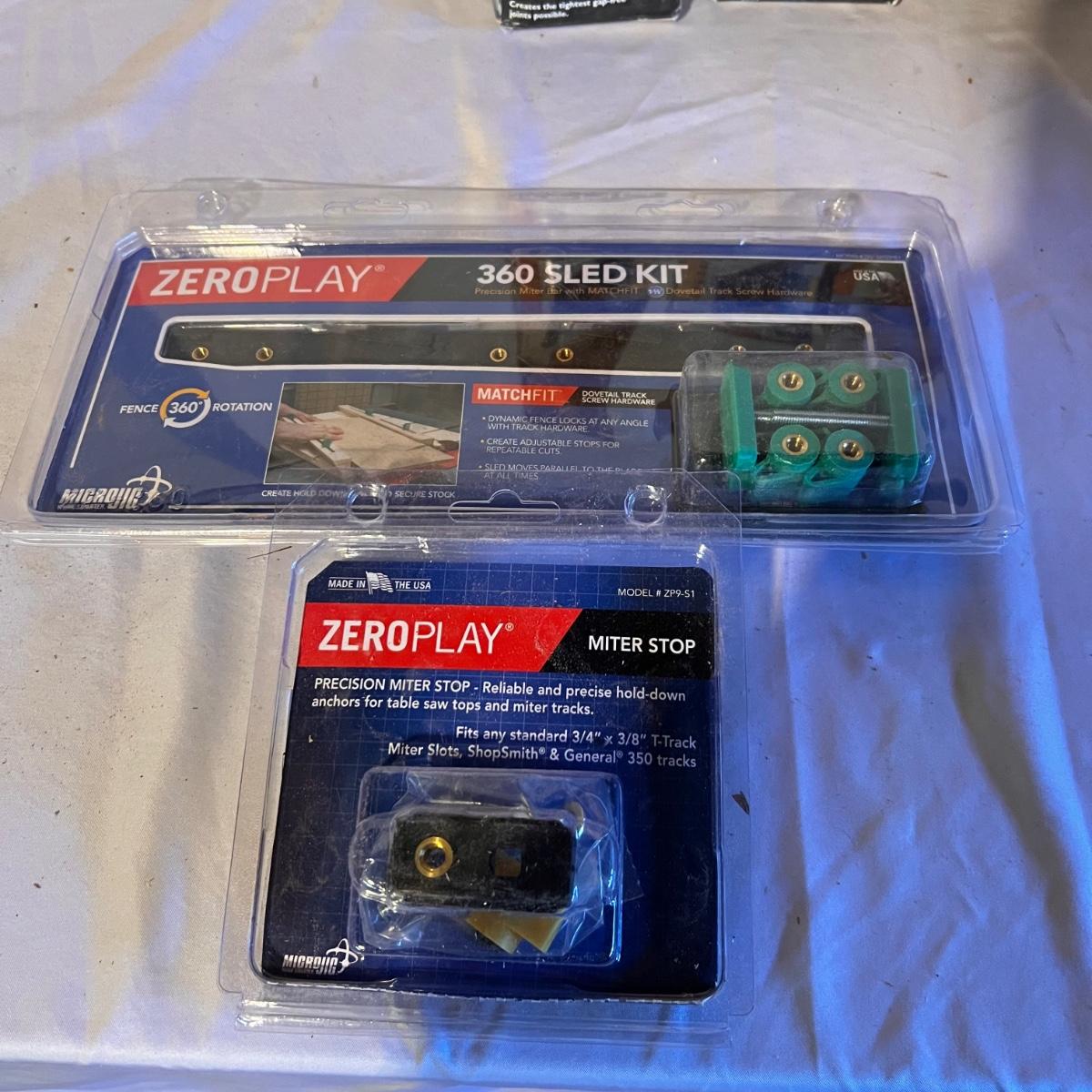 Three sets of box joint cauls (1/4, 1/2 and 3/8), a new in box Sentima two sided knife sharpening stone. Zeroplay miter stop and 360 sled kit that are also new in box. Approximately 6 clamps and a couple of ratchet straps.