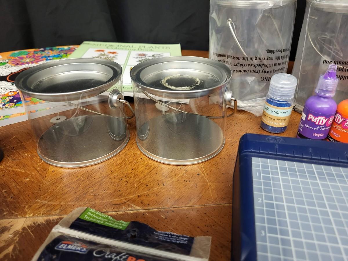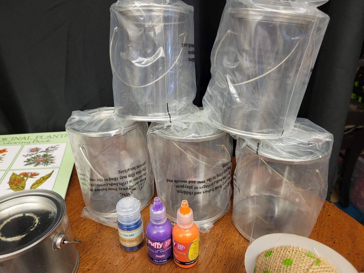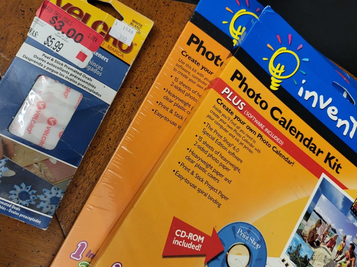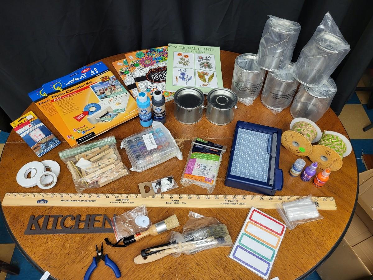Crafting:Box Lot Assorted Crafting Items: Photo Calendar Kit, containers with lids;