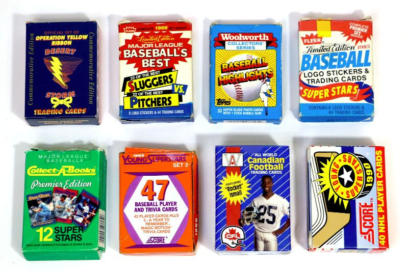 This is a Box Lot and included is everything you see on photos, over 1000 cards including Baseball, Football, Basketball and Hockey, also variety packs, many factory sealed, large size cards, player phot's, mini-jerseys set and more, this is nice Starter collection or dealer resale stock - bidding starts at $1 and with no reserve - Great Buy!