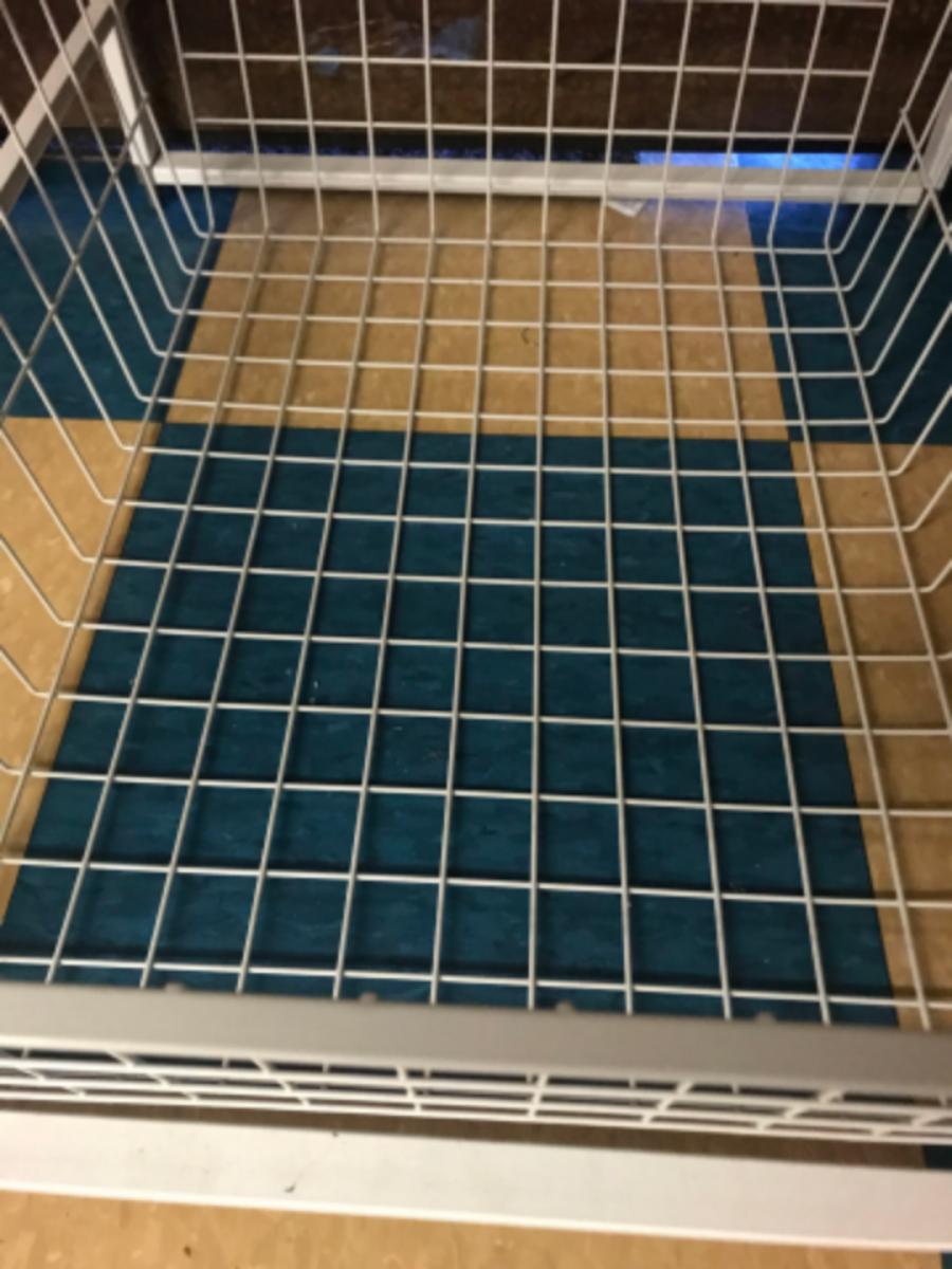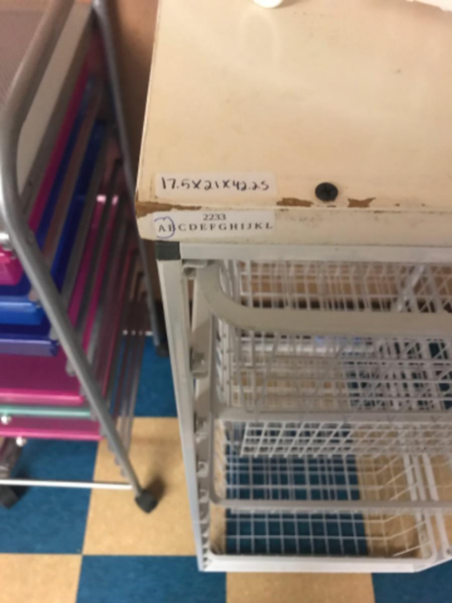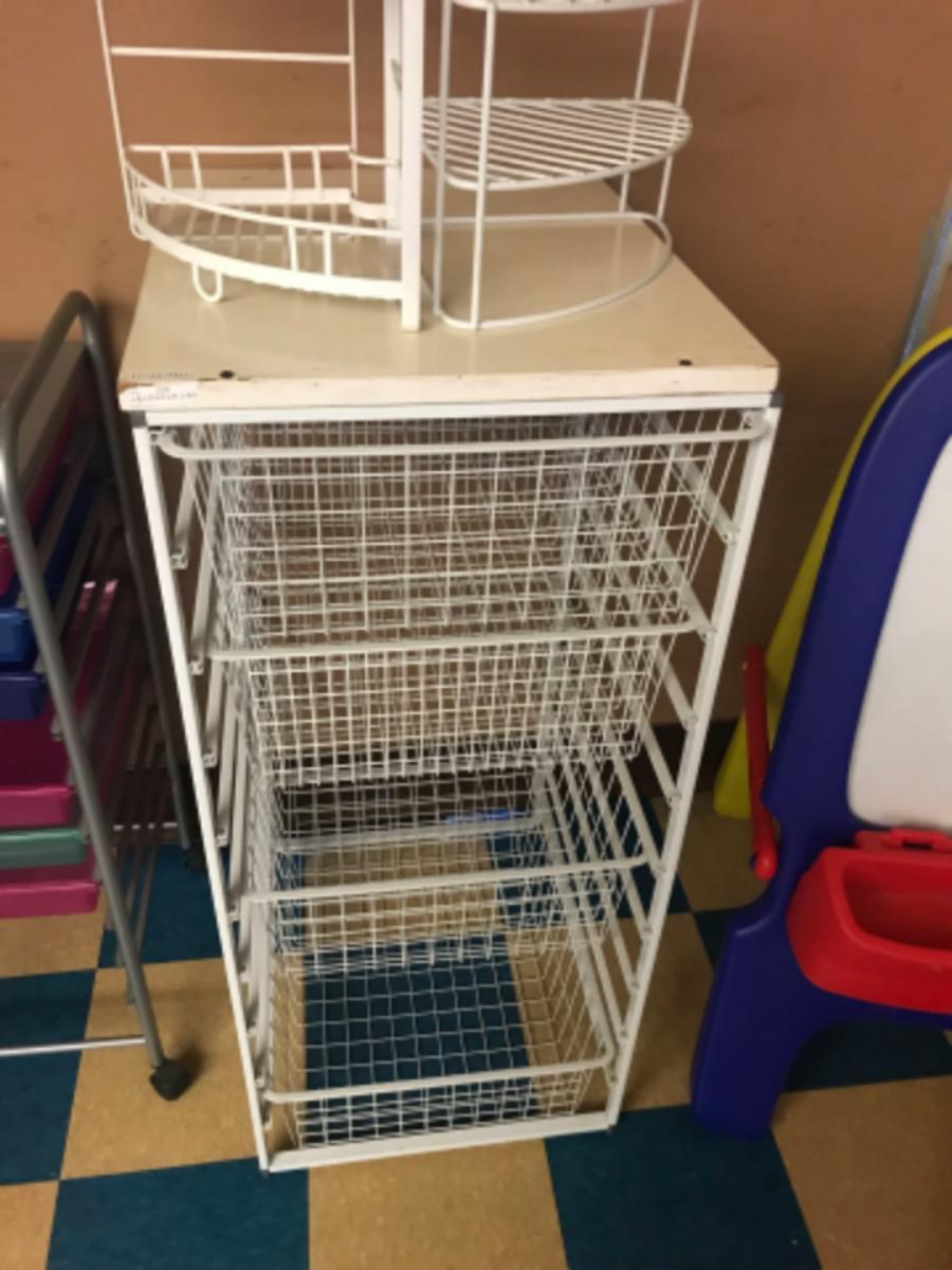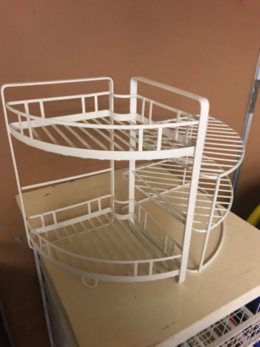 organization storage:Box Lot- Metal, Multi basket rack, has some superficial wear and tear on top that has no effect on function, see photos, as is. Metal shower caddy;17.5" x 21" x 42.25"