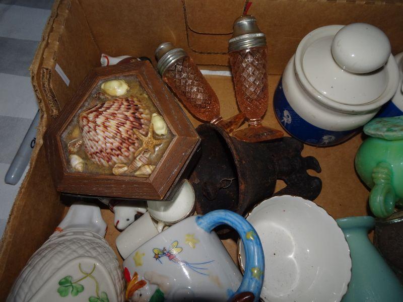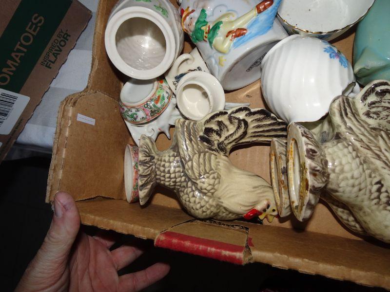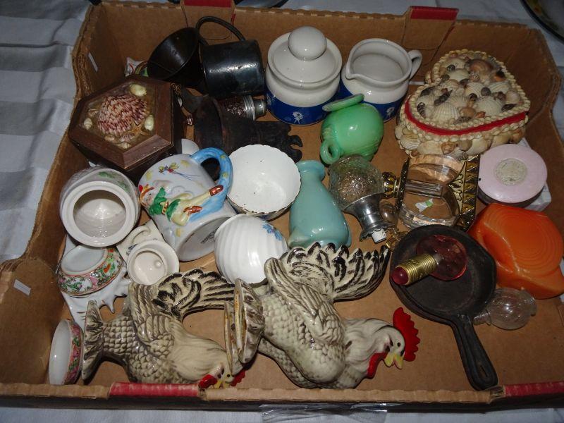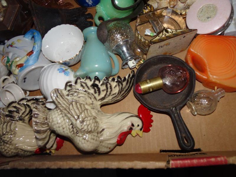 Box Lot of Collectibles - All one Money , Seashell heart, Roosters, Baby Cups, Lots of collectibles