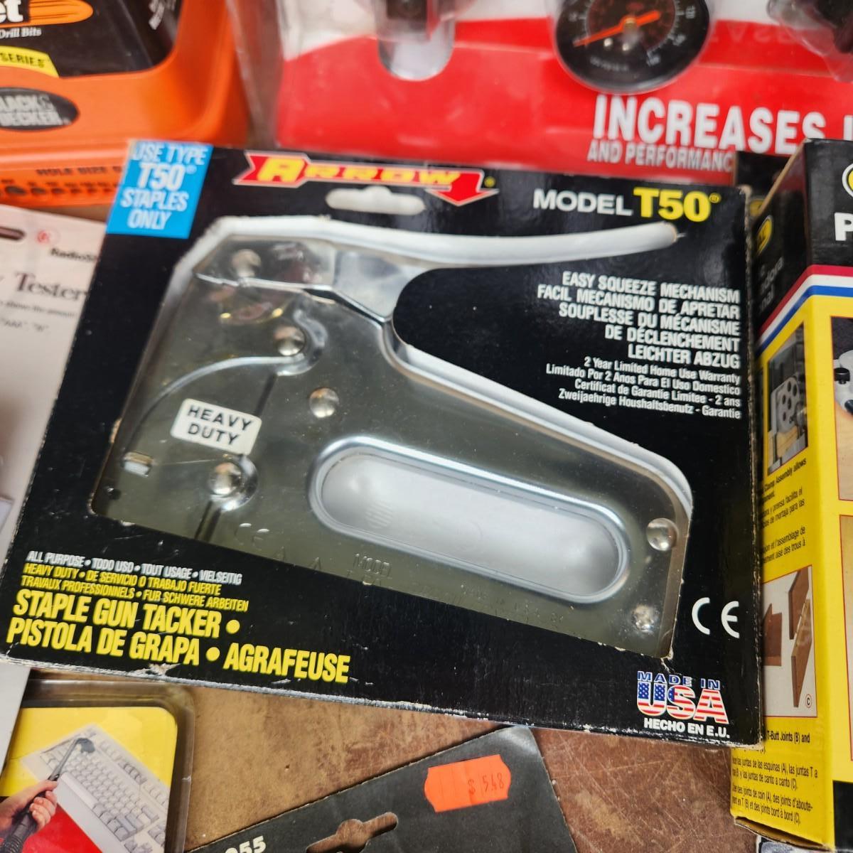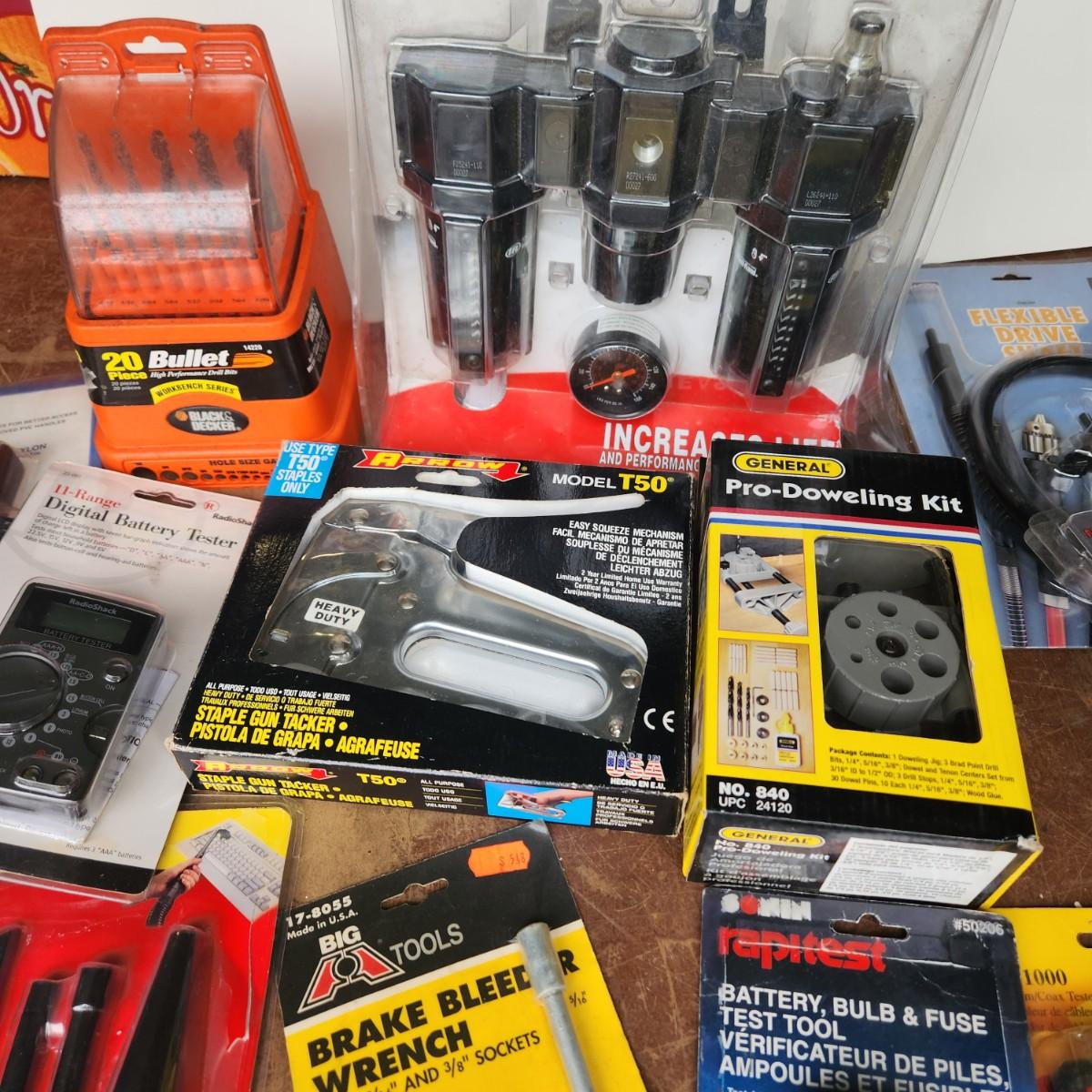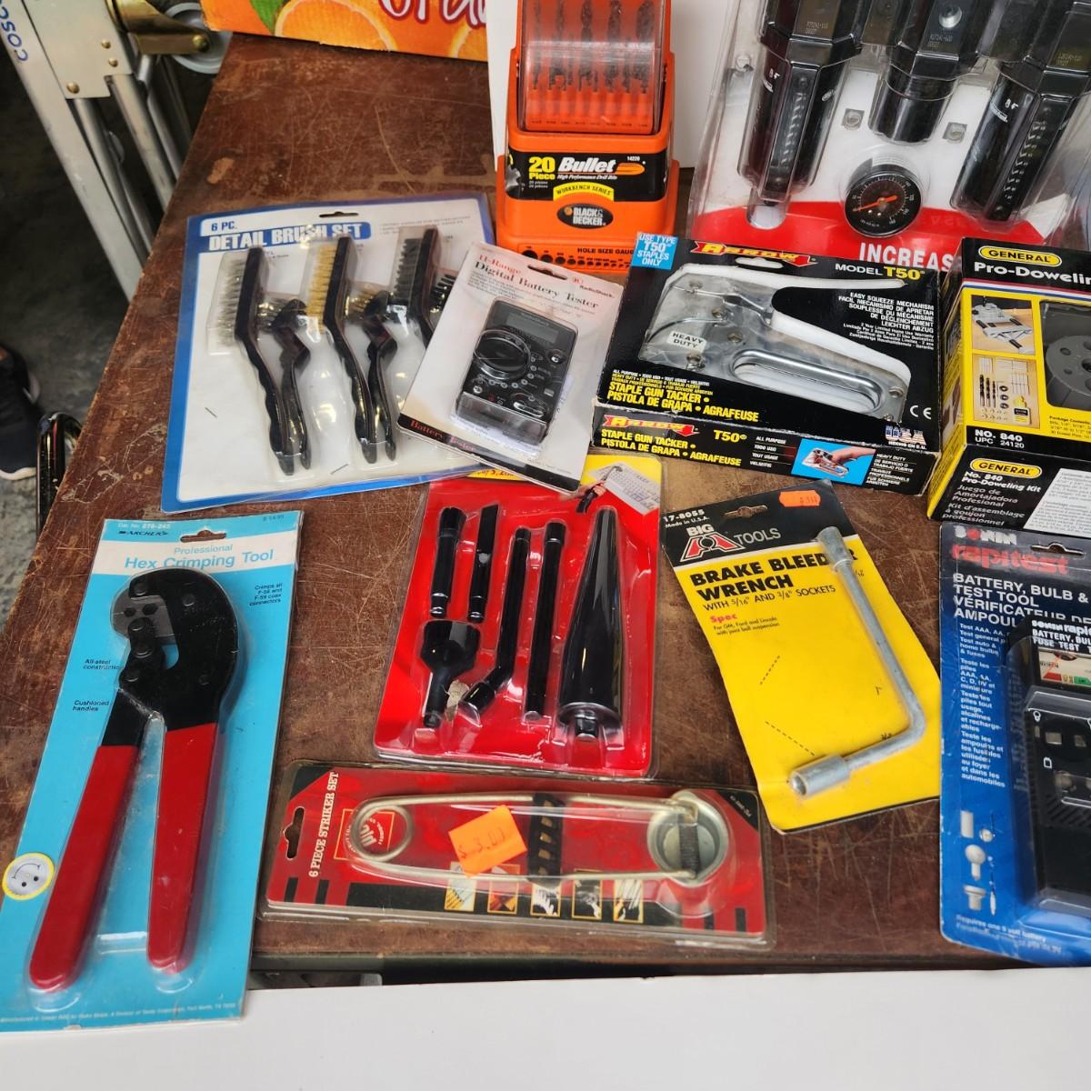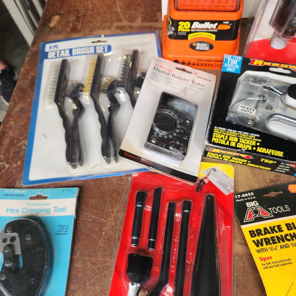 Box lot of New Tools in original package Dowrling Kit, Battery testers , Arrow T50 Stapler Black And Decker Drill Bits Hex Crimping tool